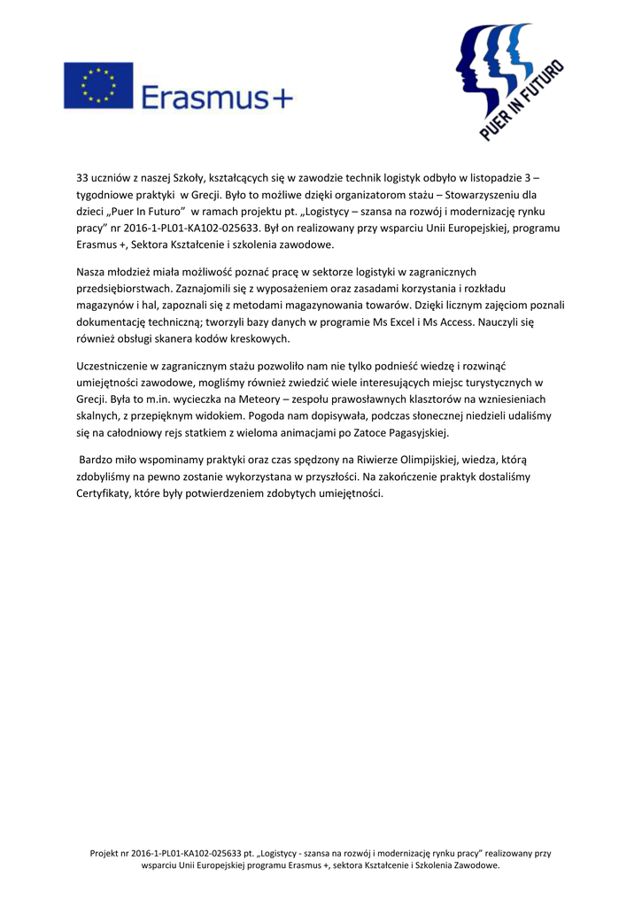 33 uczniów z naszej Szkoły, kształcących się w zawodzie technik logistyk odbyło w listopadzie 3 – tygodniowe praktyki w Grecji. Było to możliwe dzięki organizatorom stażu – Stowarzyszeniu dla dzieci „Puer In Futuro” w ramach projektu pt. „Logistycy – szansa na rozwój i modernizację rynku pracy” nr 2016-1-PL01-KA102-025633. Był on realizowany przy wsparciu Unii Europejskiej, programu Erasmus +, Sektora Kształcenie i szkolenia zawodowe. Nasza młodzież miała możliwość poznać pracę w sektorze logistyki w zagranicznych przedsiębiorstwach. Zaznajomili się z wyposażeniem oraz zasadami korzystania i rozkładu magazynów i hal, zapoznali się z metodami magazynowania towarów. Dzięki licznym zajęciom poznali dokumentację techniczną; tworzyli bazy danych w programie Ms Excel i Ms Access. Nauczyli się również obsługi skanera kodów kreskowych. Uczestniczenie w zagranicznym stażu pozwoliło nam nie tylko podnieść wiedzę i rozwinąć umiejętności zawodowe, mogliśmy również zwiedzić wiele interesujących miejsc turystycznych w Grecji. Była to m.in. wycieczka na Meteory – zespołu prawosławnych klasztorów na wzniesieniach skalnych, z przepięknym widokiem. Pogoda nam dopisywała, podczas słonecznej niedzieli udaliśmy się na całodniowy rejs statkiem z wieloma animacjami po Zatoce Pagasyjskiej. Bardzo miło wspominamy praktyki oraz czas spędzony na Riwierze Olimpijskiej, wiedza, którą zdobyliśmy na pewno zostanie wykorzystana w przyszłości. Na zakończenie praktyk dostaliśmy Certyfikaty, które były potwierdzeniem zdobytych umiejętności. Projekt nr 2016-1-PL01-KA102-025633 pt. „Logistycy - szansa na rozwój i modernizację rynku pracy” realizowany przy wsparciu Unii Europejskiej programu Erasmus +, sektora Kształcenie i Szkolenia Zawodowe.