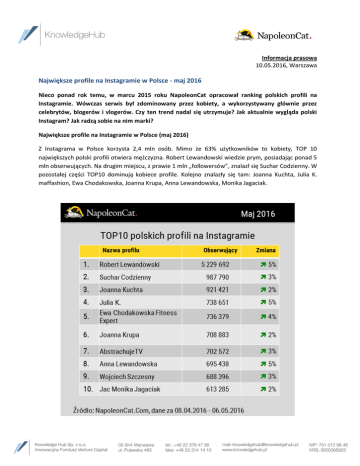 Informacja prasowa 10.05.2016, Warszawa Największe profile na Instagramie w Polsce - maj 2016 Nieco ponad rok temu, w marcu 2015 roku NapoleonCat opracował ranking polskich profili na Instagramie. Wówczas serwis był zdominowany przez kobiety, a wykorzystywany głównie przez celebrytów, blogerów i vlogerów. Czy ten trend nadal się utrzymuje? Jak aktualnie wygląda polski Instagram? Jak radzą sobie na nim marki? Największe profile na Instagramie w Polsce (maj 2016) Z Instagrama w Polsce korzysta 2,4 mln osób. Mimo że 63% użytkowników to kobiety, TOP 10 największych polski profili otwiera mężczyzna. Robert Lewandowski wiedzie prym, posiadając ponad 5 mln obserwujących. Na drugim miejscu, z prawie 1 mln „followersów”, znalazł się Suchar Codzienny. W pozostałej części TOP10 dominują kobiece profile. Kolejno znalazły się tam: Joanna Kuchta, Julia K. maffashion, Ewa Chodakowska, Joanna Krupa, Anna Lewandowska, Monika Jagaciak. Największe profile na Instagramie w Polce w kategorii BLOG & VLOG W kategorii blogi i vlogi największe zainteresowanie przyciągają: Suchar Codzienny, Julia K. - maffashion, AbstrachujeTV oraz Anna Lewandowska. W tym miejscu należy uściślić, że profil Anny Lewandowskiej umieściliśmy w tej właśnie kategorii, podczas gdy profil Ewy Chodakowskiej został przez nas przypisany do kategorii „osoby”. Największe profile na Instagramie w Polce w kategorii OSOBA Największe profile na Instagramie w Polce w kategorii ORGANIZACJE Kategoria “organizacje” została zdominowana przez kluby i drużyny sportowe. Profile o tematyce sportowej wykazują największą aktywność, ale też gromadzą wokół siebie najwięcej zainteresowanych. Potencjał Instagrama dostrzegły również fundacje i firmy NGO, jak również placówki kulturalne (np. muzea) i oświatowe (szkoły i uczelnie wyższe). Z coraz większym powodzeniem działają również profile poszczególnych miast, czy różnego rodzaju wydarzeń (np. Woodstock) oraz inicjatyw lokalnych (np. Restaurant Week, Dziewczyńskie Poranki, Krakow Festival Office). Największe profile na Instagramie w Polce w kategorii MARKI Marki wciąż radzą sobie na Instagramie nieco słabiej niż celebryci czy osobowości. Największą popularnością cieszą się brandy modowe – odzieżowe i kosmetyczne. Jednak to wcale nie te mainstreamowe gromadzą najwięcej zainteresowanych. W TOP10 znalazły się LOCAL HEROES, DeeZee Shoes, SUGARPILLS, GOD SAVE QUEENS, PLNY LALA, wyprzedzając choćby tak znane marki, jak Sinsay, Mohito czy brandy sportowe: New Balance Poland, Adidas Poland, Reebok Classic. Drugą popularną branżą na Instagramie są media – stacje i programy telewizyjne, stacje i kanały radiowe oraz czasopisma. Jak efektywniej wykorzystać Instagram? O tym, jak marki - również z sektora MSP - mogą wykorzystać Instagram do angażowania, a w konsekwencji pozyskiwania klientów, eksperci NapoleonCat opowiedzą w trakcie zaplanowanego na 17 maja szkolenia. Zachęcamy do zapisów na stronie http://17-05-2016-zdobywaj-klientow-na-facebookuinstagramie.evenea.pl/ Kontakt dla mediów: Katarzyna Kowalczyk Marketing Officer NapoleonCat i Catvertiser [email protected] kom.: +48 667 500 155 Robert Rymuszka Junior PR Specialist KnowledgeHub [email protected] kom.: +48 690 868 599