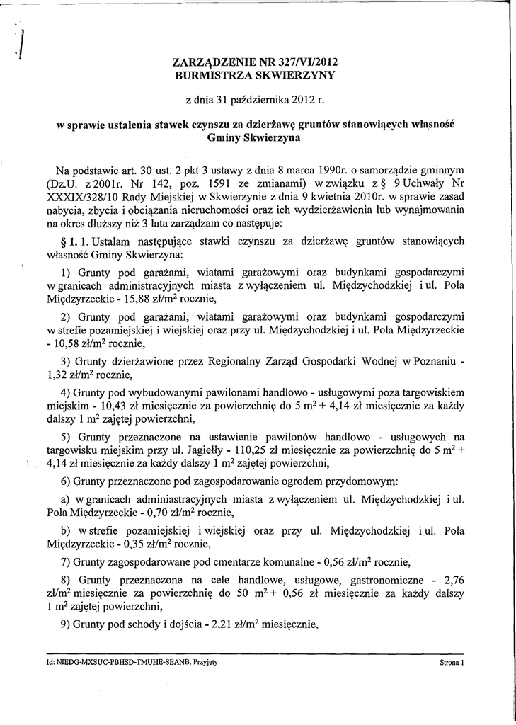 ·1 ZARZĄDZENIE NR 327NI/20l2 BURMISTRZA SKWIERZYNY z dnia 31 października 2012 r. w sprawie ustalenia stawek czynszu za dzierżawę gruntów Gminy Skwierzyna stanowiącychwłasność Na podstawie art. 30 ust. 2 pkt 3 ustawy z dnia 8 marca 1990r. o samorządzie gminnym (Dz.U. z 2001r. Nr 142, poz. 1591 ze zmianami) w związku z § 9 Uchwały Nr XXXIX/328/1 Rady Miejskiej w Skwierzynie z dnia 9 kwietnia 201Or. w sprawie zasad nabycia, zbycia i obciążania nieruchomości oraz ich wydzierżawienia lub wynajmowania na okres dłuższy niż 3 lata zarządzam co następuje: ° § 1. 1. Ustalam następujące stawki czynszu za własność Gminy Skwierzyna: dzierżawę gruntów stanowiących 1) Grunty pod garażami, wiatami garażowymi oraz budynkami gospodarczymi w granicach administracyjnych miasta z wyłączeniem ul. Międzychodzkiej i ul. Pola Międzyrzeckie - 15,88 zł/m 2 rocznie, 2) Grunty pod garażami, wiatami garażowymi oraz budynkami gospodarczymi w strefie pozamiejskiej i wiejskiej oraz przy ul. Międzychodzkiej i ul. Pola Międzyrzeckie - 10,58 zł/m? rocznie, 3) Grunty dzierżawione przez Regionalny 1,32 zł/m2 rocznie, Zarząd Gospodarki Wodnej w Poznaniu - 4) Grunty pod wybudowanymi pawilonami handlowo - usługowymi poza targowiskiem miejskim - 10,43 zł miesięcznie za powierzchnię do 5 m2 + 4,14 zł miesięcznie za każdy dalszy 1 m2 zajętej powierzchni, 5) Grunty przeznaczone na ustawienie pawilonów handlowo - usługowych na targowisku miejskim przy ul. Jagiełły - 110,25 zł miesięcznie za powierzchnię do 5 m2 + 4,14 zł miesięcznie za każdy dalszy 1 m 2 zajętej powierzchni, 6) Grunty przeznaczone pod zagospodarowanie ogrodem przydomowym: a) w granicach adminiastracyjnych miasta z wyłączeniem ul. Pola Międzyrzeckie - 0,70 zł/m? rocznie, b) w strefie pozamiejskiej i wiejskiej oraz przy ul. Międzyrzeckie - 0,35 zł/m? rocznie, Międzychodzkiej Międzychodzkiej 7) Grunty zagospodarowane pod cmentarze komunalne - 0,56 zł/m? i ul. i ul. Pola rocznie, 8) Grunty przeznaczone na cele handlowe, usługowe, gastronomiczne - 2,76 zł/m? miesięcznie za powierzchnię do 50 m2 + 0,56 zł miesięcznie za każdy dalszy 1 m2 zajętej powierzchni, 9) Grunty pod schody i dojścia - 2,21 Id: NIEDG-MXSUC-PBHSD-TMUHE-SEANB. Przyjety zł/m'' miesięcznie, Strona l 10) Grunty przeznaczone na cele reklamowe - 33,08 zł/m? powierzchni reklamy miesięcznie, z wyłączeniem reklam umieszczonych w pasie drogowym, 11) Grunty przeznaczone na cele składowe i magazynowe - 0,44 zł/m2 miesięcznie. działalność rozrywkową: 12) Grunty przeznaczone na - do 1000 m2 - 170,00 zł dziennie, - powyżej 1000 m2 - 260,00 dziennie, 13) Grunty pod uprawę: - o pow. do 2.000 m2 - 0,15 zł/m2 rocznie, - o pow. od 2.001 m2 do 5.000 m2 - 0,06 zł/m2 rocznie, - o pow. powyżej 0,50 ha - 99,23 14) Grunty pod użytki zł/ha rocznie, zielone: - o pow. do 5.000 m2 - 0,06 zł/m2 rocznie, - o pow. powyżej 0,50 ha - 66,15 zł/ha rocznie. 15) Grunty przeznaczone na cele inne niż wymienione - 6,62 zł/m2 rocznie, 2. Ustalam opłatę za korzystanie z gruntu bez tytułu prawnego w wysokości 150% utraconego czynszu według stawek wymienionych w pkt 1. 3. Ustalam termin wnoszenia czynszu za dzierżawę gruntu: 1) rocznego - do 31 marca każdego roku z góry za dany rok, 2) miesięcznego - do 10 dnia 3) dziennego - do dnia każdego miesiąca z góry za dany miesiąc, rozpoczęcia dzierżawy. 4. W uzasadnionych przypadkach, na wniosek odstąpienia od ustalonych stawek czynszu. Dzierżawcy dopuszcza się możliwość § 2. W przypadku, gdy czynsze i opłaty naliczone na podstawie niniejszego zarządzenia stanowiłyby kwotę niższą niż 15,00 zł w przyjętym okresie rozliczeniowym, czynsz lub opłatę ustala się w wysokości 15,00 zł. § 3. Do ustalonych stawek czynszu należy doliczyć należny podatek VAT zgodnie z ustawą z dnia 11 marca 2004r. o podatku od towarów i usług (Dz. U. z 201lr., Nr 177, poz. 1054) § 4. Traci moc zarządzenie Nr 184/VI/20 11 Burmistrza Skwierzyny z dnia 30 grudnia 20llr. w sprawie: ustalenia stawek czynszu za dzierżawę gruntów stanowiących własność Gminy Skwierzyna. § 5. Zarządzenie wchodzi w życie z dniem podjęcia, z tym zawartych obowiązuje od dnia 1 stycznia 2013r. Id: NIEDG-MXSUC-PBH8D-TMUHE-SEANB. Przyjety że do umów dotychczas Strona 2 / Burmistrz ~\ierzyny Tomasz'~. \\".tros \ ' \\ ~ Id: NIEDG-MXSUC-PBHSD-TMUHE-SEANB. Przyjety Strona 3