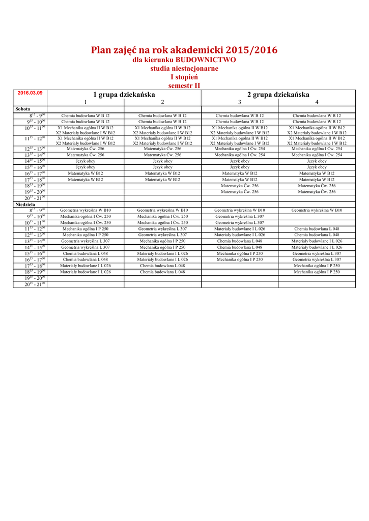 Plan zajęć na rok akademicki 2015/2016 dla kierunku BUDOWNICTWO studia niestacjonarne I stopień semestr II 1 grupa dziekańska 2016.03.09 Sobota 815 - 900 915 - 1000 1015 - 1100 1115 - 1200 1215 - 1300 1315 - 1400 1415 - 1500 1515 - 1600 1615 - 1700 1715 - 1800 1815 - 1900 1915 - 2000 2015 - 2100 Niedziela 815 - 900 915 - 1000 1015 - 1100 1115 - 1200 1215 - 1300 1315 - 1400 1415 - 1500 1515 - 1600 1615 - 1700 1715 - 1800 1815 - 1900 1915 - 2000 2015 - 2100 2 grupa dziekańska 1 2 3 4 Chemia budowlana W B 12 Chemia budowlana W B 12 X1 Mechanika ogólna II W B12 X2 Materiały budowlane I W B12 X1 Mechanika ogólna II W B12 X2 Materiały budowlane I W B12 Matematyka Ćw. 256 Matematyka Ćw. 256 Język obcy Język obcy Matematyka W B12 Matematyka W B12 Chemia budowlana W B 12 Chemia budowlana W B 12 X1 Mechanika ogólna II W B12 X2 Materiały budowlane I W B12 X1 Mechanika ogólna II W B12 X2 Materiały budowlane I W B12 Matematyka Ćw. 256 Matematyka Ćw. 256 Język obcy Język obcy Matematyka W B12 Matematyka W B12 Chemia budowlana W B 12 Chemia budowlana W B 12 X1 Mechanika ogólna II W B12 X2 Materiały budowlane I W B12 X1 Mechanika ogólna II W B12 X2 Materiały budowlane I W B12 Mechanika ogólna I Ćw. 254 Mechanika ogólna I Ćw. 254 Język obcy Język obcy Matematyka W B12 Matematyka W B12 Matematyka Ćw. 256 Matematyka Ćw. 256 Chemia budowlana W B 12 Chemia budowlana W B 12 X1 Mechanika ogólna II W B12 X2 Materiały budowlane I W B12 X1 Mechanika ogólna II W B12 X2 Materiały budowlane I W B12 Mechanika ogólna I Ćw. 254 Mechanika ogólna I Ćw. 254 Język obcy Język obcy Matematyka W B12 Matematyka W B12 Matematyka Ćw. 256 Matematyka Ćw. 256 Geometria wykreślna W B10 Mechanika ogólna I Ćw. 250 Mechanika ogólna I Ćw. 250 Mechanika ogólna I P 250 Mechanika ogólna I P 250 Geometria wykreślna L 307 Geometria wykreślna L 307 Chemia budowlana L 048 Chemia budowlana L 048 Materiały budowlane I L 026 Materiały budowlane I L 026 Geometria wykreślna W B10 Mechanika ogólna I Ćw. 250 Mechanika ogólna I Ćw. 250 Geometria wykreślna L 307 Geometria wykreślna L 307 Mechanika ogólna I P 250 Mechanika ogólna I P 250 Materiały budowlane I L 026 Materiały budowlane I L 026 Chemia budowlana L 048 Chemia budowlana L 048 Geometria wykreślna W B10 Geometria wykreślna L 307 Geometria wykreślna L 307 Materiały budowlane I L 026 Materiały budowlane I L 026 Chemia budowlana L 048 Chemia budowlana L 048 Mechanika ogólna I P 250 Mechanika ogólna I P 250 Geometria wykreślna W B10 Chemia budowlana L 048 Chemia budowlana L 048 Materiały budowlane I L 026 Materiały budowlane I L 026 Geometria wykreślna L 307 Geometria wykreślna L 307 Mechanika ogólna I P 250 Mechanika ogólna I P 250 Plan zajęć na rok akademicki 2015/2016 dla kierunku BUDOWNICTWO studia niestacjonarne I stopień semestr IV 1 grupa dziekańska Sobota 815 - 900 915 - 1000 1015 - 1100 1115 - 1200 1215 - 1300 1315 - 1400 1415 - 1500 1515 - 1600 1615 - 1700 1715 - 1800 1815 - 1900 1915 - 2000 2015 - 2100 Niedziela 815 - 900 915 - 1000 1015 - 1100 1115 - 1200 1215 - 1300 1315 - 1400 1415 - 1500 1515 - 1600 1615 - 1700 1715 - 1800 1815 - 1900 1915 - 2000 2015 - 2100 1 2 Bud. ogólne II i konstr. drewn . W 151 Bud. ogólne II i konstr. drewn. W 151 X1 Wytrzymałość materiałów II W B10 X2 Mechanika gruntów i fund. W B 10 X1 Wytrzymałość materiałów II W B10 X2 Mechanika gruntów i fund. W B10 Język obcy Język obcy Bud. ogólne II i konstr. drewn. W 151 Bud. ogólne II i konstr. drewn. W 151 X1 Wytrzymałość materiałów II W B10 X2 Mechanika gruntów i fund. W B 10 X1 Wytrzymałość materiałów II W B10 X2 Mechanika gruntów i fund. W B10 Język obcy Język obcy Bud. ogólne II i konstr. drewn. P 151 Bud. ogólne II i konstr. drewn. P 151 Mechanika budowli I P 233 Wytrzymałość materiałów II P 254 Wytrzymałość materiałów II P 254 Bud. ogólne II i konstr. drewn. P 151 Bud. ogólne II i konstr. drewn. P 151 Konstrukcje metalowe I P 335 Konstrukcje metalowe I P 335 X1 Mechanika budowli I W B12 X2 Konstrukcje betonowe I W B12 X1 Mechanika budowli I W B12 X2 Konstrukcje betonowe I W B12 Mechanika budowli I Ćw. 233 Mechanika budowli I Ćw. 233 X1 Mechanika budowli I P 233 X2 Mechanika gruntów i fund. P 9 X1 Mechanika budowli I P 233 X2 Mechanika gruntów i fund. P 9 X1 Konstrukcje betonowe I L 339 X2 Konstrukcje betonowe I P 339 X1 Konstrukcje betonowe I L 339 X2 Konstrukcje betonowe I P 339 Konstrukcje metalowe I W B12 X1 Mechanika budowli I W B12 X2 Konstrukcje betonowe I W B12 X1 Mechanika budowli I W B12 X2 Konstrukcje betonowe I W B12 Mechanika budowli I Ćw. 233 Mechanika budowli I Ćw. 233 X1 Konstrukcje betonowe I L 339 X2 Konstrukcje betonowe I P 339 X1 Konstrukcje betonowe I L 339 X2 Konstrukcje betonowe I P 339 X1 Mechanika gruntów i fund. P 9 X1 Mechanika gruntów i fund. P 9 Konstrukcje metalowe I W B12 Konstrukcje metalowe I P 335 Konstrukcje metalowe I P 335