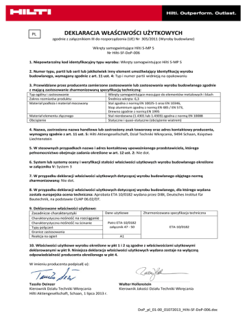 PL DEKLARACJA WŁAŚCIWOŚCI UŻYTKOWYCH zgodnie z załącznikiem III do rozporządzenia (UE) Nr 305/2011 (Wyroby budowlane) Wkręty samogwintujące Hilti S-MP S Nr Hilti-SF-DoP-006 1. Niepowtarzalny kod identyfikacyjny typu wyrobu: Wkręty samogwintujące Hilti S-MP S 2. Numer typu, partii lub serii lub jakikolwiek inny element umożliwiający identyfikację wyrobu budowlanego, wymagany zgodnie z art. 11 ust. 4: Typ i numer partii widnieją na opakowaniu 3. Przewidziane przez producenta zamierzone zastosowanie lub zastosowania wyrobu budowlanego zgodnie z mającą zastosowanie zharmonizowaną specyfikacją techniczną: Typ ogólny i zastosowanie Zakres rozmiarów produktu Materiał podłoża i materiał mocowany Wkręty samogwintujące mocujące do elementów metalowych i blach Średnica wkręta: 6,3 Stal zgodna z normą EN 10025-1 oraz EN 10346, Stop aluminium zgodny z normą EN 485 / EN 573, Drewno zgodnie z normą EN 1995 Stal nierdzewna (1.4301 lub 1.4303) zgodna z normą EN 10088 Statyczne i quasi-statyczne (obciążenie wiatrem) Materiał elementu złącznego Obciążenie 4. Nazwa, zastrzeżona nazwa handlowa lub zastrzeżony znak towarowy oraz adres kontaktowy producenta, wymagany zgodnie z art. 11 ust. 5: Hilti Aktiengesellschaft, Dział Techniki Wkręcania, 9494 Schaan, Księstwo Liechtenstein 5. W stosownych przypadkach nazwa i adres kontaktowy upoważnionego przedstawiciela, którego pełnomocnictwo obejmuje zadania określone w art. 12 ust. 2: Nie dot. 6. System lub systemy oceny i weryfikacji stałości właściwości użytkowych wyrobu budowlanego określone w załączniku V: System 3 7. W przypadku deklaracji właściwości użytkowych dotyczącej wyrobu budowlanego objętego normą zharmonizowaną: Nie dot. 8. W przypadku deklaracji właściwości użytkowych dotyczącej wyrobu budowlanego, dla którego wydana została europejska ocena techniczna: Aprobata ETA 10/0182 wydana przez DIBt, Deutsches Institut für Bautechnik, na podstawie CUAP 06.02/07. 9. Deklarowane właściwości użytkowe: Zasadnicze charakterystyki Charakterystyczna nośność na rozciąganie Charakterystyczna nośność na ścinanie Dane użytkowe Typy połączeń Granice zastosowania Reakcja na ogień Patrz ETA-10/0182 załącznik 47 - 50 Zharmonizowana specyfikacja techniczna ETA-10/0182 A1 10. Właściwości użytkowe wyrobu określone w pkt 1 i 2 są zgodne z właściwościami użytkowymi deklarowanymi w pkt 9. Niniejsza deklaracja właściwości użytkowych wydana zostaje na wyłączną odpowiedzialność producenta określonego w pkt 4. W imieniu producenta podpisał(-a): Tassilo Deinzer Kierownik Działu Techniki Wkręcania Hilti Aktiengesellschaft, Schaan, 1 lipca 2013 r. Walter Hollenstein Kierownik Jakości Działu Techniki Wkręcania DoP_pl_01-00_01072013_Hilti-SF-DoP-006.doc PL DEKLARACJA WŁAŚCIWOŚCI UŻYTKOWYCH zgodnie z załącznikiem III do rozporządzenia (UE) Nr 305/2011 (Wyroby budowlane) Wkręty do płyt warstwowych Hilti S-CD S, S-CDW S Nr Hilti-SF-DoP-009 1. Niepowtarzalny kod identyfikacyjny typu wyrobu: Wkręty do płyt warstwowych Hilti S-CD S, S-CDW S 2. Numer typu, partii lub serii lub jakikolwiek inny element umożliwiający identyfikację wyrobu budowlanego, wymagany zgodnie z art. 11 ust. 4: Typ i numer partii widnieją na opakowaniu 3. Przewidziane przez producenta zamierzone zastosowanie lub zastosowania wyrobu budowlanego zgodnie z mającą zastosowanie zharmonizowaną specyfikacją techniczną: Typ ogólny i zastosowanie Zakres rozmiarów produktu Materiał podłoża i materiał mocowany Materiał elementu złącznego Obciążenie Samowiercące wkręty do płyt warstwowych Średnice wkrętów: 5,5; 6,5 Stal zgodna z normą EN 10025-1 oraz EN 10346, Drewno zgodnie z normą EN 1995 Stal nierdzewna (1.4301 lub 1.4303) zgodna z normą EN 10088 Statyczne i quasi-statyczne (obciążenie wiatrem) 4. Nazwa, zastrzeżona nazwa handlowa lub zastrzeżony znak towarowy oraz adres kontaktowy producenta, wymagany zgodnie z art. 11 ust. 5: Hilti Aktiengesellschaft, Dział Techniki Wkręcania, 9494 Schaan, Księstwo Liechtenstein 5. W stosownych przypadkach nazwa i adres kontaktowy upoważnionego przedstawiciela, którego pełnomocnictwo obejmuje zadania określone w art. 12 ust. 2: Nie dot. 6. System lub systemy oceny i weryfikacji stałości właściwości użytkowych wyrobu budowlanego określone w załączniku V: System 2+ 7. W przypadku deklaracji właściwości użytkowych dotyczącej wyrobu budowlanego objętego normą zharmonizowaną: Nie dot. 8. W przypadku deklaracji właściwości użytkowych dotyczącej wyrobu budowlanego, dla którego wydana została europejska ocena techniczna: Aprobata ETA 13/0179 wydana przez DIBt, Deutsches Institut für Bautechnik, podstawie CUAP 06.02/12. Jednostka notyfikowana MPA-Karlsruhe 0769 wykonała zadania zewnętrzne w ramach systemu 2+ i wydała certyfikat zakładowej kontroli produkcji 0769-CPD-133326-1 i 0769CPD-133326-2. 9. Deklarowane właściwości użytkowe: Zasadnicze charakterystyki Charakterystyczna nośność na rozciąganie Charakterystyczna nośność na ścinanie Przemieszczenie łba wkręta Granice zastosowania Reakcja na ogień Dane użytkowe Zharmonizowana specyfikacja techniczna Patrz ETA 13/0179 załącznik 2 – 10 ETA 13/0179 A1 10. Właściwości użytkowe wyrobu określone w pkt 1 i 2 są zgodne z właściwościami użytkowymi deklarowanymi w pkt 9. Niniejsza deklaracja właściwości użytkowych wydana zostaje na wyłączną odpowiedzialność producenta określonego w pkt 4. W imieniu producenta podpisał(-a): Tassilo Deinzer Kierownik Działu Techniki Wkręcania Hilti Aktiengesellschaft, Schaan, 1 lipca 2013 r. Walter Hollenstein Kierownik Jakości Działu Techniki Wkręcania DoP_pl_01-00_01072013_Hilti-SF-DoP-009.doc