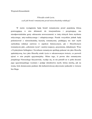 Wojciech Kruszelnicki Filozofia sztuki życia, czyli jak bronić romantyzmu przed nietzscheańską redukcją? W moim wystąpieniu będę bronił romantyzmu przed popularną kliszą postrzegającą w nim skłonność do irracjonalizmu i przypisującą mu nieodpowiedzialne gesty odrzucenia nowoczesności w imię różnych form myślenia mitycznego, anty-realistycznego i eskapistycznego. Przede wszystkim jednak będę polemizował z nietzscheańską krytyką romantyzmu, poddającą ten nurt myśli zachodniej redukcji zarówno w aspekcie historycznym, jak i filozoficznym (romantyzm jako „zubożenie życia”, nastrój rozpaczy, pesymizmu, dekadencji). Wraz z Fryderykiem Schleglem i Novalisem romantyzm spróbuję pokazać nie jako filozofię spekulatywną, lecz jako filozofię sztuki życia w odczarowanym świecie, co pozwoli ujrzeć w nim projekt egzystencjalny. Mimo tego, iż pewne idee romantyzmu jenajskiego Nietzschego fascynowały, wydaje się, że nie potrafił on w pełni docenić jego egzystencjalnego wymiaru i podjąć dziedzictwa myśli, której stawką, jak na ironię, było dostarczenie podstaw dla kulturotwórczej aktywności jednostki w świecie bez Boga.