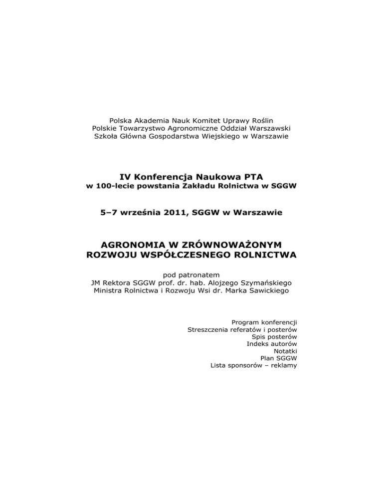 Polska Akademia Nauk Komitet Uprawy Roślin Polskie Towarzystwo Agronomiczne Oddział Warszawski Szkoła Główna Gospodarstwa Wiejskiego w Warszawie IV Konferencja Naukowa PTA w 100-lecie powstania Zakładu Rolnictwa w SGGW 5–7 września 2011, SGGW w Warszawie AGRONOMIA W ZRÓWNOWAŻONYM ROZWOJU WSPÓŁCZESNEGO ROLNICTWA pod patronatem JM Rektora SGGW prof. dr. hab. Alojzego Szymańskiego Ministra Rolnictwa i Rozwoju Wsi dr. Marka Sawickiego Program konferencji Streszczenia referatów i posterów Spis posterów Indeks autorów Notatki Plan SGGW Lista sponsorów – reklamy © Copyright by Wydawnictwo SGGW, Warszawa 2011 ISBN 978-83-7583-307-2 Druk: Agencja Reklamowo-Wydawnicza A. Grzegorczyk, www.grzeg.com.pl Komitet honorowy Prof. dr hab. dr h.c. Mariusz Fotyma – honorowy Prezes PTA Prof. dr hab. Tadeusz Barszczak Prof. dr hab. Alicja Gawrońska-Kulesza Prof. dr hab. Marianna Kalinowska-Zdun Doc. dr hab. Władysław Mazurczyk Prof. dr hab. Roman Moraczewski Prof. dr hab. Daniela Ostrowska Prof. dr hab. Janusz Ostrowski Prof. dr hab. Andrzej Radecki Prof. dr hab. Stanisława Roztropowicz Prof. dr hab. Barbara Rutkowska Materiały konferencyjne wydano na prawach maszynopisu. Całkowitą odpowiedzialność za treść streszczeń ponoszą Autorzy. Komitet naukowy Prof. dr hab. Andrzej Blecharczyk, UP Poznań Prof. dr hab. Franciszek Borówczak, UP Poznań Dr hab. Wojciech Dmuchowski, prof. SGGW Warszawa Dr hab. Stanisław Lenart, prof. SGGW Warszawa Prof. dr hab. Wiesław Mądry, SGGW Warszawa Prof. dr hab. Danuta Parylak, UP Wrocław Prof. dr hab. Jan Rozbicki, SGGW Warszawa Prof. dr hab. Franciszek Rudnicki, UTP Bydgoszcz Prof. dr hab. Krystyna Rykaczewska, IHAR Radzików Prof. dr hab. Piotr Stypiński, SGGW Warszawa Dr hab. Irena Suwara, SGGW Warszawa Prof. dr hab. Zdzisław Wyszyński, SGGW Warszawa Komitet organizacyjny SGGW Prof. dr hab. Jan Rozbicki – przewodniczący Prof. dr hab. Zdzisław Wyszyński – wiceprzewodniczący Dr Beata Michalska-Klimczak – sekretarz Dr hab. Stanisław Lenart, prof. SGGW Prof. dr hab. Krystyna Rykaczewska, IHAR Radzików Dr Dariusz Gozdowski Dr Maria Janicka Dr Anna Wysmułek Dr Arkadiusz Artyszak Dr Katarzyna Kucińska Dr Stanisław Samborski 4 IV Konferencja PTA, Warszawa 5-7. 09. 2011 Program konferencji 4 września (niedziela) od 15:00 Przyjazd części uczestników konferencji, DS. Limba 19:00-21:00 Kolacja 5 września (poniedziałek) 8:00-10:30 Rejestracja – Wydział Rolnictwa i Biologii, budynek 37, przed Aulą III Rozwieszanie posterów III piętro, hol Kawa, herbata 10:30-11:00 Otwarcie konferencji (Aula III) Przewodniczący Komitetu Organizacyjnego, JM Rektor SGGW, Przedstawiciel MRiRW Dziekan Wydziału Rolnictwa i Biologii, Prezes PTA, Przewodniczący KUR PAN IV Konferencja PTA, Warszawa 5-7 .09. 2011 5 11:00-13:30 Sesja otwierająca Polskie rolnictwo wobec wyzwań globalizacji, zmian klimatycznych i Wspólnej Polityki Rolnej Przewodniczący: Prof. dr hab. Andrzej Dubas, dr h.c., Prof. dr hab. Mariusz Fotyma, dr h.c. 11:00-11:30 Referat wprowadzający Założenia Wspólnej Polityki Rolnej na lata 2014 – 2020 – Dr Mieczysław Paradowski, MRiRW w Warszawie 11:30-12:00 Uwarunkowania społeczne i ekonomiczne rozwoju rolnictwa w Polsce – Prof. dr hab. Walenty Poczta, UP w Poznaniu 12:00-12:30 Przerwa - kawa, herbata 12:30-13:30 Wspólnotowa organizacja rynków rolnych, szanse i ograniczenia, przewidywane zmiany. Rynek zbóż, rzepaku, cukru, skrobi i pasz – Mgr Wiesław Łopaciuk, dr Piotr Szajner, mgr Wiesław Dzwonkowski, IERiGŻ, Warszawa 13:30-14:30 Obiad 14:30-15:30 Sesja otwierająca cd. Przewodniczący: Prof. dr hab. Franciszek Borówczak, Prof. dr hab. Danuta Parylak 6 IV Konferencja PTA, Warszawa 5-7. 09. 2011 14:30-15:00 Referat wprowadzający Zmiany klimatyczne, przewidywane konsekwencje dla rolnictwa, możliwości przeciwdziałania oraz działania dostosowawcze – Prof. dr hab. Zbigniew W. Kundzewicz, Instytut Środowiska Rolniczego i Leśnego PAN w Poznaniu 15:00-15:30 Stan hodowli roślin, nasiennictwa i doświadczalnictwa odmianowego roślin rolniczych w Polsce – Prof. dr hab. Edward Gacek, COBORU w Słupi Wielkiej 15:30-16:00 Wystąpienia przedstawicieli związków producentów rolnych i sponsorów konferencji 16:00-16:30 Panel dyskusyjny: referenci i prowadzący sesję 16:30-16:50 Przerwa - kawa, herbata 16:50-18:00 Sesja I. Biologiczne podstawy produkcyjności roślin Przewodniczący: Prof. dr hab. Józef Tworkowski, Prof. dr hab. Stefan Szczukowski IV Konferencja PTA, Warszawa 5-7 .09. 2011 7 16:50-17:20 Referat wprowadzający Postęp hodowlany - metody jego oceny i wykorzystanie w praktyce rolniczej w Polsce – Prof. dr hab. Franciszek Rudnicki, UTP w Bydgoszczy 17:20-17:35 Stabilność plonowania odmian żyta ozimego w warunkach glebowo-klimatycznych Dolnego Śląska – Mgr Andrzej Latusek, prof. dr hab. Henryk Bujak, UP Wrocław 17:35-17:50 Uwarunkowanie plonu ziarna 25 odmian pszenicy ozimej przez składowe plonu w doświadczeniach PDO – Mgr Jan Golba, prof. dr hab. Jan Rozbicki, prof. dr hab. Wiesław Mądry, dr Dariusz Gozdowski, mgr Marcin Studnicki, mgr Lidia Kurzyńska, mgr Mariusz Piechociński, SGGW w Warszawie 17:50-18:00 Dyskusja 18:00-19:00 Sesja dydaktyczna Przewodniczący: Prof. dr hab. Janusz Prusiński, Prof. dr hab. Piotr Stypiński 18:00-18:15 Stan obecny i problemy w kształceniu na kierunku rolnictwo – Prof. dr hab. Franciszek Rudnicki, UTP Bydgoszcz 8 IV Konferencja PTA, Warszawa 5-7. 09. 2011 18:15-18:30 Tendencje zmian w szkolnictwie wyższym, Krajowe Ramy Kwalifikacji – Prof. dr hab. Sławomir Podlaski, prof. dr hab. Andrzej Radecki, SGGW w Warszawie 18:30-18:45 Innowacyjne metody kształcenia – e-learning – Prof. dr hab. Jan Rozbicki, SGGW w Warszawie 18:45-19:00 Dyskusja 19:15 Kolacja IV Konferencja PTA, Warszawa 5-7 .09. 2011 9 6 września (wtorek) 7:00-8:00 Śniadanie 8:00-10:30 Sesja II. Surowce roślinne na cele żywnościowe i energetyczne oraz technologie ich pr