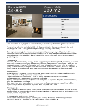 DOM na WYNAJEM 23 000 Warszawa, Mokotów 300 m2 64/2185/ODW 23 000 PLN 300 300 280 1960 2 6 VeryGood Opis Luksusowy dom do wynajęcia od zaraz. Położony w prestiżowej i bezpiecznej dzielnicy Mokotów. Powierzchnia całkowita budynku to 300 m/2 .Segment idealny dla dyplomatów, VIP-ów, osób przyjmujących gości , ceniących świetną lokalizację, wygodny dom i ciszę. Dom zaprojektowany jest w nowoczesnym, elegancki i gustownym stylu. W pełni umeblowany. Nieruchomość składa się z przestronnego salonu (70 m2), połączonego z otwarta kuchnią w pełni wyposażoną kuchnią i jadalnią, 3 dużych sypialni i przestronnego gabinetu, 4 łazienek, pralni. garażu i ogrodu. I kondygnacja: Jasny hol, wbudowane szafy, kanapy; Salon - wyjątkowo przestrzenny (70m2), słoneczny, w kolorze jasnym ecru, drewniane podłogi, klimatyzacja, kominek, nowocześnie umeblowany z wyjściem do ogrodu zimowego. Otwarta, funkcjonalna kuchnia, w kolorze jasnego ecru,w pełni wyposażona, sprzęt AGD wbudowany w eleganckie meble kuchenne, połączona z jadalnią, łazienka dla gości. Z salonu pięknie wkomponowane wejście na dwie następne kondygnacje - schody drewniane. II kondygnacja: Sypialna ( 25m2) wygodna, cicha utrzymana w jasnej tonacji, duże drewniane, dźwiękoszczelne okna z roletami, podłogi drewniane, umeblowana. I pokój: nowocześnie umeblowany ( 20 m2), ściany w kolorze jasnego ecu,drewniana podłoga,połączona z przestronna zbudowaną garderobą. II pokój: jasny przestronny (20 m2) doskonale nadaje się na sypialnię dla gości, na chwile obecną pełni rolę dodatkowej garderoby. Duża łazienka w pełni wyposażona, z podgrzewaną podłogą, nowoczesną przeszkloną kabiną prysznicową ścianami wyłożonymi płytkami, dwie umywalki, WC, bidet. III kondygnacja: Całość zajmuje przestronny, jasny, nowocześnie umeblowany gabinet wspaniale miejsce do pracy, jak również do wypoczynku. Łazienka ze ścianami wyłożonymi płytkami, pięknie wkomponowanym lustrem, wanna, umywalka, WC . IV kondygnacja - podziemna z oknami: Nowocześnie umeblowany pokój z łazienką ( dla pomocy domowej). Dodatkowe garderoby, Wyposażona pralnio - suszarnia, spiżarnia i pomieszczenia gospodarcze. ABRA-Nieruchomości Przed domem umeblowany taras i ogród automatycznie nawadniany. Z tyłu domu 2 garaże wolno stojące, ogrzewane. Przed posesją miejsca parkingowe. Dom posiada alarm i monitoring. Świetna lokalizacja na Górnym Mokotowie w cichej okolicy, niedaleko Centrum Finansowego Puławska. Świetna komunikacja z centrum Warszawy, także komunikacja miejska ( tramwaj, autobus). _____________________________________________________ Niniejsze ogłoszenie nie stanowi oferty w rozumieniu Kodeksu Cywilnego. Treść ogłoszenia jest oparta na informacjach uzyskanych od właściciela oferty. Zapytaj naszego doradcę o pomoc w uzyskaniu kredytu ! _____________________________________________________ ZAUFAJ NASZEMU DOŚWIADCZENIU ! Pomagamy klientom od 1990 roku. Gwarantujemy BEZPIECZNĄ, profesjonalną obsługę przy transakcjach kupna-sprzedaży i wynajmu. Małgorzata Pakulska tel. 501 111 010 tel. 22 646 50 55 email: [email protected] ABRA-Nieruchomości Powered by TCPDF (www.tcpdf.org)
