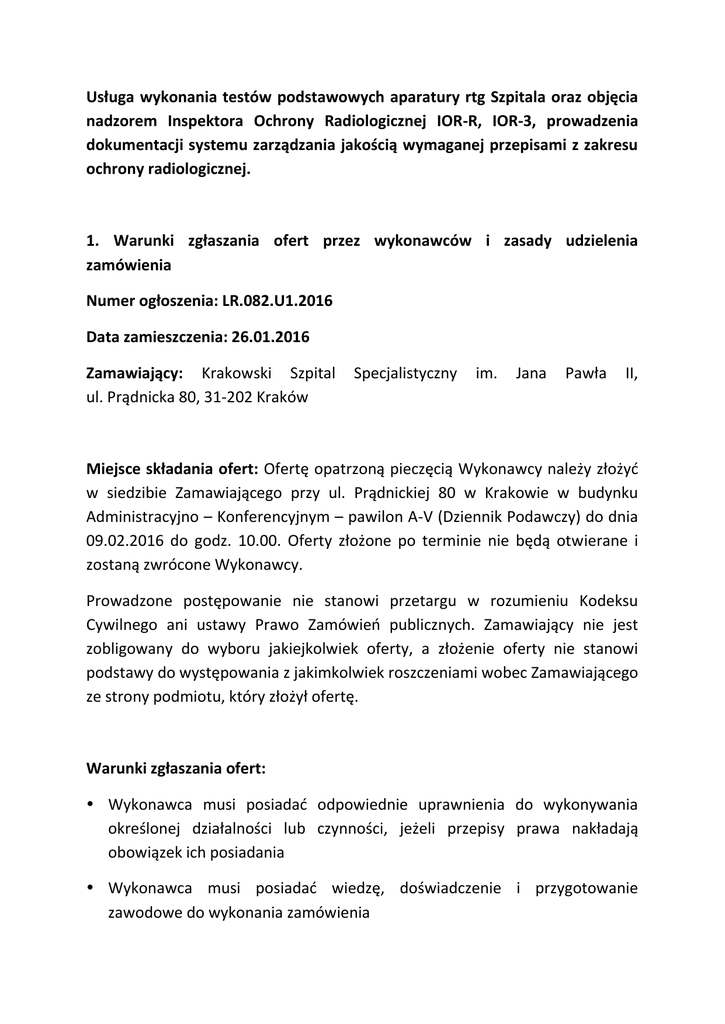 Usługa wykonania testów podstawowych aparatury rtg Szpitala oraz objęcia nadzorem Inspektora Ochrony Radiologicznej IOR-R, IOR-3, prowadzenia dokumentacji systemu zarządzania jakością wymaganej przepisami z zakresu ochrony radiologicznej. 1. Warunki zgłaszania ofert przez wykonawców i zasady udzielenia zamówienia Numer ogłoszenia: LR.082.U1.2016 Data zamieszczenia: 26.01.2016 Zamawiający: Krakowski Szpital ul. Prądnicka 80, 31-202 Kraków Specjalistyczny im. Jana Pawła II, Miejsce składania ofert: Ofertę opatrzoną pieczęcią Wykonawcy należy złożyć w siedzibie Zamawiającego przy ul. Prądnickiej 80 w Krakowie w budynku Administracyjno – Konferencyjnym – pawilon A-V (Dziennik Podawczy) do dnia 09.02.2016 do godz. 10.00. Oferty złożone po terminie nie będą otwierane i zostaną zwrócone Wykonawcy. Prowadzone postępowanie nie stanowi przetargu w rozumieniu Kodeksu Cywilnego ani ustawy Prawo Zamówień publicznych. Zamawiający nie jest zobligowany do wyboru jakiejkolwiek oferty, a złożenie oferty nie stanowi podstawy do występowania z jakimkolwiek roszczeniami wobec Zamawiającego ze strony podmiotu, który złożył ofertę. Warunki zgłaszania ofert: Wykonawca musi posiadać odpowiednie uprawnienia do wykonywania określonej działalności lub czynności, jeżeli przepisy prawa nakładają obowiązek ich posiadania Wykonawca musi posiadać wiedzę, doświadczenie i przygotowanie zawodowe do wykonania zamówienia Wykonawca może zaproponować tylko jedną cenę i nie może jej zmienić Ofertę składa się pod rygorem nieważności w formie pisemnej, w zamkniętej kopercie lub innym opakowaniu, wyraźnie oznaczonej nazwą i adresem Wykonawcy oraz numerem postępowania i jego nazwą wskazaną w ogłoszeniu. Oferta zawiera datę końcową związania ofertą nie krótszą niż 3 tygodnie od daty złożenia oferty. Informacje dotyczące zamówienia: I. Przedmiotem zamówienia jest: a) świadczenie usług polegających na wykonywaniu i ocenie testów podstawowych zgodnie z aktualnymi wymaganiami prawnymi dla poniższych urządzeń radiologicznych: L.p. Nazwa aparatu Wymagane testy Aparat rtg stacjonarny 1. Aparat rtg LUMINOS RF 2. Aparat rtg MULTIX FUSION 1. Geometria 2. Powtarzalność ekspozycji 3. Rozdzielczość wysoko niskokontrastowa 4. Kratka przeciwrozproszeniowa 5. System automatycznej kontroli ekspozycji (AEC) 6. Artefakty Aparat rtg przewoźny 3. Aparat rtg Basic 100-30 4. Aparat rtg Basic 100-30 5. Aparat rtg Basic 100-30 6. Aparat rtg Basic 100-30 7. Aparat rtg Basic 100 1. Geometria 2. Powtarzalność ekspozycji 3. Rozdzielczość wysoko i niskokontrastowa 5. Artefakty 8. Aparat rtg Polymobil 10 9. Aparat rtg Simply HP 10. Aparat rtg Simply HP 11. Aparat rtg MOBILETT XP Aparat typu ramię C 12. Arcadis Varic 13. Arcadis Varic 14. Axiom Artis sala A 15. Axiom Artis sala B 16. Artis Zee sala C 17. Artis Zee Ceiling sala D 18. Artis ZeeGo 19. Arcadis Avantic 20. Mammograf cyfrowy Lorad Selenia Hologic 1.Powtarzalność ekspozycji 2. Artefakty 3. Zniekształcenie obrazu 4. Zegar 5. Rozdzielczość wysokokontrastowa toru wizyjnego 1.Jednorodność obrazu 2. Kompensacja zmian grubości fantomu i wartości wysokiego napięcia 3. Kompresja piersi 4. Artefakty 5. Geometryczne zniekształcenie obrazu 6. Jakość obrazu b) pełnienie obowiązków Inspektora Ochrony Radiologicznej w Zakładzie Radiologii i Diagnostyki Obrazowej (uprawnienia IOR-R nadane przez Głównego Inspektora Sanitarnego) oraz Zakładzie Medycyny Nuklearnej (uprawnienia IOR-3 nadane przez Państwową Agencję Atomistyki) zgodnie z zakresem czynności będącym załącznikiem do niniejszego postępowania c) udział w kontrolach i audytach u Zamawiającego d) uzupełnianie i prowadzenie dokumentacji systemu zarządzania jakością wymaganej przepisami z zakresu ochrony radiologicznej dla Zakładu Radiologii i Diagnostyki Obrazowej e) przeprowadzanie analizy zdjęć odrzuconych (w razie potrzeby, co najmniej raz w miesiącu). II. Tabela Cenowa: /Do wypełnienia przez Wykonawcę/ Cena brutto [zł]/miesiąc Rodzaj usługi Aparat rtg stacjonarny Testy podstawowe kontroli jakości wraz Aparat rtg przewoźny z prowadzeniem Aparat typu ramię C dokumentacji Mammograf Inspektor ochrony radiologicznej Ilość sztuk 2 9 8 1 Zakład Radiologii i Diagnostyki Obrazowej (uprawnienia IOR-R) 1 Zakład Medycyny Nuklearnej (uprawnienia IOR-3) 1 Prowadzenie dokumentacji systemu zarządzania jakością dotyczącej rentgenodiagnostyki w Zakładzie Radiologii i Diagnostyki Obrazowej Cena jednostkowa brutto [zł] 1 SUMA Cena brutto [zł] Zakres czynności inspektora ochrony radiologicznej: Obowiązki inspektora ochrony radiologicznej obejmują czynności z zakresu ochrony radiologicznej określone w ustawie Prawo Atomowe z dnia 29 listopada 2000 r. z późniejszymi zmianami w szczególności: 1. prowadzenie dokumentacji dotyczącej ochrony radiologicznej zgodnie z obowiązującymi przepisami; 2. sprawdzanie kwalifikacji w zakresie ochrony przed promieniowaniem osób pracujących ze źródłami promieniowania; 3. nadzór nad wykonywaniem testów eksploatacyjnych radiologicznych (podstawowych oraz specjalistycznych); urządzeń 4. nadzór nad prawidłowym oznakowaniem miejsc pracy ze źródłami promieniowania, terenu nadzorowanego, terenu kontrolowanego, pojemników ze źródłami promieniowania; 5. prowadzenie ewidencji dawek indywidualnych, źródeł promieniowania, odpadów promieniotwórczych; 6. wstępne oraz okresowe szkolenie pracowników na stanowisku pracy w zakresie ochrony radiologicznej; 7. sprawdzanie warunków pracy ze źródłami promieniowania i meldowanie kierownikowi komórki organizacyjnej oraz inspektorowi ochrony radiologicznej Szpitala o stwierdzonych brakach i niedociągnięciach oraz przygotowanie zaleceń celem usunięcia tych braków i niedociągnięć; 8. wnioskowanie o zakup aparatury dozymetrycznej i sprzętu ochronnego potrzebnego w zakładzie; 9. informowanie kierownika komórki org
