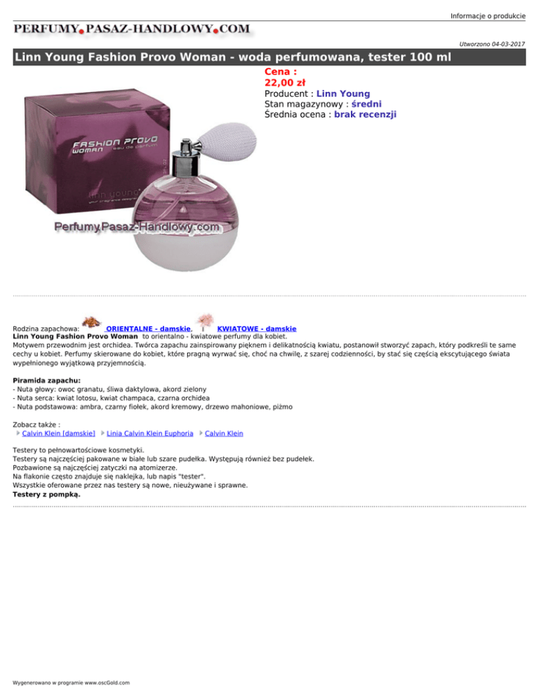 Informacje o produkcie Utworzono 04-03-2017 Linn Young Fashion Provo Woman - woda perfumowana, tester 100 ml Cena : 22,00 zł Producent : Linn Young Stan magazynowy : średni Średnia ocena : brak recenzji Rodzina zapachowa: ORIENTALNE - damskie, KWIATOWE - damskie Linn Young Fashion Provo Woman to orientalno - kwiatowe perfumy dla kobiet. Motywem przewodnim jest orchidea. Twórca zapachu zainspirowany pięknem i delikatnością kwiatu, postanowił stworzyć zapach, który podkreśli te same cechy u kobiet. Perfumy skierowane do kobiet, które pragną wyrwać się, choć na chwilę, z szarej codzienności, by stać się częścią ekscytującego świata wypełnionego wyjątkową przyjemnością. Piramida zapachu: - Nuta głowy: owoc granatu, śliwa daktylowa, akord zielony - Nuta serca: kwiat lotosu, kwiat champaca, czarna orchidea - Nuta podstawowa: ambra, czarny fiołek, akord kremowy, drzewo mahoniowe, piżmo Zobacz także : Calvin Klein [damskie] Linia Calvin Klein Euphoria Calvin Klein Testery to pełnowartościowe kosmetyki. Testery są najczęściej pakowane w białe lub szare pudełka. Występują również bez pudełek. Pozbawione są najczęściej zatyczki na atomizerze. Na flakonie często znajduje się naklejka, lub napis "tester". Wszystkie oferowane przez nas testery są nowe, nieużywane i sprawne. Testery z pompką. Wygenerowano w programie www.oscGold.com