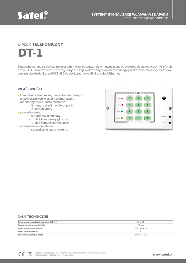SYSTEMY SYGNALIZACJI WŁAMANIA I NAPADU Komunikacja i powiadamianie DIALER TELEFONICZNY DT-1 Skuteczne narzędzia powiadamiania odgrywają kluczową rolę w nowoczesnych systemach alarmowych. W ofercie firmy SATEL znaleźć można szereg urządzeń zaprojektowanych do niezawodnego przekazania informacji alarmowej poprzez sieć telefoniczną (POTS i ISDN), sieć komórkową GSM czy sieci Ethernet. WŁAŚCIWOŚCI ••komunikator telefoniczny dla central alarmowych niewyposażonych w dialery zintegrowane ••monitoring w kilkunastu formatach: –– 2 numery stacji monitorujących –– 2 identyfikatory ••powiadamianie: –– 6 numerów telefonów –– 1 lub 2 komunikaty głosowe –– 1 lub 2 komunikaty tekstowe ••odpowiadanie na telefon: –– sprawdzanie stanu systemu DANE TECHNICZNE Znamionowe napięcie zasilania (±15%) Średni pobór prądu (±10%) Wymiary obudowy (mm) Klasa środowiskowa Zakres temperatur pracy Producent zastrzega sobie prawo do zmiany specyfikacji oraz danych technicznych urządzenia. Zdjęcie produktu może odbiegać od rzeczywistości. 12 V DC 30 mA 145 x 90 x 38 II -10°C…+55°C www.satel.pl