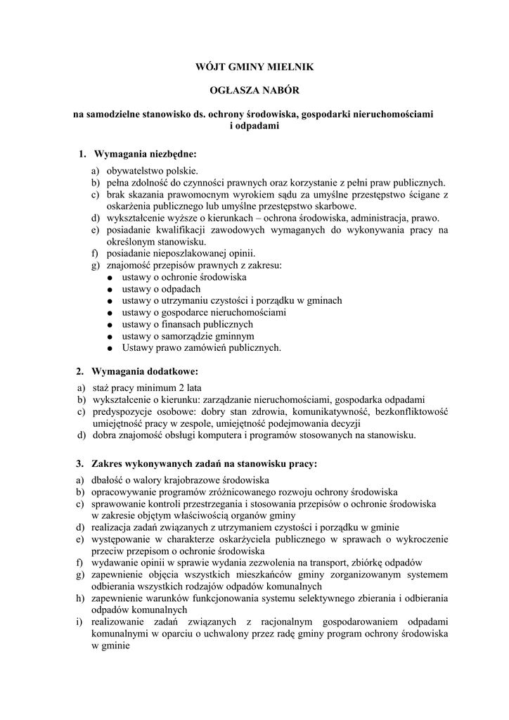 WÓJT GMINY MIELNIK OGŁASZA NABÓR na samodzielne stanowisko ds. ochrony środowiska, gospodarki nieruchomościami i odpadami 1. Wymagania niezbędne: a) obywatelstwo polskie. b) pełna zdolność do czynności prawnych oraz korzystanie z pełni praw publicznych. c) brak skazania prawomocnym wyrokiem sądu za umyślne przestępstwo ścigane z oskarżenia publicznego lub umyślne przestępstwo skarbowe. d) wykształcenie wyższe o kierunkach – ochrona środowiska, administracja, prawo. e) posiadanie kwalifikacji zawodowych wymaganych do wykonywania pracy na określonym stanowisku. f) posiadanie nieposzlakowanej opinii. g) znajomość przepisów prawnych z zakresu: ● ustawy o ochronie środowiska ● ustawy o odpadach ● ustawy o utrzymaniu czystości i porządku w gminach ● ustawy o gospodarce nieruchomościami ● ustawy o finansach publicznych ● ustawy o samorządzie gminnym ● Ustawy prawo zamówień publicznych. 2. Wymagania dodatkowe: a) staż pracy minimum 2 lata b) wykształcenie o kierunku: zarządzanie nieruchomościami, gospodarka odpadami c) predyspozycje osobowe: dobry stan zdrowia, komunikatywność, bezkonfliktowość umiejętność pracy w zespole, umiejętność podejmowania decyzji d) dobra znajomość obsługi komputera i programów stosowanych na stanowisku. 3. Zakres wykonywanych zadań na stanowisku pracy: a) dbałość o walory krajobrazowe środowiska b) opracowywanie programów zróżnicowanego rozwoju ochrony środowiska c) sprawowanie kontroli przestrzegania i stosowania przepisów o ochronie środowiska w zakresie objętym właściwością organów gminy d) realizacja zadań związanych z utrzymaniem czystości i porządku w gminie e) występowanie w charakterze oskarżyciela publicznego w sprawach o wykroczenie przeciw przepisom o ochronie środowiska f) wydawanie opinii w sprawie wydania zezwolenia na transport, zbiórkę odpadów g) zapewnienie objęcia wszystkich mieszkańców gminy zorganizowanym systemem odbierania wszystkich rodzajów odpadów komunalnych h) zapewnienie warunków funkcjonowania systemu selektywnego zbierania i odbierania odpadów komunalnych i) realizowanie zadań związanych z racjonalnym gospodarowaniem odpadami komunalnymi w oparciu o uchwalony przez radę gminy program ochrony środowiska w gminie j) tworzenie warunków do selektywnej zbiórki, segregacji i składowania odpadów przydatnych do wykorzystania oraz współdziałanie z podmiotami i osobami podejmującymi działania w zakresie zbiórki i zagospodarowania tego rodzaju odpadów k) udzielanie zezwoleń na prowadzenie działalności polegającej na usuwaniu, wykorzystaniu i unieszkodliwianiu odpadów komunalnych l) gospodarowanie nieruchomościami stanowiącymi własność gminy na zasadach określonych w przepisach szczegółowych m) tworzenie gminnego zasobu nieruchomości, n) prowadzenie spraw związanych ze sprzedażą nieruchomości gminnych, o) prowadzenie spraw w zakresie korzystania z prawa pierwokupu w przypadkach ustalonych w ustawie o gospodarce nieruchomościami p) naliczanie i windykacja opłat adiacenckich q) nadawanie numeracji nieruchomości. r) inne sprawy wynikające z Regulaminu Organizacyjnego Urzędu. 4. Informacja o warunkach pracy na stanowisku: a) budynek piętrowy, usytuowanie stanowiska pracy na parterze budynku (podjazd dla niepełnosprawnych, sanitariat dostosowany do potrzeb osoby niepełnosprawnej, brak windy). b) praca na przedmiotowym stanowisku nie jest narażona na występowanie uciążliwych i szkodliwych warunków pracy. c) czas pracy: pełen wymiar – przeciętnie 40 godzin tygodniowo. d) bezpośredni kontakt z klientami, wysiłek umysłowy. 5. Wskaźnik zatrudnienia osób niepełnosprawnych w Urzędzie Gminy Mielnik w miesiącu poprzedzającym datę upublicznienia ogłoszenia, w rozumieniu przepisów o rehabilitacji zawodowej i społecznej oraz zatrudnienia osób niepełnosprawnych, jest niższy niż 6 %. 6. Wymagane dokumenty: a) b) c) d) e) życiorys(CV), list motywacyjny (podanie o pracę), dokument potwierdzający wykształcenie (dyplom ukończenia studiów), kwestionariusz osobowy dla osoby ubiegającej się o zatrudnienie, kserokopie innych dokumentów potwierdzających posiadanie dodatkowych kwalifikacji i umiejętności, f) kserokopie dokumentów potwierdzających staż pracy, g) w przypadku gdy kandydatem jest osoba niepełnosprawna – kopię dokumentu potwierdzającego niepełnosprawność, h) oświadczenie kandydata o posiadaniu obywatelstwa polskiego, o korzystaniu z pełni praw publicznych i o niekaralności za umyślne przestępstwo ścigane z oskarżenia publicznego lub umyślne przestępstwo skarbowe. W przypadku zatrudnienia wymagane będzie zaświadczenie z Krajowego Rejestru Karnego, Wymagane dokumenty o zatrudnienie należy składać osobiście w siedzibie Urzędu Gminy Mielnik lub pocztą na adres Urzędu Gminy Mielnik ul.Piaskowa 38, 17-307 Mielnik z dopiskiem: “Dotyczy naboru na samodzielne stanowisko ds. ochrony środowiska, gospodarki nieruchomościami i odpadami” w terminie do 9 lutego 2012r. Aplikacje, które wpłyną do Urzędu Gminy po wyżej określonym terminie, nie będą rozpatrywane. Informacja o wyniku naboru będzie umieszczona na stronie internetowej Biuletynu Informacji Publicznej (http://bip.ug.mielnik.wrotapodlasia.pl/ oraz na tablicy informacyjnej w Urzędzie Gminy Mielnik, ul.Piaskowa 38.