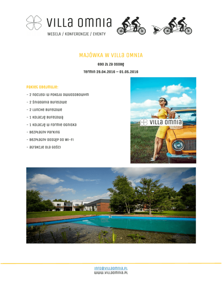 MAJÓWKA W VILla OMNIA 690 zł za osobę Termin 29.04.2016 – 01.05.2016 Pakiet obejmuje: - 2 noclegi w pokoju dwuosobowym - 2 śniadania bufetowe - 2 lunche bufetowe - 1 kolację bufetową - 1 kolację w formie ogniska - bezpłatny parking - bezpłatny dostęp do Wi-Fi - atrakcje dla gości [email protected] www.villaomnia.pl W programie: - I dzień turniej siatkówki, II dzień turniej piłki nożnej - pakiet zajęć na świeżym powietrzu: rowery, nornic-walking , zajęcia fitness - ognisko - gry terenowe - codzienny program animacji dla najmłodszych „W Omni-owej krainie wyobraźni” - I dzień kino letnie – „W krainie Walta Disneya” dla najmłodszych pod opieką animatorów - plac zabaw na świeżym powietrzu - 1,5 hektara terenu zielonego wraz z basenem, leżakami, kocykami do Państwa dyspozycji ! - I dzień Garden Party dla wszystkich gości ( muzyka, drink bar*, menu grillowe ) *dodatkowo płatny [email protected] www.villaomnia.pl