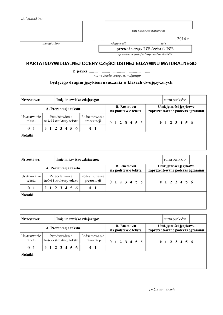 Załącznik 7a imię i nazwisko nauczyciela .................................................... , .......................... 2014 r. pieczęć szkoły miejscowość data przewodniczący PZE / członek PZE sprawowana funkcja. (niepotrzebne skreślić) KARTA INDYWIDUALNEJ OCENY CZĘŚCI USTNEJ EGZAMINU MATURALNEGO z języka ................................................................. nazwa języka obcego nowożytnego będącego drugim językiem nauczania w klasach dwujęzycznych Nr zestawu: Imię i nazwisko zdającego: A. Prezentacja tekstu Usytuowanie Przedstawienie Podsumowanie tekstu treści i struktury tekstu prezentacji 0 1 0 1 2 3 4 5 6 suma punktów B. Rozmowa na podstawie tekstu Umiejętności językowe zaprezentowane podczas egzaminu 0 1 2 3 4 5 6 0 1 2 3 4 5 6 0 1 Notatki: Nr zestawu: Imię i nazwisko zdającego: A. Prezentacja tekstu Usytuowanie Przedstawienie Podsumowanie tekstu treści i struktury tekstu prezentacji 0 1 0 1 2 3 4 5 6 suma punktów B. Rozmowa na podstawie tekstu Umiejętności językowe zaprezentowane podczas egzaminu 0 1 2 3 4 5 6 0 1 2 3 4 5 6 0 1 Notatki: Nr zestawu: Imię i nazwisko zdającego: A. Prezentacja tekstu Usytuowanie Przedstawienie Podsumowanie tekstu treści i struktury tekstu prezentacji 0 1 0 1 2 3 4 5 6 suma punktów B. Rozmowa na podstawie tekstu Umiejętności językowe zaprezentowane podczas egzaminu 0 1 2 3 4 5 6 0 1 2 3 4 5 6 0 1 Notatki: ................................................................................. podpis nauczyciela