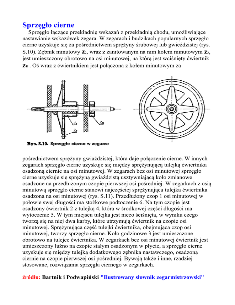 Sprzęgło cierne Sprzęgło łączące przekładnię wskazań z przekładnią chodu, umożliwiające nastawianie wskazówek zegara. W zegarach i budzikach popularnych sprzęgło cierne uzyskuje się za pośrednictwem sprężyny śrubowej lub gwieździstej (rys. S.10). Zębnik minutowy z2, wraz z zanitowanym na nim kołem minutowym z3, jest umieszczony obrotowo na osi minutowej, na którą jest wciśnięty ćwiertnik z11 . Oś wraz z ćwiertnikiem jest połączona z kołem minutowym za pośrednictwem sprężyny gwiaździstej, która daje połączenie cierne. W innych zegarach sprzęgło cierne uzyskuje się między sprężynującą tulejką ćwiertnika osadzoną ciernie na osi minutowej. W zegarach bez osi minutowej sprzęgło cierne uzyskuje się sprężyną gwiaździstą usztywniającą koło zmianowe osadzone na przedłużonym czopie pierwszej osi pośredniej. W zegarkach z osią minutową sprzęgło cierne stanowi najczęściej sprężynująca tulejka ćwiertnika osadzona na osi minutowej (rys. S.11). Przedłużony czop 1 osi minutowej w połowie swej długości ma stożkowe podtoczenie 6. Na tym czopie jest osadzony ćwiertnik 2 z tulejką 4, która w środkowej części długości ma wytoczenie 5. W tym miejscu tulejka jest nieco ściśnięta, w wyniku czego tworzą się na niej dwa karby, które utrzymują ćwiertnik na czopie osi minutowej. Sprężynująca część tulejki ćwiertnika, obejmująca czop osi minutowej, tworzy sprzęgło cierne. Koło godzinowe 3 jest umieszczone obrotowo na tulejce ćwiertnika. W zegarkach bez osi minutowej ćwiertnik jest umieszczony luźno na czopie stałym osadzonym w płycie, a sprzęgło cierne uzyskuje się między tulejką dodatkowego zębnika nastawczego, osadzoną ciernie na czopie pierwszej osi pośredniej. Bywają także i inne, rzadziej stosowane, rozwiązania sprzęgła ciernego w zegarkach. źródło: Bartnik i Podwapiński "Ilustrowany słownik zegarmistrzowski"