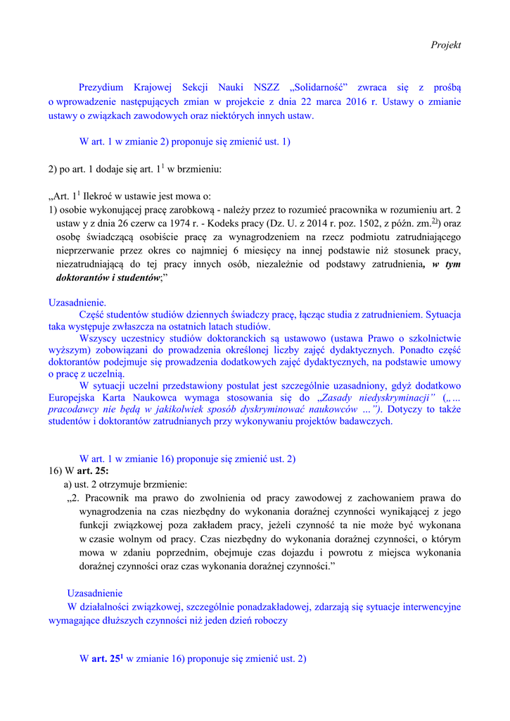 Projekt Prezydium Krajowej Sekcji Nauki NSZZ „Solidarność” zwraca się z prośbą o wprowadzenie następujących zmian w projekcie z dnia 22 marca 2016 r. Ustawy o zmianie ustawy o związkach zawodowych oraz niektórych innych ustaw. W art. 1 w zmianie 2) proponuje się zmienić ust. 1) 2) po art. 1 dodaje się art. 11 w brzmieniu: „Art. 11 Ilekroć w ustawie jest mowa o: 1) osobie wykonującej pracę zarobkową - należy przez to rozumieć pracownika w rozumieniu art. 2 ustaw y z dnia 26 czerw ca 1974 r. - Kodeks pracy (Dz. U. z 2014 r. poz. 1502, z późn. zm.2)) oraz osobę świadczącą osobiście pracę za wynagrodzeniem na rzecz podmiotu zatrudniającego nieprzerwanie przez okres co najmniej 6 miesięcy na innej podstawie niż stosunek pracy, niezatrudniającą do tej pracy innych osób, niezależnie od podstawy zatrudnienia, w tym doktorantów i studentów;” Uzasadnienie. Część studentów studiów dziennych świadczy pracę, łącząc studia z zatrudnieniem. Sytuacja taka występuje zwłaszcza na ostatnich latach studiów. Wszyscy uczestnicy studiów doktoranckich są ustawowo (ustawa Prawo o szkolnictwie wyższym) zobowiązani do prowadzenia określonej liczby zajęć dydaktycznych. Ponadto część doktorantów podejmuje się prowadzenia dodatkowych zajęć dydaktycznych, na podstawie umowy o pracę z uczelnią. W sytuacji uczelni przedstawiony postulat jest szczególnie uzasadniony, gdyż dodatkowo Europejska Karta Naukowca wymaga stosowania się do „Zasady niedyskryminacji” („… pracodawcy nie będą w jakikolwiek sposób dyskryminować naukowców …”). Dotyczy to także studentów i doktorantów zatrudnianych przy wykonywaniu projektów badawczych. W art. 1 w zmianie 16) proponuje się zmienić ust. 2) 16) W art. 25: a) ust. 2 otrzymuje brzmienie: „2. Pracownik ma prawo do zwolnienia od pracy zawodowej z zachowaniem prawa do wynagrodzenia na czas niezbędny do wykonania doraźnej czynności wynikającej z jego funkcji związkowej poza zakładem pracy, jeżeli czynność ta nie może być wykonana w czasie wolnym od pracy. Czas niezbędny do wykonania doraźnej czynności, o którym mowa w zdaniu poprzednim, obejmuje czas dojazdu i powrotu z miejsca wykonania doraźnej czynności oraz czas wykonania doraźnej czynności.” Uzasadnienie W działalności związkowej, szczególnie ponadzakładowej, zdarzają się sytuacje interwencyjne wymagające dłuższych czynności niż jeden dzień roboczy W art. 251 w zmianie 16) proponuje się zmienić ust. 2) d) ust. 2) otrzymuje brzmienie: „2. Organizacja, o której mowa w ust. 1, przedstawia co pół roku- według stanu na ostatni dzień półrocza - w terminie do 10 dnia miesiąca następującego po tym półroczu, podmiotowi zatrudniającemu albo dowódcy jednostki, o której mowa w ust. 1 pkt 2, informację o liczbie członków, o których mowa w ust. 1.”, e) po ust. 2 w dodanych ust. 3-9 proponuje się zmienić ust. 4, 5, 7 oraz dodać ust. 10 w brzmieniu: „4. Zakładowa organizacja związkowa, która nie wypełniła w terminie obowiązku, o którym mowa w ust. 2, do czasu wykonania tego obowiązku nie ma prawa reprezentowania wszystkich zatrudnionych , a jej uprawnienia ogranicza się do załatwiania bieżących spraw swoich członków.”, „5. Podmiot zatrudniający, a także dowódca jednostki, o której mowa w ust. 1 pkt. 2, może zwrócić się do właściwego okręgowego inspektora pracy o ustalenie liczby członków organizacji związkowej, o których mowa w ust. 2, na ostatni dzień danego półrocza. Do wniosku należy dołączyć informację, o której mowa w ust. 2.”, „7. Właściwy okręgowy inspektor pracy w terminie 14 dni od dnia doręczenia dokumentów , o których mowa w ust. 6, wydaje decyzję w sprawie ustalenia liczby członków organizacji związkowej, o których mowa w ust. 2, na ostatni dzień danego półrocza.”, Uzasadnienie Nie ma podstaw przedstawianie co kwartał, podmiotowi zatrudniającemu albo dowódcy jednostki, o której mowa w ust. 1 pkt 2, informacji o liczbie członków. Liczby członków organizacji związkowych nie ulegają częstym zmianom. Składanie informacji co kwartał stanowi jedynie obciążenie biurokratyczne. Dodaje się ust. 10 w brzmieniu: „10. Wymóg, o którym mowa w ust.2 nie dotyczy organizacji: - która jest jedyną organizacją, działającą u podmiotu zatrudniającego, - dla których podmiot zatrudniający potrąca z wynagrodzeń i odprowadza (przelewa) na konto organizacji związkowej składki członkowskie.” Uzasadnienie Jeżeli u podmiotu zatrudniającego działa jedna organizacja związkowa, której członkom składki są potrącane z wynagrodzeń i odprowadzane na konto organizacji związkowej, to wymóg, o którym mowa w ust.2 jest zbyteczny, gdyż podmiot zatrudniający ma bieżącą informację o liczbie członków. Proponuje się uzupełnienie zmiany 20) przez podział w art. 27 ust.3 na dwa ustępy 3 i 4 oraz jego uzupełnienie jak następuje: Art. 27. „3. Regulaminy nagród i premiowania są ustalane i zmieniane w uzgodnieniu z zakładowymi organizacjami związkowymi.” „4. Zasady podziału środków na podwyżki wynagrodzeń dla pracowników zatrudnionych w państwowej jednostce sfery budżetowej oraz jednostce sektora finansów publicznych są uzgadniane z zakładowymi organizacjami związkowymi.” Uzasadnienie Wyższe uczelnie publiczne od 2005r. nie należą do sfery budżetowej, mimo, że ich podstawowa działalność (dydaktyczna i naukowa - statutowa), w tym wynagrodzenia pracowników, jest finansowana z budżetu państwa. Skutkuje to tym, że jakiekolwiek podwyżki wynagrodzeń nie są uzgadniane, a w wielu przypadkach nawet nie konsultowane ze zakładowymi organizacjami związkowymi. Prowadzi to do wielu patologii, gdyż realizowana jest wtedy zasada tzw. uznawalności bezpośredniego przełożonego, co w efekcie daje rozpiętość średnich wynagrodzeń zasadniczych pracowników z tym samym stopniem/tytu