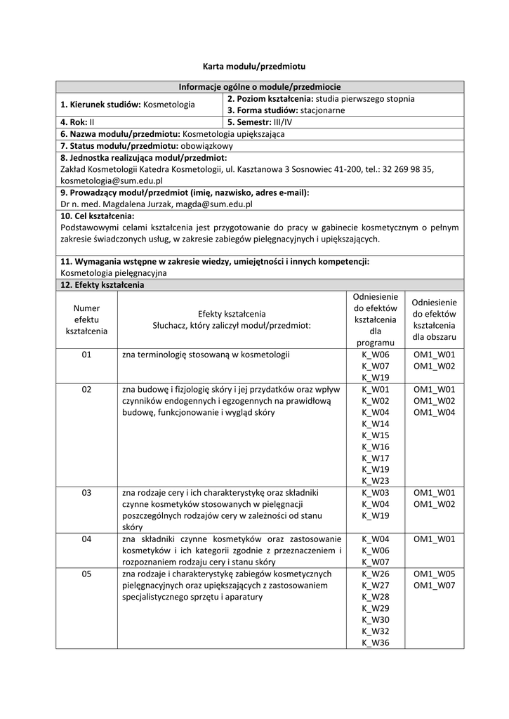 Karta modułu/przedmiotu Informacje ogólne o module/przedmiocie 2. Poziom kształcenia: studia pierwszego stopnia 1. Kierunek studiów: Kosmetologia 3. Forma studiów: stacjonarne 4. Rok: II 5. Semestr: III/IV 6. Nazwa modułu/przedmiotu: Kosmetologia upiększająca 7. Status modułu/przedmiotu: obowiązkowy 8. Jednostka realizująca moduł/przedmiot: Zakład Kosmetologii Katedra Kosmetologii, ul. Kasztanowa 3 Sosnowiec 41-200, tel.: 32 269 98 35, [email protected] 9. Prowadzący moduł/przedmiot (imię, nazwisko, adres e-mail): Dr n. med. Magdalena Jurzak, [email protected] 10. Cel kształcenia: Podstawowymi celami kształcenia jest przygotowanie do pracy w gabinecie kosmetycznym o pełnym zakresie świadczonych usług, w zakresie zabiegów pielęgnacyjnych i upiększających. 11. Wymagania wstępne w zakresie wiedzy, umiejętności i innych kompetencji: Kosmetologia pielęgnacyjna 12. Efekty kształcenia Odniesienie Numer do efektów Efekty kształcenia efektu kształcenia Słuchacz, który zaliczył moduł/przedmiot: kształcenia dla programu 01 zna terminologię stosowaną w kosmetologii K_W06 K_W07 K_W19 02 zna budowę i fizjologię skóry i jej przydatków oraz wpływ K_W01 czynników endogennych i egzogennych na prawidłową K_W02 budowę, funkcjonowanie i wygląd skóry K_W04 K_W14 K_W15 K_W16 K_W17 K_W19 K_W23 03 zna rodzaje cery i ich charakterystykę oraz składniki K_W03 czynne kosmetyków stosowanych w pielęgnacji K_W04 poszczególnych rodzajów cery w zależności od stanu K_W19 skóry 04 zna składniki czynne kosmetyków oraz zastosowanie K_W04 kosmetyków i ich kategorii zgodnie z przeznaczeniem i K_W06 rozpoznaniem rodzaju cery i stanu skóry K_W07 05 zna rodzaje i charakterystykę zabiegów kosmetycznych K_W26 pielęgnacyjnych oraz upiększających z zastosowaniem K_W27 specjalistycznego sprzętu i aparatury K_W28 K_W29 K_W30 K_W32 K_W36 Odniesienie do efektów kształcenia dla obszaru OM1_W01 OM1_W02 OM1_W01 OM1_W02 OM1_W04 OM1_W01 OM1_W02 OM1_W01 OM1_W05 OM1_W07 06 07 08 09 10 potrafi rozpoznać rodzaje cery i stan skóry oraz jej przydatków potrafi planować rodzaje zabiegów kosmetycznych pielęgnacyjnych i upiększających oraz prawidłowo stosować kosmetyki zgodnie z ich składem i przeznaczeniem potrafi wykonywać zabiegi z zakresu kosmetologii pielęgnacyjnej i upiększającej z uwzględnieniem wskazań i przeciwwskazań wykazuje prawidłową postawę kosmetologa okazując szacunek dla klienta, zapewniając pełen komfort psychiczny i fizjonomiczny podczas wykonywania zabiegów kosmetycznych potrafi skutecznie i taktownie komunikować się z klientami 13. Formy zajęć w odniesieniu do efektów kształcenia Forma zajęć dydaktycznych Numer efektu ćwiczenia ćwiczenia wykład seminarium kształcenia laboratoryjne praktyczne 01 X X X 02 X X X 03 X X X 04 X X X 05 X X X 06 X X 07 X X X 08 X 09 X 10 X K_U13 OM1_U04 K_U03 K_U08 K_U10 K_U17 K_U01 K_U02 K_U17 K_K01 K_K07 K_K10 K_K11 K_K03 K_K04 K_K05 K_K06 OM1_U01 OM1_U03 OM1_U05 inne e-learning 14. Treści programowe 14.1. Forma zajęć: Wykłady Fotoprotekcja sztuczna. Mechanizmy działania filtrów przeciwsłonecznych i substancje wykorzystywane jako ochronne filtry przeciwsłoneczne fizyczne i chemiczne. Podstawowe grupy filtrów W1, W2 przeciwsłonecznych (filtry fizyczne, filtry chemiczne, filtry naturalne). Przykłady filtrów chemicznych i fizycznych najczęściej stosowanych w kosmetykach. Substancje stosowane jako składniki czynne kosmetyków przeznaczonych dla cery dojrzałej (witaminy, koenzym Q, adenozyna, W3, W4 kolagen, kwas hialuronowy, cytokininy i inne substancje pozyskiwane z roślin). Substancje pozyskiwane biotechnologicznie stosowane jako składniki czynne kosmetyków przeznaczonych dla cery dojrzałej. Peptydy W5 sygnałowe, transportujące oraz hamujące przekaźnictwo nerwowomięśniowe. Zabiegi kosmetyczne stosowane w profesjonalnej pielęgnacji skóry/cery dojrzałej. Peelingi – klasyfikacja. Wskazania, przeciwwskazania Podział peelingów W6 w zależności od zastosowanej metody (fizyczne, chemiczne, OM1_U01 OM1_U05 OM1_K01 OM1_K04 OM1_K05 OM1_K02 OM1_K03 OM1_K04 Liczba godzin 2 2 1 1 W7, W8, W9 W10, W11 W12 W13, W14 W15 mechaniczne, biologiczne, mieszane). Podział peelingów w zależności od głębokości niszczenia tkanek (bardzo powierzchowne, powierzchowne, średniogłębokie, głębokie; kosmetyczne, medyczne). Peelingi fizyczne, enzymatyczne, ziołowe. Wskazania i przeciwwskazania względne i bezwzględne do wykonywania peelingów. Peelingi enzymatyczne – wskazania, wykorzystywane enzymy i ich źródła. Peelingi chemiczne. Pojęcia peeling chemiczny i chemabrazja. Cechy charakterystyczne, sposób działania (efekt metaboliczny, cytotoksyczny, keratolityczny) i własności najczęściej stosowanych substancji złuszczających w chemabrazji (kwasy owocowe: alfahydroksykwasy AHA, betahydroksykwasy BHA, polihydroksykwasy PHA, kwas trichlorooctowy (TCA), kwas witaminy A (kwas retinowy), fenol, rezorcyna, roztwór Jessnera). Wskazania i przeciwwskazania do wykonania peelingów chemicznych. Zalecenia ogólne pielęgnacji skóry po peelingu chemicznym. Efekty uboczne i powikłania peelingu chemicznego. Mechanizm powstawania przebarwień. Składniki czynne kosmetyków o działaniu wybielającym na skórę (retinol, amid kwasu nikotynowego, glabrydyna, ekstrakt z morwy, soja, aloesyna, AHA, kwas kojowy, kwas azelainowy, kwas fitowy). Przykłady kosmetyków i dermokosmetyków redukujących przebarwienia. Profesjonalne zabiegi redukujące hiperpigmentacje (z uwzględnieniem zabiegów fizykalnych). Otyłość – definicja, przyczyny powstawania, klasyfikacja. Wskaźniki: BMI, WHR, WC. BIA. Uwarunkowania nadmiernej otyłości. Najczęstsze zmiany skórne towarzyszące otyłości. Zabiegi kosmetyczne (fizykalne) i substancje aktywne redukujące miejscowe depozyty tkanki tłuszczowej. Lipodystrofia typu kobiecego (cellulit) - etiopatogeneza, stadia rozwojowe, nasilenie zmian, czynniki p