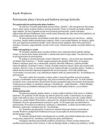 Kącik Wrębowa Poświęcenie placu i krzyża pod budowę nowego kościoła Przygotowania do poświęcenia placu budowy W połowie września poprosiłem prezesa firmy „Dralex”, aby przygotować drewniany krzyż, który stanie na placu budowy nowego kościoła. Firma wywiązała się bardzo dobrze z tego zadania. Na dwa tygodnie przed uroczystością poświęcenia, został wykopany odpowiedni dół pod fundament, który został zalany betonem tak, aby umocować podstawę, na której został osadzony krzyż (zdjęcie). W dniu poświęcenia, do południa został także zamontowany już sam krzyż – piękny, wyrazisty, bardzo ładnie pomalowany (zdjęcie). Było z tym trochę kłopotu, bo miejsce, gdzie stoi, jest najniższym punktem działki i przy intensywnych opadach, które były pod koniec miesiąca września, nagromadziło się tam wiele wody. Ostatecznie jednak wszystko dobrze się udało. Mała retrospekcja w czasie W miesiącu sierpniu prace na placu budowy przy makroniwelacji nabrały takiego tempa, że można było realnie pomyśleć o zakończeniu pierwszego etapu. Ten pierwszy etap, to przygotowanie do poświęcenia. W jednej ze swoich piosenek „Golec Orkiestra” śpiewa: „Tu na razie jest ściernisko, ale będzie San Francisco...”. Kiedy sięgam pamięcią do grudnia 2009 roku, to na placu budowy mieliśmy gęsty las z samosiejek, potężny zbiornik żelbetowy i połowę działki stanowił głęboki, na ponad 2 metry, wykop. Ponadto mnóstwo śmieci, które tam można było znaleźć, mówiło o tym, że mieszkańcy ten teren traktowali jako wysypisko śmieci. Trudno w takich okolicznościach zapraszać kogokolwiek na poświęcenie. Dziś cała działka jest wyrównana i oczyszczona, więc naturalnym etapem stało się zaproszenie Ks. Arcybiskupa na poświęcenie. Na części, gdzie był zasypany wykop, jeden z naszych parafian użyczył swojego sprzętu, a konkretnie walca drogowego, aby jeszcze bardziej ubić ten teren. To była ostatnia czynność wraz z pracami przy postawieniu krzyża, przygotowująca uroczystość poświęcenia. Trzeba jeszcze dodać, iż staraniem radnego z Niedobczyc – pana Henryka – Zieleń Miejska wykosiła trawę na działkach należących do miasta wokół placu budowy, za co bardzo dziękuję. Dzień poświęcenia Wymarzona pogoda, piękne słońce, w miarę ciepło (niektórzy byli nawet w krótkim rękawie!). Po godzinie 16.00 zaczęły się zbierać pierwsze osoby. Ustawiliśmy się na placu, część osób stała na ulicy Zwycięstwa. W obecności byłych proboszczów (ks. prałat Alfred Wloka i ks. prałat Hubert Wieczorke) i obecnych (ks. dziekan Stanisław Kołodziej i ks. Zenon Działach) i licznie zgromadzonych wiernych o godz. 16.30 rozpoczęło się nabożeństwo poświęcenia. Przywitał wszystkich ks. proboszcz z Biertułtów, a całości przewodniczył ks. Dziekan z polecenia i delegowania Ks. Arcybiskupa. Ks. Stanisław przypomniał, że pierwsze starania dotyczące budowy kościoła na osiedlu Wrębowa podjęli byli Proboszczowie już na początku lat dziewięćdziesiątych dwudziestego wieku. W imieniu młodych ludzi mieszkających na osiedlu, pan Jakub Grabarczyk wraz ze swoją żoną, poprosili ks. Dziekana o poświęcenie placu pod budowę. Następnie młodzież prowadziła modlitwę różańcową. Potem została odmówiona modlitwa poświęcenia ziemi i krzyża. Czuło się Bożego ducha w trakcie tej modlitwy, wielki pokój i namaszczenie. Bardzo mnie cieszył fakt, iż gro zebranych osób, to byli ludzie młodzi. To w końcu z myślą o nich (przede wszystkim) ma powstać ten ośrodek duszpasterski. Co na teraz? Na placu budowy nie będzie się już nic działo, aż do wiosny. Obecnie proszę o modlitwę w intencji architekta i projektu, aby wszystko dobrze zostało zaplanowane i by Komisja Sztuki Sakralnej zaakceptowała projekt. Na czas odwiedzin duszpasterskich przygotowuję widokówkę z wizualizacją wstępnego projektu, żebyśmy mogli zobaczyć, jak by to mogło wyglądać. Mam nadzieję, że pomysł się spodoba, jak i propozycja projektowa. Poproszę także duszpasterzy z Niedobczyc, aby tą widokówkę dostarczyli do tych rodzin, które w przyszłości będą bezpośrednio zainteresowane nowym kościołem. ks. Dariusz Kreihs