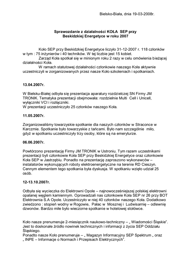Sprawozdanie z działalności Koła za rok 2007 - SEP Bielsko