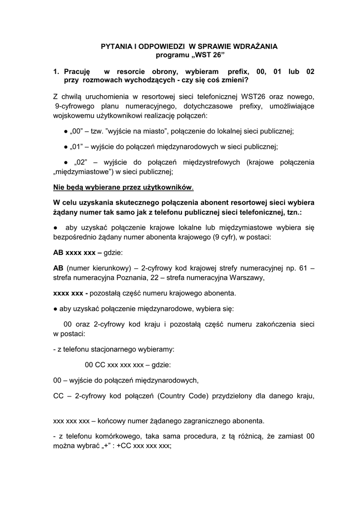 PYTANIA I ODPOWIEDZI W SPRAWIE WDRAŻANIA programu „WST 26” 1. Pracuję w resorcie obrony, wybieram prefix, 00, 01 lub 02 przy rozmowach wychodzących - czy się coś zmieni? Z chwilą uruchomienia w resortowej sieci telefonicznej WST26 oraz nowego, 9-cyfrowego planu numeracyjnego, dotychczasowe prefixy, umożliwiające wojskowemu użytkownikowi realizację połączeń: ● „00” – tzw. ”wyjście na miasto”, połączenie do lokalnej sieci publicznej; ● „01” – wyjście do połączeń międzynarodowych w sieci publicznej; ● „02” – wyjście do połączeń międzystrefowych (krajowe połączenia „międzymiastowe”) w sieci publicznej; Nie będą wybierane przez użytkowników. W celu uzyskania skutecznego połączenia abonent resortowej sieci wybiera żądany numer tak samo jak z telefonu publicznej sieci telefonicznej, tzn.: ● aby uzyskać połączenie krajowe lokalne lub międzymiastowe wybiera się bezpośrednio żądany numer abonenta krajowego (9 cyfr), w postaci: AB xxxx xxx – gdzie: AB (numer kierunkowy) – 2-cyfrowy kod krajowej strefy numeracyjnej np. 61 – strefa numeracyjna Poznania, 22 – strefa numeracyjna Warszawy, xxxx xxx - pozostałą część numeru krajowego abonenta. ● aby uzyskać połączenie międzynarodowe, wybiera się: 00 oraz 2-cyfrowy kod kraju i pozostałą część numeru zakończenia sieci w postaci: - z telefonu stacjonarnego wybieramy: 00 CC xxx xxx xxx – gdzie: 00 – wyjście do połączeń międzynarodowych, CC – 2-cyfrowy kod połączeń (Country Code) przydzielony dla danego kraju, xxx xxx xxx – końcowy numer żądanego zagranicznego abonenta. - z telefonu komórkowego, taka sama procedura, z tą różnicą, że zamiast 00 można wybrać „+” : +CC xxx xxx xxx; Pozostałe prefiksy, nie związane z połączeniami w sieciach publicznych pozostają w użyciu: ● „03” – wyjście do sieci telefonicznej NATO; ● „04” – wyjście do połączeń w sieci MSW oraz PKP; ● „05” – wyjście do sieci ABW; ● „08” – wyjście do połączeń z PKW. 2. Czy w ramach limitu na stanowisku pracy będzie do dyspozycji więcej impulsów? Przydzielone limity na stanowiskach pracy na rozmowy telefoniczne do sieci publicznych - pozostają bez zmian. Organizator Wojskowego Systemu Telekomunikacyjnego (ISI) przewiduje analizę i weryfikację resortowego ruchu telefonicznego funkcjonującego w nowym modelu uwzględniającym hurtowe ceny rozliczeń za połączenia po 6 miesiącach funkcjonowania, zatem ewentualne zmiany w wielkościach limitów mogą być znane na przełomie 2015/2016 r. 3. Jestem żołnierzem – emerytem - jak będę mógł zadzwonić do mojej jednostki z telefonu miejskiego? Każdy użytkownik telefonu operatora publicznego („miejskiego”) po wprowadzeniu nowej numeracji telefonicznej w SZ RP (9-cyfrowej) uzyska skuteczne połączenie z abonentem resortu obrony narodowej na obszarze Rzeczypospolitej Polskiej wybierając bezpośrednio następującą postać numeru: 261 xxx xxx - gdzie xxx xxx to dotychczasowa 6-cyfrowa postać numeru telefonicznego MON. 4. Jak mogę zadzwonić do jednostki z telefonu komórkowego? Użytkownik telefonii komórkowej, w celu uzyskania połączenia z resortowym abonentem sieci telefonicznej, standardowo wybiera bezpośrednio pełny 9cyfrowy numer w postaci: 261 xxx xxx - gdzie xxx xxx to dotychczasowa 6-cyfrowa postać numeru telefonicznego MON. 5. Jak zadzwonić z uprawnionego telefonu wojskowego? Patrz odp. do pyt 1. 6. Jak zadzwonić z zagranicy? Zasada taka sama jak w sieciach publicznych, tzn.: ● z telefonu stacjonarnego wybieramy: 00 48 261xxx xxx – gdzie: 00 – wyjście do połączeń międzynarodowych, 48 – kod połączeń kierowanych do Polski 261 xxx xxx – numer abonenta sieci resortu obrony narodowej. ● z telefonu komórkowego, taka sama procedura, z tą różnicą, że zamiast 00 można wybrać „+”: +48 261 xxx xxx. 7. Czy tak samo będę wybierać numer niezależnie od województwa? tj. na początku 261xxx xxx Tak, numer abonenta wojskowej sieci w postaci 261xxx xxx osiągalny jest z każdej, dowolnej lokalizacji w kraju, bez konieczności wybierania dodatkowych numerów. 8. Ile ta zmiana będzie kosztować? Planowane zmiany, które wchodzą w życie od 01.03.2015 r. przygotowywane były przez RON od 2010 r. i koszty ponoszone były w ramach realizacji Planu modernizacji technicznej SZ. Natomiast działania wdrożeniowe WST26 oraz nowej numeracji telefonicznej w SZ RP (9-cyfrowej) nie generują bezpośrednich kosztów i realizowane są w ramach bieżącej działalności organizacyjno – technicznej RON. 9. Czy to jest rozwiązanie docelowe? Tak, nowy plan numeracji telefonicznej SZ RP jest rozwiązaniem docelowym. 10. Gdzie znajdę informację- jak powinnam dzwonić? W ramach wdrożenia WST26 oraz nowej numeracji telefonicznej w SZ RP (9-cyfrowej) przewidziano kompleksowy plan informowania użytkowników instytucjonalnych i indywidualnych resortowej sieci telefonicznej o nowym sposobie osiągania skutecznych połączeń telefonicznych między innymi na stronach internetowych: mon.gov.pl i wojsko-polskie.pl oraz portalu resortowym portal.ron.int. 11. Czy informacja o zmianie numeru będzie nagrana i słyszalna podczas wybierania numeru? Plan informowania użytkowników przewiduje różne kanały informacyjne m.in. uruchomienie w resortowych centralach zapowiedzi głosowej o nowym sposobie osiągania skutecznych połączeń telefonicznych. 12. Gdzie będę mógł się dowiedzieć jaki jest numer telefonu dowolnej jednostki na terenie całego kraju? Wdrożenie WST26 oraz nowej numeracji telefonicznej w SZ RP (9-cyfrowej) nie zmienia dotychczas obowiązujących zasad informowania o abonentach RON. 13. Czy przewiduje się równoległe, przez pewien czas, funkcjonowanie starych numerów i nowych? Nie przewiduje się. 14. Czy jeśli ktoś wykręci stary numer przekierowywany na nowy numer? Nie, patrz odpowiedź w pyt. 11. to będzie au