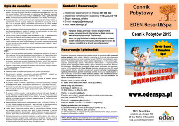 Opis do cennika: Wszystkie podane ceny są cenami brutto (zawierają 8% VAT) - w przypadku zmiany stawki podatku - ceny mogą ulec zmianie. Dla różnych rodzajów pobytu stosowane są inne ceny oraz inne zakresy świadczeń. Klienta obowiązuje cena aktualna w dniu dokonania rezerwacji. Ceny dotyczą zakwaterowania osoby dorosłej w standardowym pokoju, apartamencie lub domku, przy wykorzystaniu wszystkich miejsc noclegowych (chyba że oferta stanowi inaczej). Standardowe pobyty w sezonie wysokim w pokojach rozpoczynają się i kończą w niedzielę, w apartamentach i domkach w sobotę. Każdorazowo doba hotelowa trwa od godz. 15.00 do godz. 10.00. W przypadku pobytów z wyżywieniem pobyt rozpoczyna się i kończy posiłkiem wskazanym w danej ofercie. Posiłki wydawane są w systemie samoobsługowym i są porcjowane. Oferty z wyżywieniem różnią się w zależności od terminu. W sezonie wysokim istnieje możliwość dokupienia dodatkowych posiłków. W niektórych terminach dopuszcza się zmianę liczby posiłków i kwestii organizacyjnych dotyczących wyżywienia. Gościom ośrodka mogą być wydawane opaski identyfikacyjne na rękę. Ich prawidłowe noszenie jest wtedy obowiązkowe, na ich podstawie realizowane są wszelkie świadczenia. Pobyty i ich różne rodzaje odbywają się tylko w przypadku odpowiedniej ilości rezerwacji. Ośrodek zastrzega sobie prawo do odwołania pobytu w przypadku niedostatecznej frekwencji lub innych przyczyn od niego niezależnych (decyzje władz państwowych, kataklizmy, awarie, działanie siły wyższej. Itp.). Pełna treść Regulaminu Ośrodka i Warunków Uczestnictwa oraz opisy poszczególnych ofert dostępne są na stronie internetowej: www.edenspa.pl. ZNIŻKI : Dzieci 0-3 lat nocują bezpłatnie (bez wyżywienia i osobnej pościeli, z miejscem do spania na łóżku opiekunów). Na życzenie udostępniamy bezpłatnie łóżeczko dla małego dziecka, krzesełko do karmienia, wanienkę i podgrzewacz do butelek. Usługa wymaga rezerwacji sprzętu. Dzieciom w wieku 3-12 lat przysługuje dodatkowa zniżka w przypadku korzystania z noclegu na dostawce - prosimy pytać w recepcji. Każdorazowo dla dzieci w wieku 3-12 lat przewidziane jest 1/2 porcji wyżywienia. Dzieci i młodzież pow. 12 roku życia obowiązują pełne ceny. Dostawka - drugie miejsce na wersalce lub rozkładane łóżko turystyczne. Nocleg na dostawce - 75% ceny podstawowej. Szczegóły w recepcji. DOPŁATY I KAUCJE: Obowiązują dopłaty za niepełne wykorzystanie pokoju - prosimy pytać w recepcji. Zakwaterowanie w pokojach o podwyższonym standardzie (KOMFORT) i pokojach typu STUDIO objęte jest dopłatą 300 zł/14 dni, 200 zł/7 dni, 30 zł/1 doba. Opłata miejscowa klimatyczna płatna jest na miejscu gotówką, w stawkach zgodnych z aktualną uchwałą Rady Gminy Mielno. W przypadku pobytów w domkach i apartamentach, przed rozpoczęciem pobytu pobierana jest kaucja w kwocie 200 zł. Z kaucji potrącana jest należność za zużyte media i inne opłaty. W domkach i apartamentach obowiązują opłaty: za zużytą energię elektryczną (1 zł brutto/1 kW) oraz wodę (20 zł brutto/1 m³), zgodnie ze wskazaniami liczników. Nie dotyczy apartamentów w sezonie niskim. Za użyczenie niektórych sprzętów mogą być pobierane kaucje i/lub opłaty. Szczegóły w recepcji. Wypożyczenie szlafroka 25 zł/pobyt, Mini-pralnia - 20 zł (1 wsad bez prasowania). Wypożyczenie małej lodówki do pokoju: 40 zł/1 tydzień, 6 zł/1 doba. Usługa realizowana wyłącznie w przypadku technicznej możliwości wstawienia sprzętu do danego pokoju oraz aktualnej dostępności urządzeń. Miejsca postojowe na terenie ośrodka udostępniane są za opłatą: 100 zł/14 dni, 70 zł/7 dni, 12 zł/1 doba. Miejsca postojowe są niestrzeżone - właściciel obiektu nie odpowiada za szkody związane z uszkodzeniem lub utratą pojazdu, jak i rzeczy się w nim znajdujących. Zabiegi, zajęcia i świadczenia dodatkowe płatne są według osobnych cenników (aktualne ceny dostępne w recepcji i na stronie www). Opłaty za zabiegi przyjmowane są wyłącznie gotówką. Usługi Gabinetów Kosmetycznych i Kawiarni świadczone są przez podmioty zewnętrzne - płatne według osobnych cenników dostępnych na miejscu u świadczeniodawców. Zwierzęta przyjmowane są po uprzednim uzgodnieniu - w budynku głównym tylko do pokoi na parterze. Przyjmujemy wyłącznie małe, nieagresywne i niehałaśliwe zwierzęta, z ważną książeczką szczepień. Za pobyt ze zwierzęciem obowiązuje opłata 50zł /1 doba w pokoju, 30 zł/1 doba w apartamencie lub domku oraz kaucja. Szczegóły w recepcji. Kontakt i Rezerwacje: z telefonów stacjonarnych (w Polsce) 801 006 500 z telefonów komórkowych i zagranicy (+48) 222 288 108 Skype: edenspa_mielno E-mail: [email protected] www: www.edenspa.pl Najlepsze okazje, promocje i obniżki znajdą Państwo zawsze na naszej stronie internetowej w dziale promocje: www.edenspa.pl/promocje/. Zapraszamy! Cennik Pobytowy EDEN Resort&Spa Cennik Pobytów 2015 Jeżeli chcą być Państwo na bieżąco informowani o nowościach i aktualnych promocjach, prosimy zapisywać się do naszego newslettera na stronie www. Zapraszamy! Kryty Basen i Kompleks Spa! Rezerwacje i płatności: Podstawą dokonania rezerwacji jest wpłata zaliczki w wysokości 40% wartości całego pobytu, którą należy wpłacić w terminie do 3 dni od daty dokonania rezerwacji przelewem na konto, poprzez serwis DOTPAY lub przekazem pocztowym. Pozostałą część kwoty należy opłacić najpóźniej na 14 dni przed rozpoczęciem planowanego pobytu. Rezerwacje dokonywane z wyprzedzeniem poniżej 30 dni wymagają całości opłaty z góry w terminie 3 dni od daty dokonania rezerwacji. Nieopłacone rezerwacje mogą zostać anulowane bez powiadomienia. W przypadku ofert Last Minute, pobytów zakupionych do 48h przed rozpoczęciem pobytu, pobytów zakupionych poprzez serwisy rezerwacyjne, systemy internetowe, panele rezerwacji on-li