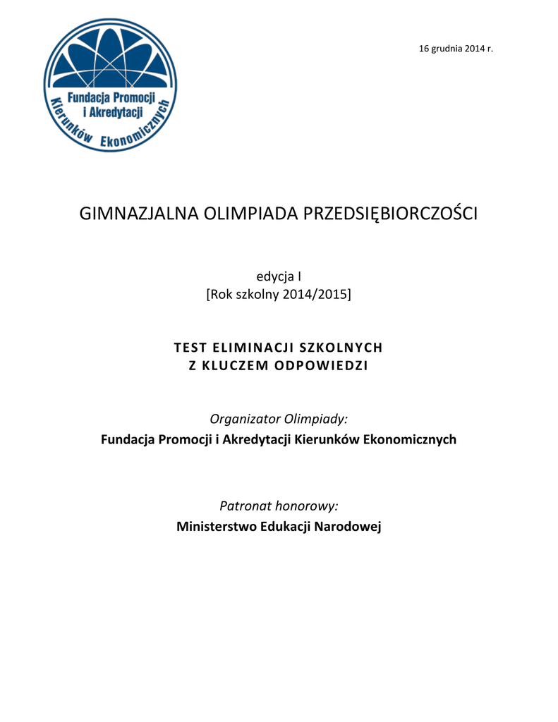 16 grudnia 2014 r. GIMNAZJALNA OLIMPIADA PRZEDSIĘBIORCZOŚCI edycja I [Rok szkolny 2014/2015] TEST ELIMINA CJI SZ KOLNYCH Z KLUCZ EM ODPOW IEDZ I Organizator Olimpiady: Fundacja Promocji i Akredytacji Kierunków Ekonomicznych Patronat honorowy: Ministerstwo Edukacji Narodowej Gimnazjalna Olimpiada Przedsiębiorczości – eliminacje szkolne, 16 grudnia 2014 r. www.gop.edu.pl Szanowni Zawodnicy Cieszymy się, że zdecydowaliście się na start w pierwszej edycji Gimnazjalnej Olimpiady Przedsiębiorczości. Mamy nadzieję, że udział w zawodach pozwoli Wam poszerzyć wiedzę z zakresu przedsiębiorczości oraz że przyniesie Wam i Waszym opiekunom merytorycznym dużo satysfakcji. Życzymy powodzenia. Organizatorzy Olimpiady Instrukcja do rozwiązywania testu Eliminacje szkolne Gimnazjalnej Olimpiady Przedsiębiorczości odbywają się 16 grudnia 2014 r., rozpoczęcie o godz. 9.00. Na rozwiązanie testu przeznacza się 45 minut. Czas odliczany jest od momentu zakończenia czytania instrukcji. Zawody odbywają się w warunkach kontrolowanej samodzielności. Komisja Szkolna może zdyskwalifikować zawodnika na skutek stwierdzenia niesamodzielności odpowiedzi lub niespełnienia warunków formalnych określonych w Regulaminie Gimnazjalnej Olimpiady Przedsiębiorczości i niniejszej instrukcji. Zabronione jest w szczególności: korzystanie podczas zawodów z telefonu komórkowego, z innego urządzenia telekomunikacyjnego, z urządzenia liczącego lub z urządzenia posiadającego wbudowaną pamięć, z tablic matematycznych; korzystanie z książek, słowników, notatek czy ściąg; odpisywanie czy porozumiewanie się pomiędzy zawodnikami podczas pisania testu; zmienianie miejsca podczas pisania testu lub zamienianie testu czy Arkusza Odpowiedzi z innymi osobami; rozwiązywanie testu ołówkiem. Test składa się z 30 pytań, w tym 15 łatwiejszych i 15 trudniejszych. Należy wybrać jedną, najlepszą, odpowiedź lub pole „nie udzielam odpowiedzi” i zaznaczyć niebieskim lub czarnym długopisem lub piórem na dołączonym do testu Arkuszu Odpowiedzi. Odpowiedzi nieprzeniesione do Arkusza Odpowiedzi nie będą oceniane. Maksymalnie można uzyskać 45 punktów. Za udzielenie prawidłowej odpowiedzi na pytanie łatwiejsze zawodnik otrzymuje +1 punkt, za wskazanie nieprawidłowej odpowiedzi zawodnik otrzymuje –0,5 punktu. Za zaznaczenie pola „nie udzielam odpowiedzi” zawodnik uzyskuje 0 punktów. Za udzielenie prawidłowej odpowiedzi na pytanie trudniejsze zawodnik otrzymuje +2 punkty, za wskazanie nieprawidłowej odpowiedzi zawodnik otrzymuje –0,5 punktu. Za zaznaczenie pola „nie udzielam odpowiedzi” zawodnik uzyskuje 0 punktów. Wszystkie poprawki w Arkuszu Odpowiedzi traktowane są jako odpowiedzi błędne. Zaznaczenie więcej niż jednego lub niezaznaczenie żadnego pola odpowiedzi traktowane jest jako odpowiedź błędna. Arkusz Odpowiedzi należy PODPISAĆ, a po zakończeniu rozwiązywania testu – oderwać wzdłuż perforacji od testu i oddać Komisji Szkolnej. Pytania testowe zawodnik może zatrzymać. Powodzenia! Gimnazjalna Olimpiada Przedsiębiorczości – eliminacje szkolne, 16 grudnia 2014 r. TEST 1. (1 pkt) Zgodnie z prawem popytu jeśli cena danego dobra rośnie: a) konsumenci są skłonni kupić więcej danego dobra, b) producenci są skłonni dostarczyć więcej danego dobra na rynek, c) konsumenci są skłonni kupić mniej danego dobra, d) producenci są skłonni dostarczyć mniej danego dobra na rynek. 2. (1 pkt) Najkorzystniejszą dla konsumentów strukturą rynkową jest: a) monopol, b) konkurencja doskonała, c) konkurencja monopolistyczna, d) oligopol. 3. (1 pkt) Narodowy Bank Polski nie pełni funkcji: a) banku banków, b) banku państwa, c) banku emisyjnego, d) banku komercyjnego. 4. (1 pkt) Dywidenda to: a) inaczej odsetki od kredytu, b) inaczej oprocentowanie lokat, c) zysk wypłacany posiadaczom akcji, d) zysk wypłacany posiadaczom obligacji. 5. (1 pkt) W polskim systemie podatkowym nie występuje stawka: a) 0% VAT, b) 18% PIT, c) 18% CIT, d) 32% PIT. 6. (1 pkt) Spółka akcyjna jest: a) spółką osobową, b) spółką osobowo-kapitałową, c) spółką kapitałową, d) żadna z odpowiedzi nie jest poprawna. 7. (2 pkt) Zgodnie z koncepcją 4P działania marketingowe nie dotyczą: a) promocji, b) produkcji, c) dystrybucji, d) ceny. 8. (1 pkt) W początkowej fazie procesu komunikacji najwięcej informacji przekazujemy za pomocą: a) słów, b) intonacji i sposobu mówienia, c) komunikatów wizualnych (np. gestów i mimiki), d) żadna z odpowiedzi nie jest poprawna. 9. (1 pkt) Umiejętność wyrażania swoich potrzeb bez lekceważenia potrzeb innych to: a) konformizm, b) asertywność, Gimnazjalna Olimpiada Przedsiębiorczości – eliminacje szkolne, 16 grudnia 2014 r. c) indywidualizm, d) przywództwo. 10. (2 pkt) Przedsiębiorstwo, które zatrudnia 47 pracowników, to: a) mikroprzedsiębiorstwo, b) małe przedsiębiorstwo, c) średnie przedsiębiorstwo, d) duże przedsiębiorstwo. 11. (2 pkt) W bilansie przedsiębiorstw po stronie pasywów zostaną zapisane: a) wkłady wspólników, b) zapasy, c) należności, d) majątek. 12. (1 pkt) Racjonalne gospodarowanie polega na: a) stawianiu właściwych celów, b) minimalizacji kosztów przy zakładanym rezultacie, c) maksymalizacji efektów przy zakładanych kosztach, d) wszystkie odpowiedzi są poprawne. 13. (1 pkt) Koszt alternatywny to: a) inaczej podatek od zysków przedsiębiorstw, b) koszt zmiany linii produkcyjnej, c) koszt zmiany pracownika, d) wartość potencjalnie utraconych możliwości. 14. (2 pkt) Na rynku pracy popyt tworzą: a) pracownicy, b) przedsiębiorcy, c) państwo, d) wszystkie odpowiedzi są poprawne. 15. (1 pkt) Curriculum vitae to inna nazwa: a) życiorysu, b) listu motywacyjnego, c) listu referencyjnego, d) żadna z odpowiedzi nie jest poprawna. 16. (1 pkt) Płatności dokonywane kartą: a) debetową są z reguły finansowane przez kredyt, którego udziela bank wydający kart