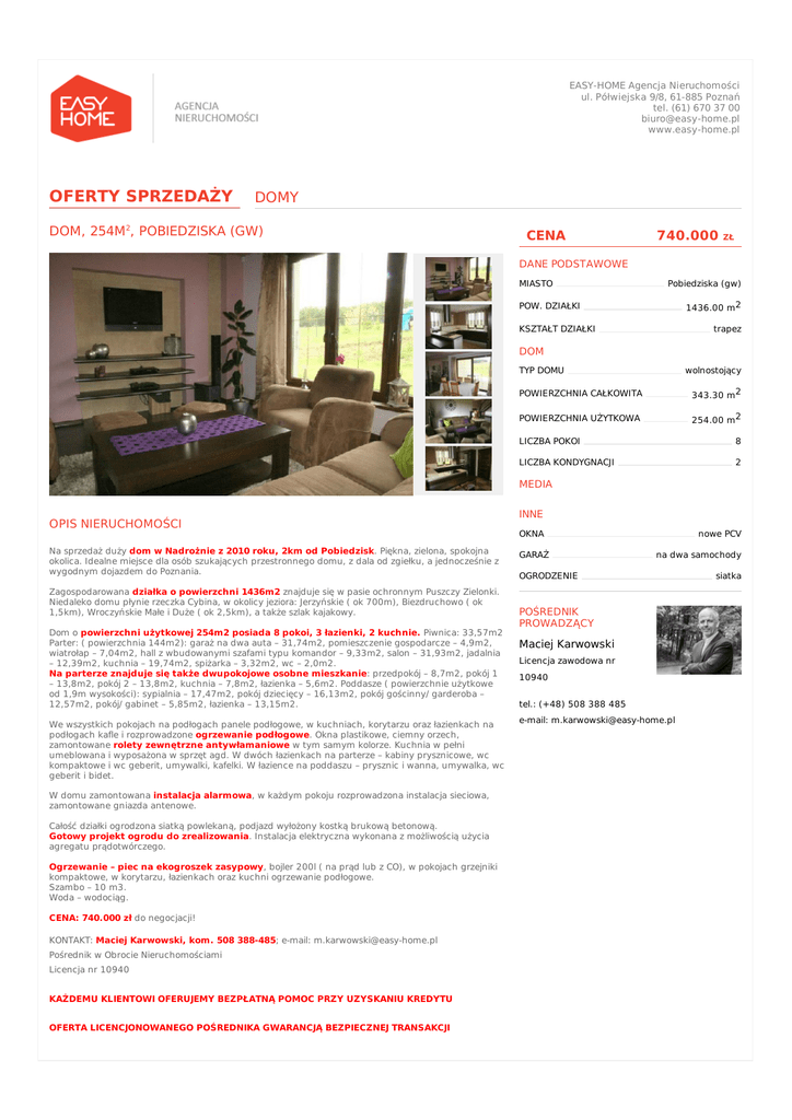 EASY-HOME Agencja Nieruchomości ul. Półwiejska 9/8, 61-885 Poznań tel. (61) 670 37 00 [email protected] www.easy-home.pl OFERTY SPRZEDAŻY DOMY DOM, 254M 2, POBIEDZISKA (GW) CENA 740.000 ZŁ DANE PODSTAWOWE MIASTO Pobiedziska (gw) 1436.00 m 2 POW. DZIAŁKI KSZTAŁT DZIAŁKI trapez DOM TYP DOMU wolnostojący POWIERZCHNIA CAŁKOWITA 343.30 m 2 POWIERZCHNIA UŻYTKOWA 254.00 m 2 LICZBA POKOI 8 LICZBA KONDYGNACJI 2 MEDIA OPIS NIERUCHOMOŚCI Na sprzedaż duży dom w Nadrożnie z 2010 roku, 2km od Pobiedzisk. Piękna, zielona, spokojna okolica. Idealne miejsce dla osób szukających przestronnego domu, z dala od zgiełku, a jednocześnie z wygodnym dojazdem do Poznania. Zagospodarowana działka o powierzchni 1436m2 znajduje się w pasie ochronnym Puszczy Zielonki. Niedaleko domu płynie rzeczka Cybina, w okolicy jeziora: Jerzyńskie ( ok 700m), Biezdruchowo ( ok 1,5km), Wroczyńskie Małe i Duże ( ok 2,5km), a także szlak kajakowy. Dom o powierzchni użytkowej 254m2 posiada 8 pokoi, 3 łazienki, 2 kuchnie. Piwnica: 33,57m2 Parter: ( powierzchnia 144m2): garaż na dwa auta – 31,74m2, pomieszczenie gospodarcze – 4,9m2, wiatrołap – 7,04m2, hall z wbudowanymi szafami typu komandor – 9,33m2, salon – 31,93m2, jadalnia – 12,39m2, kuchnia – 19,74m2, spiżarka – 3,32m2, wc – 2,0m2. Na parterze znajduje się także dwupokojowe osobne mieszkanie: przedpokój – 8,7m2, pokój 1 – 13,8m2, pokój 2 – 13,8m2, kuchnia – 7,8m2, łazienka – 5,6m2. Poddasze ( powierzchnie użytkowe od 1,9m wysokości): sypialnia – 17,47m2, pokój dziecięcy – 16,13m2, pokój gościnny/ garderoba – 12,57m2, pokój/ gabinet – 5,85m2, łazienka – 13,15m2. We wszystkich pokojach na podłogach panele podłogowe, w kuchniach, korytarzu oraz łazienkach na podłogach kafle i rozprowadzone ogrzewanie podłogowe. Okna plastikowe, ciemny orzech, zamontowane rolety zewnętrzne antywłamaniowe w tym samym kolorze. Kuchnia w pełni umeblowana i wyposażona w sprzęt agd. W dwóch łazienkach na parterze – kabiny prysznicowe, wc kompaktowe i wc geberit, umywalki, kafelki. W łazience na poddaszu – prysznic i wanna, umywalka, wc geberit i bidet. W domu zamontowana instalacja alarmowa, w każdym pokoju rozprowadzona instalacja sieciowa, zamontowane gniazda antenowe. Całość działki ogrodzona siatką powlekaną, podjazd wyłożony kostką brukową betonową. Gotowy projekt ogrodu do zrealizowania. Instalacja elektryczna wykonana z możliwością użycia agregatu prądotwórczego. Ogrzewanie – piec na ekogroszek zasypowy, bojler 200l ( na prąd lub z CO), w pokojach grzejniki kompaktowe, w korytarzu, łazienkach oraz kuchni ogrzewanie podłogowe. Szambo – 10 m3. Woda – wodociąg. CENA: 740.000 zł do negocjacji! KONTAKT: Maciej Karwowski, kom. 508 388-485; e-mail: [email protected] Pośrednik w Obrocie Nieruchomościami Licencja nr 10940 KAŻDEMU KLIENTOWI OFERUJEMY BEZPŁATNĄ POMOC PRZY UZYSKANIU KREDYTU OFERTA LICENCJONOWANEGO POŚREDNIKA GWARANCJĄ BEZPIECZNEJ TRANSAKCJI INNE OKNA GARAŻ nowe PCV na dwa samochody OGRODZENIE POŚREDNIK PROWADZĄCY Maciej Karwowski Licencja zawodowa nr 10940 tel.: (+48) 508 388 485 e-mail: [email protected] siatka