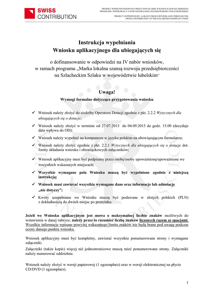 PROJEKT WSPÓŁFINANSOWANY PRZEZ SZWAJCARIĘ W RAMACH SZWAJCARSKIEGO PROGRAMU WSPÓŁPRACY Z NOWYMI KRAJAMI CZŁONKOWSKIMI UNII EUROPEJSKIEJ PROJECT SUPPORTED BY A GRANT FROM SWITZERLAND THROUGH THE SWISS CONTRIBUTION TO THE ENLARGED EUROPEAN UNION Instrukcja wypełniania Wniosku aplikacyjnego dla ubiegających się o dofinansowanie w odpowiedzi na IV nabór wniosków, w ramach programu „Marka lokalna szansą rozwoju przedsiębiorczości na Szlacheckim Szlaku w województwie lubelskim” Uwaga! Wymogi formalne dotyczące przygotowania wniosku Wniosek należy złożyć do siedziby Operatora Dotacji zgodnie z pkt. 2.2.2 Wytycznych dla ubiegających się o dotacje; Wniosek należy złożyć w terminie od 27.07.2015 do 04.09.2015 do godz. 15.00 (decyduje data wpływu do OD); Wniosek należy wypełnić na komputerze w języku polskim na obowiązującym formularzu; Wniosek należy złożyć zgodnie z pkt. 2.2.1 Wytycznych dla ubiegających się o dotacje dot. formy składania wniosku i obowiązkowych załączników; Wniosek aplikacyjny musi być podpisany przez osobę/osoby upoważnioną/upoważnione we wszystkich wskazanych miejscach; Wszystkie wymagane pola Wniosku muszą być wypełnione zgodnie z niniejszą instrukcją; Wniosek musi zawierać wszystkie wymagane dane oraz informacje lub adnotację „nie dotyczy”; Kwoty uzupełniane we Wniosku muszą być podawane w złotych polskich (PLN) z dokładnością do dwóch miejsc po przecinku. Jeżeli we Wniosku aplikacyjnym jest mowa o maksymalnej liczbie znaków możliwych do wstawienia w danej rubryce, należy przez to rozumieć liczbę znaków liczonych razem ze spacjami. Wszelkie informacje wpisane powyżej wskazanego limitu znaków nie będą brane pod uwagę podczas oceny danego punktu wniosku. Wniosek aplikacyjny musi być kompletny, zawierać wszystkie ponumerowane strony i wymagane załączniki. Załączniki (także kopie) więcej niż jednostronicowe muszą mieć ponumerowane strony. Załączniki należy numerować oddzielnie. Wniosek należy złożyć w wersji papierowej (1 egzemplarz) oraz w wersji elektronicznej na płycie CD/DVD (1 egzemplarz). 1 PROJEKT WSPÓŁFINANSOWANY PRZEZ SZWAJCARIĘ W RAMACH SZWAJCARSKIEGO PROGRAMU WSPÓŁPRACY Z NOWYMI KRAJAMI CZŁONKOWSKIMI UNII EUROPEJSKIEJ PROJECT SUPPORTED BY A GRANT FROM SWITZERLAND THROUGH THE SWISS CONTRIBUTION TO THE ENLARGED EUROPEAN UNION Płyta CD/DVD powinna zawierać: 1) Wniosek aplikacyjny (w formacie edytora tekstu Word), 2) Budżet (w formacie arkusza kalkulacyjnego Excel), 3) Harmonogram realizacji projektu (w formacie arkusza kalkulacyjnego Excel), 4) Biznesplan/Plan projektu (w formacie edytora tekstu Word) - właściwy dla Wnioskodawcy wraz z częścią finansową (w formacie arkusza kalkulacyjnego Excel). 5) Skany wszystkich wymaganych dokumentów (wniosku wraz z załącznikami) składanych w wersji papierowej, tj. skany dokumentów wypełnionych i podpisanych. Przedmiotowe skany należy zapisać w osobnych plikach w formacie PDF. Każdy z dokumentów należy zapisać w oddzielnym pliku, z nazwą pozwalającą na jego szybką identyfikację (np. nazwa pliku rozpoczynająca się od nazwy załącznika). Dokumenty złożone w formie elektronicznej muszą zawierać identyczną treść jak dokumenty złożone w wersji papierowej. W przeciwnym razie wniosek zostanie odrzucony na etapie oceny formalnej. Płytę należy opisać poprzez podanie nazwy Wnioskodawcy i tytułu projektu. Płyty CD/DVD powinny być umieszczone w kopercie. Wniosek wraz z załącznikami i płytą CD/DVD musi być umieszczony w segregatorze! Segregator, w którym umieszczony jest wniosek musi być opisany na grzbiecie zgodnie z Załącznikiem nr 1 do niniejszej Instrukcji. Dokumentów nie należy umieszczać w plastikowych „koszulkach” i skoroszytach. Załączniki w formie kopii muszą zostać potwierdzone „za zgodność z oryginałem” przez Wnioskodawcę lub osobę/y uprawnioną/e do reprezentowania Wnioskodawcy, zgodnie z zasadami reprezentacji (tj. podpisane przez osobę/osoby wskazane do reprezentacji w dokumencie rejestrowym lub pełnomocnika upoważnionego w załączonym do wniosku upoważnieniu lub kopii pełnomocnictwa potwierdzonej za zgodność z oryginałem przez Wnioskodawcę). Poprzez potwierdzenie za zgodność z oryginałem rozumie się umieszczenie klauzuli „zgodne z oryginałem” lub „za zgodność z oryginałem” na każdej stronie dokumentu wraz z datą i czytelnym podpisem (lub podpisem nieczytelnym wraz z imienną pieczęcią) Wnioskodawcy lub osoby reprezentującej Wnioskodawcę. W przypadku dokumentu składającego się z więcej niż jednej strony istnieje możliwość potwierdzenia za zgodność z oryginałem poprzez zastosowanie wspomnianej klauzuli z podpisem tylko na pierwszej stronie oraz ze wskazaniem zakresu stron (np. od str. … do str. dokument potwierdzany za zgodność z oryginałem w takiej formie musi stanowić całość i ponumerowane strony. jego wraz …) mieć Informacje podane we Wniosku aplikacyjnym muszą być spójne z załączonymi do niego załącznikami. Niedopuszczalne jest dokonywanie zmian treści formularza Wniosku aplikacyjnego i załączników, usuwanie opisów poszczególnych części Wniosku, logotypów itp. Wnioski aplikacyjne, które nie będą spełniały powyższych wymogów zostaną odrzucone na etapie oceny formalnej. 2 PROJEKT WSPÓŁFINANSOWANY PRZEZ SZWAJCARIĘ W RAMACH SZWAJCARSKIEGO PROGRAMU WSPÓŁPRACY Z NOWYMI KRAJAMI CZŁONKOWSKIMI UNII EUROPEJSKIEJ PROJECT SUPPORTED BY A GRANT FROM SWITZERLAND THROUGH THE SWISS CONTRIBUTION TO THE ENLARGED EUROPEAN UNION OBJAŚNIENIA POSZCZEGÓLNYCH CZĘŚĆI WNIOSKU: Wypełnia Operator Dotacji– Fundacja Fundusz Lokalny im. Jana III Sobieskiego: Strona tytułowa: - Data przyjęcia wniosku - Podpis pracownika przyjmującego wniosek i pieczęć - Numer ewidencyjny wniosku Wypełnia Wnioskodawca: I. Wnioskodawca 1. Dane Wnioskodawcy 1.1. Identyfikacja Wnioskodawcy 1.1.1. Nazwa Wnio