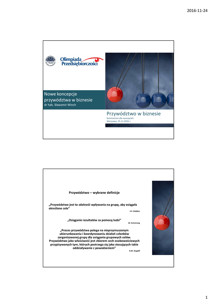 2016-11-24 Nowe koncepcje przywództwa w biznesie dr hab. Sławomir Winch Przywództwo w biznesie Seminarium dla nauczycieli Warszawa, 25.11.2016 r. Przywództwo – wybrane definicje „Przywództwo jest to zdolność wpływania na grupę, aby osiągała określone cele” S.P. Robbins „Osiąganie rezultatów za pomocą ludzi” M. Armstrong „Proces przywództwa polega na nieprzymuszonym ukierunkowaniu i koordynowaniu działań członków zorganizowanej grupy dla osiągania grupowych celów. Przywództwo jako właściwość jest zbiorem cech osobowościowych przypisywanych tym, których postrzega się jako stosujących takie oddziaływanie z powodzeniem” R.M. Stogdill 1 2016-11-24 Zarządzanie Organizowanie Planowanie Motywowanie Kontrolowanie Przywództwo Wpływanie Mobilizowanie Wytyczanie kierunków Menedżera pracownicy słuchają bo muszą a przywódcę, ponieważ chcą. P. Drucker 2 2016-11-24 WŁADZA PRZYWÓDZTWO WŁADZA Definicje Uprawomocnienie Przywództwo PRZYWÓDZTWO • Zachowania A wpływają na zachowania B • Efekt procesu wymiany i umiejętności negocjacyjnych • Charyzma • Tradycja • Prawo - biurokracja • Władza pozytywna – dbałość formułowanie i realizację celów grupowych oraz organizacji • Pomijanie potrzeby dominacji 3 2016-11-24 Tradycyjne paradygmaty przywództwa Paradygmat Osoba podejmująca decyzje Proces podejmowania decyzji Style Klasyczny Przywódca Przywódca Autorytarny Transakcyjny Przywódca Konsultacje z innymi Konsultacje Wizjonerski Przywódca Zaangażowanie całej grupy Konsensus Organiczny Grupa Grupa lub poszczególne osoby Wspólne uzgodnienia Tradycyjne koncepcje przywództwa Wielkich ludzi Cech Zachowań • Pochodzenie decyduje o zdolnościach przywódczych • Przywódcy różnią się od innych ludzi • Zadaniowe – co zrobić? • Relacyjne – zachowania w kontaktach z innymi 4 2016-11-24 Sytuacyjne • Dostosowanie stylu przywództwa do poziomu rozwoju pracownika (instruowanie, coaching, wspieranie, delegowanie) Ścieżki do celu • Wzmacnianie powiązań między wysiłkami, wynikami i rezultatami – usuwanie przeszkód Współczesne koncepcje przywództwa Transformacyjne • Dostosowanie stylu przywództwa do poziomu rozwoju pracownika (instruowanie, coaching, postawy, wspieranie, delegowanie). Substytuty przywództwa • Kultura organizacyjna, kwalifikacje, zarządzanie wiedzą, otoczenie firmy, rutynowy charakter pracy, sieciowe struktury organizacji. 5 2016-11-24 Kultura Wartości – to, co atrakcyjne i ważne Normy – sposób realizacji wartości Typologia kultur - F. Trompenaars, CH. Hampden – Turner Równość Inkubator samodzielne określanie celów Osoba Rodzina zaufanie, brak formalnych reguł Pocisk sterowany podporządkowan ie celom, zespół Wieża Eiffla Zadania regulamin, zachowanie status quo Hierarchia 6 2016-11-24 Wybrane wymiary kultury organizacyjnej Indywidualizm vs kolektywizm Duży vs mały dystans władzy Partykularyzm vs uniwersalizm Orientacja na przeszłość vs orientacja na przyszłość Style kierowania Orientacja na pracowników Orientacja na zadania 7 2016-11-24 Siatka kierownicza – tradycyjne ujęcie Klubowy styl przywództwa Duża 9 Pośredni styl przywództwa Zespołowy styl przywództwa 1,9 9,9 T r o s k a o lu d zi 8 7 6 5,5 5 4 3 Mała 2 1 1,1 1 Zubożony styl przywództwa 2 3 4 5 Troska o produkcję 6 7 8 9,1 9 Styl przywództwa nastawiony na zadania Współczesne ujęcie Forsujące – presja na wynik i kontrolę Operacyjne – nacisk na bieżące działania i wydajność pracy Przywództwo Aktywizujące – dzielenie się władzą, inspirowanie, wspieranie Strategiczne – koncentracja na długofalowej strategii i wizji 8 2016-11-24 Wybrane wyniki badań Tabela Lokalizacja źródeł wpływu – przywódca czy procedury? (w %) Kategorie Atmosfera w pracy Integracja zespołu Motywacja do pracy Zaangażowanie w pracę Awans pracowników Formułowanie celów firmy Ocena pracowników Premie dla pracowników Obieg informacji w firmie Kontrola pracy Ludzie Procedury 92 0 69 6 21 4 31 90 63 62 1 2 59 13 40 19 17 31 56 25 W równym stopniu ludzie i procedury 8 8 32 25 7 36 22 55 36 50 Procenty, w niektórych wierszach nie sumują się do 100, ponieważ w tabeli nie uwzględniono braków danych. Źródło: opracowanie własne 9 2016-11-24 Tabela . Waga realizacji wybranych funkcji przywódców (w %) Kategorie Duże znaczenie Branie odpowiedzialność w sytuacjach kryzysowych 93 Motywowanie pracowników 94 Bycie wzorem moralnego postępowania 83 Współpraca z interesariuszami 76 Integrowanie zespołu 71 Formułowanie wizji rozwoju 65 Stawianie dobra ogółu na równi z własnym 60 Współpraca z innymi działami firmy 73 Podejmowanie ryzyka zmiany organizacyjnej 67 Udzielanie wsparcia merytorycznego 62 Wspieranie w trudnych sytuacjach życiowych 5 4,5 26 Styl przywództwa – średnia arytmetyczna 4,63 4 4 3,5 3,35 3 3,21 2,5 2 1,5 1 0,5 0 Strategiczny Operacyjny Forsujący Aktywizujący 10 2016-11-24 Tabela. Dystans władzy a aktywizujący styl kierowania (w %) Natężenie stylu aktywizującego Duże Średnie Małe Razem Stopień małego dystansu władzy duży średni mały 18 23 53 76 55 6 22 100 100 41 6 100 Źródło: opracowanie własne. Tabela . Stopień zaufania do zarządu a aktywizujący styl kierowania (w %) Natężenie stylu aktywizującego Duże Średnie Małe Razem Stopień zaufania do zarządu duży 77 17 6 100 średni 67 26 7 100 mały 55 28 17 100 Źródło: opracowanie własne 11 2016-11-24 Tabela . Stopień przejrzystości zasad a strategiczny styl kierowania (w %) Natężenie stylu strategicznego Duże Średnie Małe Razem Stopień przejrzystości zasad duży 81 13 6 100 średni 71 24 5 100 mały 81 13 6 100 Źródło: opracowanie własne Dziękuję za uwagę! dr hab. Sławomir Winch e-mail: [email protected] Przywództwo w biznesie Seminarium dla nauczycieli Warszawa, 25.11.2016 r. Wszystkie prawa zastrzeżone na rzecz Fundacji Promocji i Akredytacji Kier