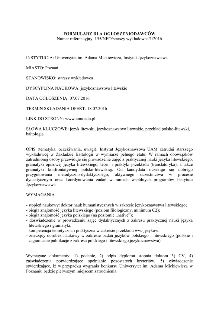 FORMULARZ DLA OGŁOSZENIODAWCÓW Numer referencyjny: 155/NEO/starszy wykładowca/1/2016 INSTYTUCJA: Uniwersytet im. Adama Mickiewicza, Instytut Językoznawstwa MIASTO: Poznań STANOWISKO: starszy wykładowca DYSCYPLINA NAUKOWA: językoznawstwo litewskie DATA OGŁOSZENIA: 07.07.2016 TERMIN SKŁADANIA OFERT: 18.07.2016 LINK DO STRONY: www.amu.edu.pl SŁOWA KLUCZOWE: język litewski, językoznawstwo litewskie, przekład polsko-litewski, bałtologia OPIS (tematyka, oczekiwania, uwagi): Instytut Językoznawstwa UAM zatrudni starszego wykładowcę w Zakładzie Bałtologii w wymiarze pełnego etatu. W ramach obowiązków zatrudnionej osoby przewiduje się prowadzenie zajęć z praktycznej nauki języka litewskiego, gramatyki opisowej języka litewskiego, teorii i praktyki przekładu (translatoryka), a także gramatyki konfrontatywnej polsko-litewskiej. Od kandydata oczekuje się dobrego przygotowania metodyczno-dydaktycznego, aktywnego uczestnictwa w procesie dydaktycznym oraz koordynowania zadań w ramach wspólnych programów Instytutu Językoznawstwa. WYMAGANIA - stopień naukowy: doktor nauk humanistycznych w zakresie językoznawstwa litewskiego; - biegła znajomość języka litewskiego (poziom filologiczny, minimum C2); - biegła znajomość języka polskiego (na poziomie „native”); - doświadczenie w prowadzeniu zajęć dydaktycznych z zakresu praktycznej nauki języka litewskiego i gramatyki; - kompetencja teoretyczna i praktyczna w zakresie przekładu ww. języków; - znaczący dorobek naukowy w zakresie badań języków polskiego i litewskiego (polskie i zagraniczne publikacje z zakresu polskiego i litewskiego językoznawstwa). Wymagane dokumenty: 1) podanie, 2) odpis dyplomu stopnia doktora 3) CV, 4) zaświadczenia potwierdzające spełnianie pozostałych kryteriów, 5) oświadczenie stwierdzające, iż w przypadku wygrania konkursu Uniwersytet im. Adama Mickiewicza w Poznaniu będzie pierwszym miejscem zatrudnienia. . II. FORM FOR EMPLOYERS No: 155/NEO/starszy wykładowca/1/2016 INSTITUTION Adam Mickiewicz University, Institute of Linguistics CITY Poznań POSITION senior lecturer DISCIPLINE Lithuanian linguistics POSTED 07.07.2016 EXPIRES 18.07.2016 WEBSITE www.amu.edu.pl KEY WORDS Lithuanian language, Lithuanian linguistics, Polish-Lithuanian Translation, Baltic Studies DESCRIPTION (field, expectations, comments): Institute of Linguistics is seeking a full-time senior lecturer in the Department of Baltic Studies. The person employed as senior lecturer will be expected to perform classes/ lectures of practical learning the Lithuanian language, Lithuanian grammar, the theory and practice of translation, as well as Polish-Lithuanian contrastive grammar. The successful candidate is also expected to prepare methodical teaching, active participation in the teaching process, and to coordinate tasks within the programs of the Institute of Linguistics. REQUIREMENTS: - scientific degree PHD of Lithuanian linguistics; - fluent Lithuanian (philological level, minimum C2); - fluent Polish (native speaker level); - experience in teaching in the field of Lithuanian language and grammar; - theoretical and practical competence in the Polish-Lithuanian translation; - significant scientific publications in the research of Polish and Lithuanian (Polish and foreign publications in the Polish and Lithuanian linguistics); Required documents: 1) application, 2) PhD certificate, 3) CV, 4) certificate confirming the fulfillment of the other criteria, 5) a statement that the Institute of Linguistics will be the primary place of work.