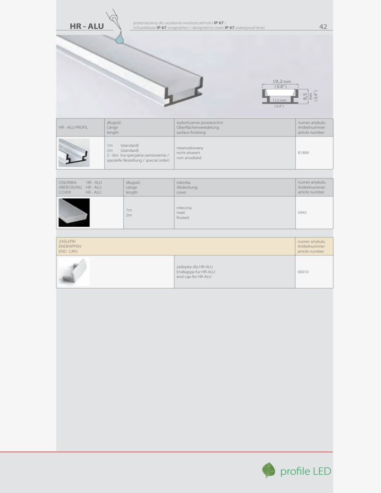 przeznaczony do uzyskania wodoszczelności IP 67 / Schutzklasse IP 67 vorgesehen / designed to meet IP 67 waterproof level HR - ALU 42 mm mm ( 0.4” ) ( 0.8” ) 11,2 mm ( 0.4” ) HR - ALU PROFIL OSŁONKA HR - ALU ABDECKUNG HR - ALU COVER HR - ALU długość Länge length wykończenie powierzchni Oberflächenveredelung surface finishing numer artykułu Artikelnummer article number 1m (standard) 2m (standard) 2 - 6m (na specjalne zamówienie / spezielle Bestellung / special order) nieanodowany nicht eloxiert non anodized B1889 długość Länge length osłonka Abdeckung cover numer artykułu Artikelnummer article number 1m 2m mleczna matt frosted 0945 numer artykułu Artikelnummer article number ZAŚLEPKI ENDKAPPEN END CAPs zaślepka dla HR-ALU Endkappe fur HR-ALU end cap for HR-ALU 00010 profile LED HR - ALU PL przeznaczony do uzyskania wodoszczelności IP 67 / S chutzklasse IP 67 vorgesehen / designed to meet IP 67 waterproof level 43 Przeznaczenie: -- dla oświetlenia typu LED, na paskach miękkich -- do montażu w płaszczyznach podłóg -- konstrukcja profilu przy zastosowaniu w podłodze przewiduje standardowe obciążenia i czynności konserwacyjno - użytkowe -- wysokość przekroju oprawy pozwala na montaż w szczelinie wytworzonej przez przeciętną grubość -- płytek ceramicznych i kleju. -- do zastosowań w budownictwie, architekturze krajobrazu : ogrody, identyfikacja świetlna przestrzeni publicznej, ciągi komunikacyjne, fasady budynków, baseny Opis produktu: Mocowanie : kleje montażowe ; klej do ceramiki Zakończenie profilu : zalecamy SILIKON NEUTRALNY, firmy DOW CORNING 794 Certyfikat / Patent : CE, wzór chroniony Zalety: małe rozmiary, przeznaczony do uzyskania wodoszczelności IP 67, wytrzymałość mechaniczna na standardowe obciążenia przyjęte dla podłóg, profil przyjazny środowisku DE Anwendung: -- für LED Beleuchtung, mit flex-Bändern -- für Bodenmontage mit Standartbelastung (begehbar) -- Vielseitige Anwendungsmöglichkeiten: Tiefbau, Landschaftsarchitektur, Lichtlinienmarkierung in öffentlichen Räumen, Gebäudefassaden, Schwimmbäder -- Die Höhe des Profils erlaubt es in eine Fuge eingebettet zu werden, da zusammen mit den Fliesen und Fliesenkleber eine bündige Oberfläche entsteht. Produktbeschreibung: Befestigung: Montageklebstoff, Fliesenkleber Abschlusskappe: wir empfehlen Sylikonklebstoff (DOW CORNING 794, farblos) Zertifikat / Patent: CE, geschütztes Profil Vorteile: Klein in der Vermassung, Schutzklasse IP 67 vorgesehen, mechanisch belastbar durch Standartbegehung, umweltfreundlich * Die Angaben in unseren Flyer entsprechen dem Stand bei Drucklegung, sind unverbindlich und sollen ausschliesslich Informationszwecken dienen. Wir behalten uns vor, jederzeit Änderungen an unseren Produkten vorzunehmen. HR - ALU EN przeznaczony do uzyskania wodoszczelności IP 67 / Schutzklasse IP 67 vorgesehen / designed to meet IP 67 waterproof level 44 Applications : -- for flexible or hard LED strips -- floor surfaces -- very small spaces, as narrow as the thickness of a tile and layer of glue -- construction, landscape architecture: gardens, road line marking, swimming pools, building facades etc. Product Description : Mounting: mounting glue, ceramic glue Ending Element: recommended – DOW CORNING 794, transparent Certificate / Patent: CE, Patent rights Advantages : Compact size, designed to meet IP 67 waterproof level, profile construction makes it durable and sturdy, resistant to standard loads, environment friendly * We reserve the right to change and modify our products. LED profiles HR - ALU przeznaczony do uzyskania wodoszczelności IP 67 / S chutzklasse IP 67 vorgesehen / designed to meet IP 67 waterproof level 45