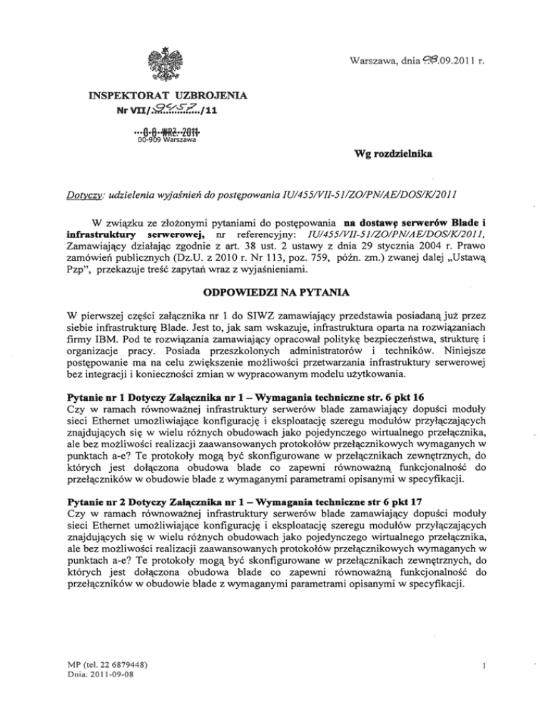 Warszawa, dnia 9.09.2011 r. INSPEKTORAT UZBROJENIA /11 Nr OO-909 Warszawa Wg rozdzielnika Dotyczy.” udzielenia wyjaśnień do postępowania IU/455/VII-5 1/ZO/PN/A E/DOS/K/2011 W związku ze złożonymi pytaniami do postępowania na dostawę serwerów Blade i infrastruktury serwerowej, nr referencyjny: IU/455/VII-5 1/ZO/PN/A E/DOS/K/2011, Zamawiający działając zgodnie z art. 38 ust. 2 ustawy z dnia 29 stycznia 2004 r. Prawo zamówień publicznych (Dz.U. z 2010 r. Nr 113, poz. 759, późn. zm.) zwanej dalej „Ustawą Pzp”, przekazuje treść zapytań wraz z wyjaśnieniami. ODPOWIEDZI NA PYTANIA W pierwszej części załącznika nr 1 do SIWZ zamawiający przedstawia posiadaną już przez siebie infrastrukturę Blade. Jest to, jak sam wskazuje, infrastruktura oparta na rozwiązaniach firmy IBM. Pod te rozwiązania zamawiający opracował politykę bezpieczeństwa, strukturę i organizacje pracy. Posiada przeszkolonych administratorów i techników. Niniejsze postępowanie ma na celu zwiększenie możliwości przetwarzania infrastruktury serwerowej bez integracji i konieczności zmian w wypracowanym modelu użytkowania. Pytanie nr 1 Dotyczy Załącznika nr 1 Wymagania techniczne str. 6 pkt 16 Czy w ramach równoważnej infrastruktury serwerów blade zamawiający dopuści moduły sieci Ethernet umożliwiające konfigurację i eksploatację szeregu modułów przyłączających znajdujących się w wielu różnych obudowach jako pojedynczego wirtualnego przełącznika, ale bez możliwości realizacji zaawansowanych protokołów przełącznikowych wymaganych w punktach a-e? Te protokoły mogą być skonfigurowane w przełącznikach zewnętrznych, do których jest dołączona obudowa blade co zapewni równoważną funkcjonalność do przełączników w obudowie blade z wymaganymi parametrami opisanymi w specyfikacji. — Pytanie nr 2 Dotyczy Załącznika nr 1 Wymagania techniczne str6 pkt 17 Czy w ramach równoważnej infrastruktury serwerów blade zamawiaj ący dopuści moduły sieci Ethernet umożliwiające konfigurację i eksploatację szeregu modułów przyłączających znajdujących się w wielu różnych obudowach jako pojedynczego wirtualnego przełącznika, ale bez możliwości realizacji zaawansowanych protokołów przełącznikowych wymaganych w punktach a-e? Te protokoły mogą być skonfigurowane w przełącznikach zewnętrznych, do których jest dołączona obudowa blade co zapewni równoważną funkcjonalność do przełączników w obudowie blade z wymaganymi parametrami opisanymi w specyfikacji. — MP (tel. 22 6879448) Dnia: 2011-09-08 Pytanie nr 3 Dotyczy Zahcznika nr 1 Wymagania techniczne str 6 pkt 16 i 17 (co najmniej) Zamawiający formułując wymagania co najmniej jak we wskazanych punktach ogranicza konkurencyjność składania ofert do jednego producenta sprzętu. Dopuszczenie większej ilości dostawców dałoby możliwości osiągnięcia lepszej ceny za porównywalne rozwiązania. Czy Zamawiający po to sformułował warunki równoważności, aby były one spełniane tylko przez jednego a przez wielu producentów? — Pytanie nr 4 Dotyczy Zalącznika nr 1 Wymagania techniczne str 3 pkt 3 Czy zamawiający zaakceptuje rozwiązanie równoważne, w którym proces tworzenia kopii zapasowej oraz odtwarzania danych jest procesem transakcyjnym realizowanym mechanizmami aplikacji, których dane są zabezpieczane? Dotyczy to aplikacji wspierających takie mechanizmy. — Pytanie nr 5 Dotyczy Załącznika nr 1 Wymagania techniczne str 3 pkt 4 Czy Zamawiający zaakceptuje rozwiązanie równoważne, w którym wykonanie mirroringu jest realizowane na poziomie usługi klastrowej lub na poziomie macierzy dyskowej na której przechowywanajest baza danych? — Pytanie nr 6 Dotyczy Załącznika nr 1 Wymagania techniczne str 3 pkt 14 Czy Zamawiający zaakceptuje rozwiązanie równoważne, w którym restart odtwarzania danych następuje poprzez ponowienie sesji backup, gwarantując w ten sposób spójność danych? Pytanie nr 7 Dotyczy Załącznika nr 1 Wymagania techniczne str 3 pkt 17 Czy Zamawiający zaakceptuje rozwiązanie równoważne, w którym restart odtwarzania danych następuje poprzez ponowienie sesji backup, gwarantując w ten sposób spójność danych? — Pytanie nr 8 Dotyczy calego Załącznika nr 1 Wymagania techniczne Czy Zamawiający dopuszcza zmianę treści całego załącznika nr 1 Wymagania techniczne na treść poniżej zawartą z jednoczesnym zaznaczeniem, że są to wymagania minimalne dla dostarczanej platformy? — — Rozwiązanie klasy HP BladeSystem Matrix pozwalające osiągnąć najwyższy poziom wykorzystania infrastruktury i realizować więcej zadań przy użyciu mniej szej liczby zasobów fizycznych i osobowych. Jest to możliwe dzięki wbudowanym funkcjom planowania wydajności i alokacji zasobów „just in time” dostępnych w ramach oprogramowania HP Insight Software. Znaczne oszczędności uzyskuje się, ograniczając rozrost infrastruktury serwerów oraz liczbę serwerów niezbędną do zaspokojenia rosnących potrzeb aplikacyjnych poprzez wdrożenie technologii BladeSystem następnej generacji. Mniej sza liczba podzespołów gwarantuj e większą wydajność i funkcjonalność. Po wdrożeniu platformy typu HP BladeSystem Matrix koszty kapitałowe znacznie się obniżają w porównaniu z analogiczną konfiguracją serwerów nabywanych oddzielnie. Platforma klasy HP BladeSystem Matrix musi wskazać, co najmniej: najbardziej optymalny stopień wykorzystania serwerów najbardziej optymalny stopień wykorzystania pamięci masowej najbardziej optymalny stopień wykorzystania skonsolidowanych urządzeń sieciowych wprowadzić model najbardziej optymalnych kosztów utrzymania infrastruktury IT Wymagane są zautomatyzowane funkcje aranżacji i orkiestracji zasobów dostępne jak w HP Insight Orchestration które pomagają przyspieszyć procesy zarządzania, wprowadzić standaryzację konfiguracji i skrócić czas wdrażania usług IT bez powodowa