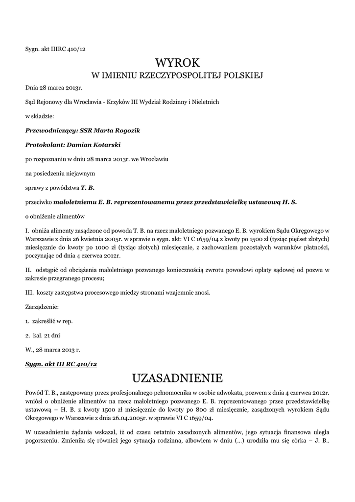 Sygn. akt IIIRC 410/12 WYROK W IMIENIU RZECZYPOSPOLITEJ POLSKIEJ Dnia 28 marca 2013r. Sąd Rejonowy dla Wrocławia - Krzyków III Wydział Rodzinny i Nieletnich w składzie: Przewodniczący: SSR Marta Rogozik Protokolant: Damian Kotarski po rozpoznaniu w dniu 28 marca 2013r. we Wrocławiu na posiedzeniu niejawnym sprawy z powództwa T. B. przeciwko małoletniemu E. B. reprezentowanemu przez przedstawicielkę ustawową H. S. o obniżenie alimentów I. obniża alimenty zasądzone od powoda T. B. na rzecz małoletniego pozwanego E. B. wyrokiem Sądu Okręgowego w Warszawie z dnia 26 kwietnia 2005r. w sprawie o sygn. akt: VI C 1659/04 z kwoty po 1500 zł (tysiąc pięćset złotych) miesięcznie do kwoty po 1000 zł (tysiąc złotych) miesięcznie, z zachowaniem pozostałych warunków płatności, poczynając od dnia 4 czerwca 2012r. II. odstąpić od obciążenia małoletniego pozwanego koniecznością zwrotu powodowi opłaty sądowej od pozwu w zakresie przegranego procesu; III. koszty zastępstwa procesowego miedzy stronami wzajemnie znosi. Zarządzenie: 1. zakreślić w rep. 2. kal. 21 dni W., 28 marca 2013 r. Sygn. akt III RC 410/12 UZASADNIENIE Powód T. B., zastępowany przez profesjonalnego pełnomocnika w osobie adwokata, pozwem z dnia 4 czerwca 2012r. wniósł o obniżenie alimentów na rzecz małoletniego pozwanego E. B. reprezentowanego przez przedstawicielkę ustawową – H. B. z kwoty 1500 zł miesięcznie do kwoty po 800 zł miesięcznie, zasądzonych wyrokiem Sądu Okręgowego w Warszawie z dnia 26.04.2005r. w sprawie VI C 1659/04. W uzasadnieniu żądania wskazał, iż od czasu ostatnio zasadzonych alimentów, jego sytuacja finansowa uległa pogorszeniu. Zmieniła się również jego sytuacja rodzinna, albowiem w dniu (...) urodziła mu się córka – J. B.. Dodatkowo z uwagi na zamieszkanie małoletniego pozwanego we W., wzrosły ponoszone przez niego koszty związane z realizacją kontaktów z synem. W odpowiedzi na pozew pozwany reprezentowany przez przedstawicielkę ustawową H. B., zastępowany przez profesjonalnego pełnomocnika w osobie adwokata wniósł o oddalenie powództwa oraz zasadzenie od powoda na rzecz pozwanego zwrotu kosztów postępowania, w tym kosztów zastępstwa procesowego według norm przepisanych. W uzasadnieniu wskazał, że od czasu ustalenia alimentów na rzecz małoletniego pozwanego, jego koszty utrzymania wzrosły. Pojawiły się koszty związane z obowiązkiem szkolnym, zajęciami dodatkowymi, wzrostowi uległy koszty leczenia, pojawiła się konieczność leczenia stomatologicznego. Pełnomocnik pozwanego zakwestionował również, że sytuacja finansowa powoda uległa pogorszeniu. Sąd ustalił następujący stan faktyczny: Małoletni E. B. ur. (...) jest synem H. i T. B., urodził się w trakcie trwania ich związku małżeńskiego dowód: odpis skrócony aktu urodzenia małoletniego w aktach sprawy Sądu Okręgowego w Warszawie o sygn. akt: VI C 1659/04; Prawomocnym wyrokiem z dnia 26 kwietnia 2005r. wydanym w sprawie sygn. akt VI C 1659/04 Sąd Okręgowy w Warszawie rozwiązał małżeństwo T. i H. B. bez orzekania o winie. Wykonywanie władzy rodzicielskiej nad małoletnim E. B. powierzył obojgu rodzicom, ustalając miejsce zamieszkania dziecka przy matce. Udział stron w ponoszeniu kosztów utrzymania małoletniego sąd ustalił w ten sposób, że zasądził od powoda na rzecz małoletniego E. alimenty w kwocie po 1500 zł miesięcznie, płatne do dnia 10 - go każdego miesiąca z ustawowymi odsetkami na wypadek zwłoki w płatności którejkolwiek z rat dowód: wyrok z dnia 26.04.2005r. w aktach sprawy Sądu Okręgowego w Warszawie o sygn. akt: VI C 1659/04. W dacie wydania wskazanego orzeczenia małoletni E. miał ukończone 2 lata i 4 miesiące. Jego miesięczne koszty utrzymania wynosiły około 2000 zł i składały się nań wydatki na: opiekunkę – 900 zł , wyżywienie – 400 zł, zakup odzieży – 200 zł, zabawek edukacyjnych, zapewnienia dziecku rozrywki – 200zł oraz części kosztów utrzymania mieszkania – 300 zł. dowód: akta sprawy Sądu Okręgowego w Warszawie o sygn. akt: VI C 1659/04. H. B. pracowała jako nauczycielka i zarabiała ok. 1000zł miesięcznie. Wraz z synem zamieszkiwała w mieszkaniu położonym w G., które powód przekazał jej zaraz po rozwodzie w formie darowizny z przeznaczeniem dla swojego syna. T. B. w 2005r. miał dwa źródła dochodu, z jednego osiągnął dochód w wysokości 81 047zł, z czego odprowadził podatek w kwocie 13 677zł, co daje miesięcznie netto ok.5 600zł netto, a z drugiego osiągnął dochód w wysokości 14 420zł, z czego należny podatek wyniósł 2 210zł – miesięcznie netto ok. 1000zł. Łącznie miesięcznie powód w 2005r po potrąceniu podatku i należności ZUS osiągał ok. 6 000zł. Zamieszkiwał ze swoimi rodzicami w ich mieszkaniu, nie ponosił z tego tytułu kosztów dowód: w aktach sprawy Sądu Okręgowego w Warszawie o sygn. akt: VI C 1659/04.; zaświadczenie z Urzędu Skarbowego z dnia 27.02.2013r. Obecnie T. B. zamieszkuje wraz z konkubiną A. M. oraz pochodzącym z ich związku małoletnim dzieckiem – J. B. ur. (...) w domu stanowiącym własność jego żony i teściowej, położonym w W.. W domu tym oprócz wymienionych zamieszkuje również babcia żony. Koszty utrzymania domu ponosi teściowa. Powód wraz z żoną przekazują jej na poczet przedmiotowych kosztów stałą kwotę w wysokości po 800 zł miesięcznie. Z teściową prowadzą wspólne gospodarstwo domowe, polega to na tym, że raz w tygodniu zakupy żywnościowe kupuje powód a w drugim teściowa. Jednorazowo na takie zakupy wydają ok. 1000zł Na pozostałe koszty utrzymania powoda składają się miesięczne wydatki na: wyżywienie – 600-700 zł, odzież i obuwie – 300zł, na zakup środków higienicznych – 110 zł i potrzeby kulturalne – 100 zł, leczenie stomatologiczne – 100 zł, wydatki na wypoczynek rocznie 3000zł Utrzymanie małoletniej córki powoda 