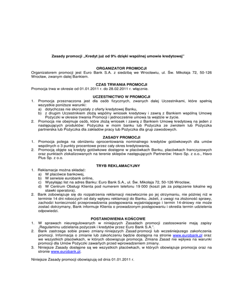 Zasady promocji „Kredyt już od 9% dzięki wspólnej umowie kredytowej” ORGANIZATOR PROMOCJI Organizatorem promocji jest Euro Bank S.A. z siedzibą we Wrocławiu, ul. Św. Mikołaja 72, 50-126 Wrocław, zwanym dalej Bankiem. CZAS TRWANIA PROMOCJI Promocja trwa w okresie od 01.01.2011 r. do 28.02.2011 r. włącznie. UCZESTNICTWO W PROMOCJI 1. Promocja przeznaczona jest dla osób fizycznych, zwanych dalej Uczestnikami, które spełnią wszystkie poniższe warunki: a) dotychczas nie skorzystały z oferty kredytowej Banku, b) z drugim Uczestnikiem złożą wspólny wniosek kredytowy i zawrą z Bankiem wspólną Umowę Pożyczki w okresie trwania Promocji i jednocześnie umowa ta wejdzie w życie. 2. Promocja nie obejmuje osób, które złożą wniosek i zawrą z Bankiem Umowę kredytową na jeden z następujących produktów: Pożyczka w moim banku lub Pożyczka ze zwrotem lub Pożyczka partnerska lub Pożyczka dla zakładów pracy lub Pożyczka dla grup zawodowych. ZASADY PROMOCJI 1. Promocja polega na obniżeniu oprocentowania nominalnego kredytów gotówkowych dla umów wspólnych o 3 punkty procentowe przez cały okres kredytowania. 2. Promocją objęte są kredyty gotówkowe dostępne w placówkach Banku, placówkach franczyzowych oraz punktach zlokalizowanych na terenie sklepów następujących Partnerów: Havo Sp. z o.o., Havo Plus Sp. z o.o. TRYB REKLAMACYJNY 1. Reklamacje można składać: a) W placówce bankowej, b) W serwisie eurobank online, c) Wysyłając list na adres Banku: Euro Bank S.A., ul. Św. Mikołaja 72, 50-126 Wrocław, d) W Centrum Obsługi Klienta pod numerem telefonu 19 000 (koszt jak za połączenie lokalne wg stawki operatora). 2. Bank zobowiązuje się do rozpatrzenia reklamacji niezwłocznie po jej otrzymaniu, nie później niż w terminie 14 dni roboczych od daty wpływu reklamacji do Banku. Jeżeli, z uwagi na złożoność sprawy, zachodzi konieczność przeprowadzenia postępowania wyjaśniającego i termin 14-dniowy nie może zostać dotrzymany, Bank informuje Klienta o prowadzonym postępowaniu i określa termin udzielenia odpowiedzi. POSTANOWIENIA KOŃCOWE 1. W sprawach nieuregulowanych w niniejszych Zasadach promocji zastosowanie mają zapisy „Regulaminu udzielania pożyczek i kredytów przez Euro Bank S.A.”. 2. Bank zastrzega sobie prawo zmiany niniejszych Zasad promocji lub wcześniejszego zakończenia promocji. Informacja o zmianie lub zakończeniu będzie dostępna na stronie www.eurobank.pl oraz we wszystkich placówkach, w których obowiązuje promocja. Zmiana Zasad nie wpływa na warunki promocji dla Umów Pożyczki zawartych przed wprowadzeniem zmiany. 3. Niniejsze Zasady dostępne są we wszystkich placówkach, w których obowiązuje promocja oraz na stronie www.eurobank.pl. Niniejsze Zasady promocji obowiązują od dnia 01.01.2011 r.