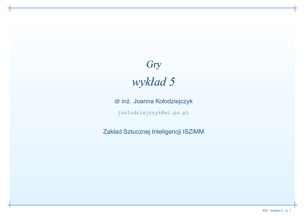 Gry wykład 5 dr inż. Joanna Kołodziejczyk [email protected] Zakład Sztucznej Inteligencji ISZiMM ESI - wykład 5 – p. 1 Plan wykładu Adversarial search — jak postepować, ˛ gdy inni agenci sa˛ naszymi przeciwnikami, czyli ich cele sa˛ przeciwstawne. • Co to znaczy grać? • Podejmowanie decyzji w grach dwuosobowych: min-max, α−β • Oszacowywanie pozycji • Gry z elementami stochastycznymi • Gry nieprecyzyjnej informacji ESI - wykład 5 – p. 2 Co to sa˛ gry w kontekście SI? Gry sa˛ forma˛ środowiska wieloagentowego. • Jaki jest cel i jak zachowuja˛ sie˛ inni agenci? Czy maja˛ oni wpływa na nasze decyzje? • Kooperacyjna i rywalizujaca ˛ wersja środowiska wieloagentowego. W grach mamy do czynienia z „nieprzewidywalnym” przeciwnikiem. Typy gier (wg teorii gier): • • • • • Gra dwuosobowa (dwóch agentów) Gra antagonistyczna (sumy zerowej) (wartości funkcji użyteczności agentów na końcu rozgrywki sa˛ równe lub przeciwne) Gra o skończonej liczbie strategii (środowisko deterministyczne) Gra niekoalicyjna Gra pełnej informacji (środowisko w pełni obserwowalne) ESI - wykład 5 – p. 3 Kilka uwag Gry były jednym z pierwszych zadań rozwiazywanych ˛ przez teoretyków SI. Do prekursorów badań nad szachami należy zaliczyć: • Konrad Zuse — twórca pierwszego komputera i jezyka ˛ programowania wysokiego poziomu. • • • Claude Shannon — twórca teorii informacji Norbert Wiener — twórca współczesnej teorii sterowania Alan Turing Gry maja˛ zazwyczaj duży współczynnik b szachy b = 35, gdy liczba ruchów do końca rozgrywki to około 50 dla każdego gracza, stad ˛ pełne drzewo gry zawiera 35100 wezłów. ˛ Gry wymagaja˛ podejmowania decyzji, gdy obliczenie decyzji optymalnej jest niewykonalne. W grach nie można sobie pozwolić na rozwiazania ˛ połowiczne. ESI - wykład 5 – p. 4 Gry kontra problemy przeszukiwania Przeszukiwanie - bez przeciwnika • • Rozwiazanie: ˛ odnalezienia stanu docelowego. • Funkcja oceny: oszacowanie kosztu przejścia od punktu poczatkowego ˛ do rozwiazania ˛ przez dany w˛ezeł. • Przykłady: planowanie drogi, harmonogramowanie. Heurystyki pozwalaja˛ na znalezienie suboptymalnego a czasem optymalnego rozwiazania. ˛ Gry - z przeciwnikiem • Rozwiazaniem ˛ jest strategia (określa ruch dla każdej możliwej odpowiedzi oponenta). • Ograniczenia czasowe wymuszaja˛ przybliżone rozwiazanie. ˛ W niewielu prostych grach można podać rozwiazanie ˛ optymalne. • • Funkcja oceny: oszacowanie „jakości” pozycji w grze. Przykłady: szachy, warcaby, trik-trak. ESI - wykład 5 – p. 5 Podział gier deterministic chance perfect information chess, checkers, go, othello backgammon monopoly imperfect information battleships, blind tictactoe bridge, poker, scrabble nuclear war Poczatkowa ˛ cz˛eść wykładu poświecona ˛ jest grom deterministycznym o pełnej informacji. ESI - wykład 5 – p. 6 Założenia Dwóch graczy: MAX i MIN MAX wykonuje ruch jako pierwszy, a nasepnie ˛ wykonuje naprzemienne ruchy z przeciwnikiem (ruch jednego gracza, to półruch (ang. ply)) aż do zakończenia gry. Zwyciezca ˛ otrzymuje nagrode˛ a przegrany kare. ˛ Gra jako problem przeszukiwania przestrzeni stanów: • Stan poczatkowy: ˛ np. ustawienie poczatkowe ˛ na planszy i ustalenie, który gracz wykona pierwszy ruch. • Funkcja generujaca ˛ nastepny ˛ stan: tworzy liste˛ par (ruch, stan) określajac ˛ a˛ dozwolone ruchy i otrzymane przez ten ruch stany. • Warunek zakończenia: który określa kiedy gra jest zakończona. Stany, w których gra sie˛ kończy nazywa sie˛ stanami terminalnymi. • Funkcja użyteczności (funkcja wypłaty, celu): podaje numeryczna˛ wartość w˛ezła terminalnego np. wygrana (+1), przegrana (-1), remis (0) (kółko krzyżyk). Stan poczatkowy ˛ i legalne ruchu definiuja˛ drzewo gry. MAX użyje drzewa i przeszuka je w celu określenia kolejnego ruchu. ESI - wykład 5 – p. 7 Drzewo gry MAX (X) X X X MIN (O) X X X X X O X O X O X X O X MAX (X) MIN (O) TERMINAL Utility X O ... X O X ... ... ... ... ... X O X O X O X O X O O X X X O X O X X X O O ... −1 0 +1 X X ESI - wykład 5 – p. 8 Strategie optymalne Strategia optymalna dla MAX zakłada nieomylność oponenta MIN . Oznacza to, że zakładamy, że przeciwnik jest rozsadny ˛ i nie bedzie ˛ wykonywał ruchów dla siebie niekorzystnych. Na przykładzie zostanie zademonstrowane jak znaleźć strategie˛ optymalna, ˛ choć dla gier trudniejszych niż kółko i krzyżyk nie uda sie˛ jej obliczyć. Założenie: Obaj przeciwnicy graja˛ optymalnie. Dla danego drzewa gry, optymalna strategia zostanie określona przez sprawdzenie minimaksowej wartości (MINIMAX-VALUE(n)) każdego w˛ezła. Idea: wybierz ruch do pozycji o najkorzystniejszej wartości minimaksowej, która jest równa najlepszej osiagalnej ˛ funkcji wypłaty w grze z optymalnym przeciwnikiem. Stad ˛ MAX bedzie ˛ wybierał stany o wartościach maksymalnych a MIN o wartościach minimalnych. MINIMAX-VALUE(n)= 1. UTILITY(n) If n is a terminal state 2. maxs∈successors(n) MINIMAX-VALUE(s) If n is a max node 3. mins∈successors(n) MINIMAX-VALUE(s) If n is a min node ESI - wykład 5 – p. 9 Przykład prostej gry dwuosobowej 3 MAX A1 A3 A2 3 MIN A 11 3 A 12 12 2 A 21 A 13 8 2 2 A 31 A 22 A 23 4 6 14 A 32 A 33 5 2 W w˛ezłach terminalnych podane sa˛ wartości wypłat dla graczy. Gracz MAX może wykonać ruchy A1 , A2 lub A3 , gdy w odpowiedzi na ruch A1 gracz MIN może wykonać ruchy A11 , A12 lub A13 , itd. Decyzja˛ minimax MAX wybierze ruch A1 ponieważ daje mu on najlepsze zyski przy optymalnej grze przeciwnika. ESI - wykład 5 – p. 10 Co sie˛ stanie jeżeli... Co sie˛ stanie jeżeli MIN nie zagra optymalnie? Definicja o optymalnej (rozsadnej) ˛ grze gracza MAX zakłada również optymalność gry MIN co oznacza maksymalizacje˛ najgorszego możliwego wyniku dla MAX w wezłach ˛ MIN . Zmiana strategii MIN na nieoptymalna˛ 