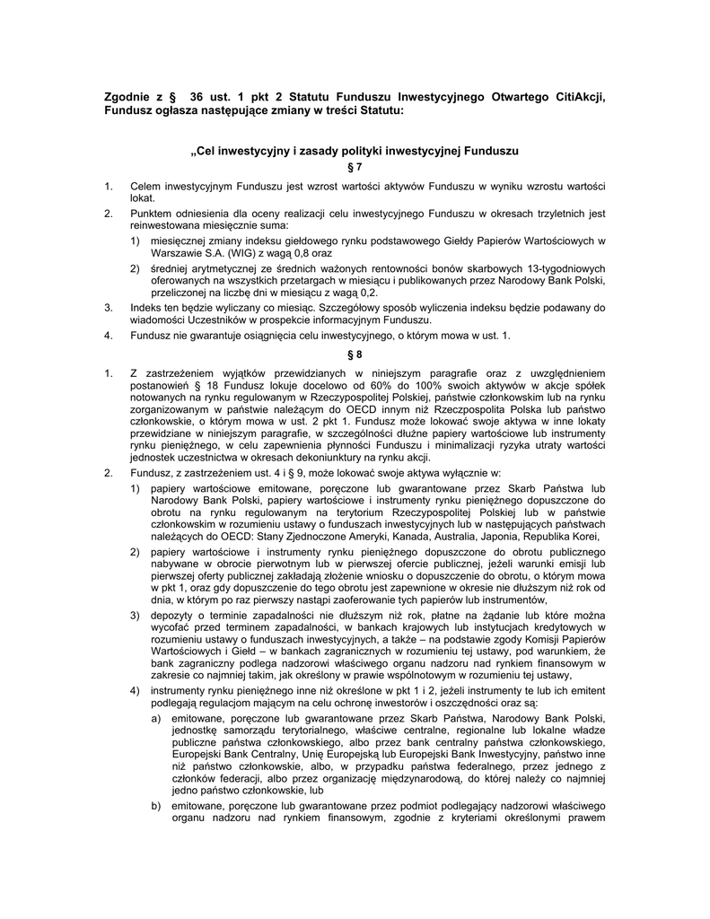 Zgodnie z § 36 ust. 1 pkt 2 Statutu Funduszu Inwestycyjnego Otwartego CitiAkcji, Fundusz ogłasza następujące zmiany w treści Statutu: „Cel inwestycyjny i zasady polityki inwestycyjnej Funduszu §7 1. 2. 3. 4. Celem inwestycyjnym Funduszu jest wzrost wartości aktywów Funduszu w wyniku wzrostu wartości lokat. Punktem odniesienia dla oceny realizacji celu inwestycyjnego Funduszu w okresach trzyletnich jest reinwestowana miesięcznie suma: 1) miesięcznej zmiany indeksu giełdowego rynku podstawowego Giełdy Papierów Wartościowych w Warszawie S.A. (WIG) z wagą 0,8 oraz 2) średniej arytmetycznej ze średnich ważonych rentowności bonów skarbowych 13-tygodniowych oferowanych na wszystkich przetargach w miesiącu i publikowanych przez Narodowy Bank Polski, przeliczonej na liczbę dni w miesiącu z wagą 0,2. Indeks ten będzie wyliczany co miesiąc. Szczegółowy sposób wyliczenia indeksu będzie podawany do wiadomości Uczestników w prospekcie informacyjnym Funduszu. Fundusz nie gwarantuje osiągnięcia celu inwestycyjnego, o którym mowa w ust. 1. §8 1. 2. Z zastrzeżeniem wyjątków przewidzianych w niniejszym paragrafie oraz z uwzględnieniem postanowień § 18 Fundusz lokuje docelowo od 60% do 100% swoich aktywów w akcje spółek notowanych na rynku regulowanym w Rzeczypospolitej Polskiej, państwie członkowskim lub na rynku zorganizowanym w państwie należącym do OECD innym niż Rzeczpospolita Polska lub państwo członkowskie, o którym mowa w ust. 2 pkt 1. Fundusz może lokować swoje aktywa w inne lokaty przewidziane w niniejszym paragrafie, w szczególności dłużne papiery wartościowe lub instrumenty rynku pieniężnego, w celu zapewnienia płynności Funduszu i minimalizacji ryzyka utraty wartości jednostek uczestnictwa w okresach dekoniunktury na rynku akcji. Fundusz, z zastrzeżeniem ust. 4 i § 9, może lokować swoje aktywa wyłącznie w: 1) papiery wartościowe emitowane, poręczone lub gwarantowane przez Skarb Państwa lub Narodowy Bank Polski, papiery wartościowe i instrumenty rynku pieniężnego dopuszczone do obrotu na rynku regulowanym na terytorium Rzeczypospolitej Polskiej lub w państwie członkowskim w rozumieniu ustawy o funduszach inwestycyjnych lub w następujących państwach należących do OECD: Stany Zjednoczone Ameryki, Kanada, Australia, Japonia, Republika Korei, 2) papiery wartościowe i instrumenty rynku pieniężnego dopuszczone do obrotu publicznego nabywane w obrocie pierwotnym lub w pierwszej ofercie publicznej, jeżeli warunki emisji lub pierwszej oferty publicznej zakładają złożenie wniosku o dopuszczenie do obrotu, o którym mowa w pkt 1, oraz gdy dopuszczenie do tego obrotu jest zapewnione w okresie nie dłuższym niż rok od dnia, w którym po raz pierwszy nastąpi zaoferowanie tych papierów lub instrumentów, 3) depozyty o terminie zapadalności nie dłuższym niż rok, płatne na żądanie lub które można wycofać przed terminem zapadalności, w bankach krajowych lub instytucjach kredytowych w rozumieniu ustawy o funduszach inwestycyjnych, a także – na podstawie zgody Komisji Papierów Wartościowych i Giełd – w bankach zagranicznych w rozumieniu tej ustawy, pod warunkiem, że bank zagraniczny podlega nadzorowi właściwego organu nadzoru nad rynkiem finansowym w zakresie co najmniej takim, jak określony w prawie wspólnotowym w rozumieniu tej ustawy, 4) instrumenty rynku pieniężnego inne niż określone w pkt 1 i 2, jeżeli instrumenty te lub ich emitent podlegają regulacjom mającym na celu ochronę inwestorów i oszczędności oraz są: a) emitowane, poręczone lub gwarantowane przez Skarb Państwa, Narodowy Bank Polski, jednostkę samorządu terytorialnego, właściwe centralne, regionalne lub lokalne władze publiczne państwa członkowskiego, albo przez bank centralny państwa członkowskiego, Europejski Bank Centralny, Unię Europejską lub Europejski Bank Inwestycyjny, państwo inne niż państwo członkowskie, albo, w przypadku państwa federalnego, przez jednego z członków federacji, albo przez organizację międzynarodową, do której należy co najmniej jedno państwo członkowskie, lub b) emitowane, poręczone lub gwarantowane przez podmiot podlegający nadzorowi właściwego organu nadzoru nad rynkiem finansowym, zgodnie z kryteriami określonymi prawem c) d) wspólnotowym, albo przez podmiot podlegający i stosujący się do zasad, które są co najmniej tak rygorystyczne, jak określone prawem wspólnotowym, lub emitowane przez podmiot, którego papiery wartościowe są w obrocie na rynku regulowanym, o którym mowa w pkt 1, lub emitowane przez inne podmioty, pod warunkiem że inwestycje w takie papiery wartościowe podlegają ochronie inwestora równoważnej do określonej w lit. a-c oraz emitent spełnia łącznie następujące warunki: − emitent bądź gwarant emisji lub podmiot posiadający akcje lub udziały reprezentujące co najmniej 75% kapitału emitenta, posiada rating na poziomie inwestycyjnym nadany przez jedną z następujących agencji ratingowych: Moody’s, Fitch, Standard&Poor’s, − jest spółką, której kapitał własny wynosi co najmniej 10.000.000 euro, − publikuje roczne sprawozdania finansowe, zgodnie z przepisami prawa wspólnotowego, dotyczące rocznych sprawozdań finansowych niektórych rodzajów spółek, − należy do grupy kapitałowej, w skład której wchodzi co najmniej jedna spółka, której papiery wartościowe są przedmiotem obrotu na rynku regulowanym, − 3. 4. zajmuje się finansowaniem grupy, o której mowa w tiret trzecie, albo finansowaniem mechanizmów przekształcania długu w papiery wartościowe z wykorzystaniem bankowej linii kredytowej, 5) papiery wartościowe i instrumenty rynku pieniężnego, inne niż określone w pkt 1, 2 i 4. Lokowanie w papiery wartościowe lub instrumenty rynku pieniężnego będące przedmiotem obrotu na rynku zorganizowanym w rozumieniu ustawy o funduszach inwestycyjnych, oraz w papiery wartościowe i i