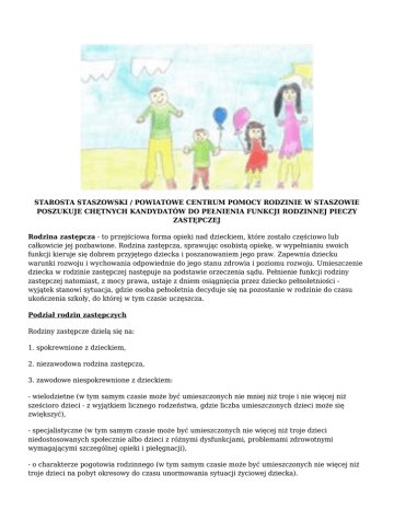 STAROSTA STASZOWSKI / POWIATOWE CENTRUM POMOCY RODZINIE W STASZOWIE POSZUKUJE CHĘTNYCH KANDYDATÓW DO PEŁNIENIA FUNKCJI RODZINNEJ PIECZY ZASTĘPCZEJ Rodzina zastępcza - to przejściowa forma opieki nad dzieckiem, które zostało częściowo lub całkowicie jej pozbawione. Rodzina zastępcza, sprawując osobistą opiekę, w wypełnianiu swoich funkcji kieruje się dobrem przyjętego dziecka i poszanowaniem jego praw. Zapewnia dziecku warunki rozwoju i wychowania odpowiednie do jego stanu zdrowia i poziomu rozwoju. Umieszczenie dziecka w rodzinie zastępczej następuje na podstawie orzeczenia sądu. Pełnienie funkcji rodziny zastępczej natomiast, z mocy prawa, ustaje z dniem osiągnięcia przez dziecko pełnoletniości wyjątek stanowi sytuacja, gdzie osoba pełnoletnia decyduje się na pozostanie w rodzinie do czasu ukończenia szkoły, do której w tym czasie uczęszcza. Podział rodzin zastępczych Rodziny zastępcze dzielą się na: 1. spokrewnione z dzieckiem, 2. niezawodowa rodzina zastępcza, 3. zawodowe niespokrewnione z dzieckiem: - wielodzietne (w tym samym czasie może być umieszczonych nie mniej niż troje i nie więcej niż sześcioro dzieci - z wyjątkiem licznego rodzeństwa, gdzie liczba umieszczonych dzieci może się zwiększyć), - specjalistyczne (w tym samym czasie może być umieszczonych nie więcej niż troje dzieci niedostosowanych społecznie albo dzieci z różnymi dysfunkcjami, problemami zdrowotnymi wymagającymi szczególnej opieki i pielęgnacji), - o charakterze pogotowia rodzinnego (w tym samym czasie może być umieszczonych nie więcej niż troje dzieci na pobyt okresowy do czasu unormowania sytuacji życiowej dziecka). Kandydaci na rodziców zastępczych: Pełnienie funkcji rodziny zastępczej może być powierzone małżonkom lub osobie niepozostającej w związku małżeńskim, jeżeli osoby te spełniają następujące warunki: 1. dają rękojmię należytego sprawowania pieczy zastępczej; 2. nie są i nie były pozbawione władzy rodzicielskiej, oraz władza rodzicielska nie jest im ograniczona ani zawieszona; 3. wypełniają obowiązek alimentacyjny — w przypadku gdy taki obowiązek w stosunku do nich wynika z tytułu egzekucyjnego; 4. nie są ograniczone w zdolności do czynności prawnych 5. są zdolne do sprawowania właściwej opieki nad dzieckiem, co zostało potwierdzone: a) zaświadczeniem lekarskim o stanie zdrowia wystawionym przez lekarza podstawowej opieki zdrowotnej oraz b) opinią o posiadaniu predyspozycji i motywacji do pełnienia funkcji rodziny zastępczej lub prowadzenia rodzinnego domu dziecka wystawioną przez psychologa, który posiada co najmniej wykształcenie wyższe magisterskie na kierunku psychologia oraz 2-letnie doświadczenie w poradnictwie rodzinnym; 6. przebywają na terytorium Rzeczypospolitej Polskiej; 7. zapewnią odpowiednie warunki bytowe i mieszkaniowe umożliwiające dziecku zaspokajanie jego indywidualnych potrzeb, w tym: a. rozwoju emocjonalnego, fizycznego i społecznego, b. właściwej edukacji i rozwoju zainteresowań, c. wypoczynku i organizacji czasu wolnego. Osoby zainteresowane szczegółowe informacje mogą uzyskać w: Powiatowym Centrum Pomocy Rodzinie w Staszowie ul. Szkolna 4, 28-200 Staszów, tel. 015 864 30 58