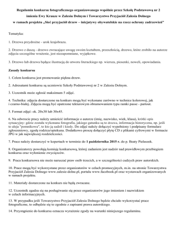 Regulamin konkursu fotograficznego organizowanego wspólnie przez Szkołę Podstawową nr 2 imienia Ewy Krauze w Zalesiu Dolnym i Towarzystwo Przyjaciół Zalesia Dolnego w ramach projektu „Sieć przyjaciół drzew – inicjatywy obywatelskie na rzecz ochrony zadrzewień” Tematyka: 1. Drzewa przydrożne - urok krajobrazu. 2. Drzewo z duszą - drzewo zwracające uwagę swoim kształtem, przeszłością, drzewo, które zrobiło na autorze zdjęcia szczególne wrażenie, jest niezapomniane, wyjątkowe. 3. Drzewo lub drzewa będące ilustracją do utworu literackiego np. wiersza, piosenki, noweli, opowiadania. Zasady konkursu 1. Celem konkursu jest promowanie piękna drzew. 2. Adresatami konkursu są uczniowie Szkoły Podstawowej nr 2 w Zalesiu Dolnym. 3. Uczestnik może zgłosić maksimum 5 zdjęć. 4. Technika: zdjęcia dostarczone na konkurs mogą być wykonane zarówno w technice kolorowej, jak i czarno-białej. Zdjęcia mogą być opatrzone tekturowym obramowaniem typu ramki passe - partout. 5. Format zdjęć: ok. 20x30 lub 30x45. 6. Na odwrocie pracy należy umieścić informacje o autorze (imię, nazwisko, wiek, klasa), krótki opis sytuacyjny: gdzie została wykonana fotografia, jakiego gatunku są to drzewa, informacja historyczna, np. jeśli to aleja "pomnikowa", to kto ją sadził i kiedy. Do zdjęć należy dołączyć wypełniony i podpisany formularz zgłoszeniowy, zgodę rodzica/opiekuna. Dodatkowo proszę dołączyć płytę CD z plikami cyfrowymi w formacie JPG w jak największej rozdzielczości. 7. Prace należy dostarczyć w kopertach w terminie do 1 października 2015 r. do p. Beaty Pielaszek. 8. Organizatorzy powołają komisję konkursową, której zadaniem jest nadzór nad prawidłowym przebiegiem konkursu oraz wyłonienie zwycięzców. 9. Praca konkursowa nie może naruszać praw osób trzecich, a w szczególności cudzych praw autorskich. 10. Prace mogą być wykorzystane przez organizatorów w celach promocyjnych, m.in. na stronie Towarzystwa Przyjaciół Zalesia Dolnego www.zalesie-dolne.pl, portalu www.facobook.pl oraz wystawach organizowanych w ramach projektu. 11. Materiały dostarczone na konkurs nie będą zwracane. 12. Uczestnik zgadza się na posługiwanie się przez organizatorów jego imieniem i nazwiskiem w celach informacyjnych. 13. W przypadku jeśli Towarzystwo Przyjaciół Zalesia Dolnego będzie chciało wykorzystać prace fotograficzne, to odbędzie się to zgodnie z zapisami prawa autorskiego. 14. Przystąpienie do konkursu oznacza wyrażenie zgody na warunki niniejszego regulaminu. Nagrody 1. Oficjalne zakończenie konkursu, wystawa, ogłoszenie wyników oraz rozdanie nagród odbędzie się w październiku 2015 r. 2. Nagrodą w konkursie jest dyplom i nagroda rzeczowa. Przewidujemy również wyróżnienia i drobne upominki. ------------------------------------------------------------------------------------------------------------------------------------Karta zgłoszeniowa na konkurs fotograficzny promujący piękno drzew Imię i nazwisko autora: …............................................................................................................................................................................. Tytuły prac: 1. …......................................................................................................................................................................... 2. …......................................................................................................................................................................... 3. …......................................................................................................................................................................... 4. ............................................................................................................................................................................. 5. ............................................................................................................................................................................. Oświadczenie Wyrażam zgodę na przetwarzanie moich danych osobowych zgodnie z ustawą z dnia 29.08.1997 r. o ochronie danych osobowych (tekst jedn. Dz.U. z 2002 r., Nr 101, poz. 926 z poźn. zm.) przez Organizatorów Konkursu dla celów związanych z przeprowadzeniem i rozstrzygnięciem konkursu zgodnie z regulaminem. Oświadczam, że jestem autorem zdjęć przekazanych na konkurs. Oświadczam, że zapoznałem/am się z treścią i przyjmuję warunki określone w regulaminie konkursu ........................................................................ Podpis autora ZGODA RODZICA/OPIEKUNA ............................................................. (miejscowość, data) Wyrażam zgodę na udział mojego dziecka: ............................................................................................................................................................................, (imię i nazwisko dziecka) w konkursie fotograficznym organizowanym przez Szkołę Podstawową nr 2 oraz Towarzystwo Przyjaciół Zalesia Dolnego. Oświadczam, iż zapoznałem/zapoznałam się z treścią Regulaminu i akceptuję jego postanowienia. Ponadto wyrażam zgodę na przetwarzanie danych osobowych przez organizatorów konkursu dla celów związanych z przeprowadzeniem i rozstrzygnięciem konkursu zgodnie z regulaminem. Wyrażam zgodę na wykorzystanie pracy zgłoszonej do konkursu do celów upowszechniania idei projektu. Niniejsze oświadczenie jest zezwoleniem w rozumieniu art. 81 ustawy o prawie autorskim i prawach pokrewnych (DZ.U. z 1994r. nr 24, poz.83). ..................................................... podpis rodzica/opiekuna