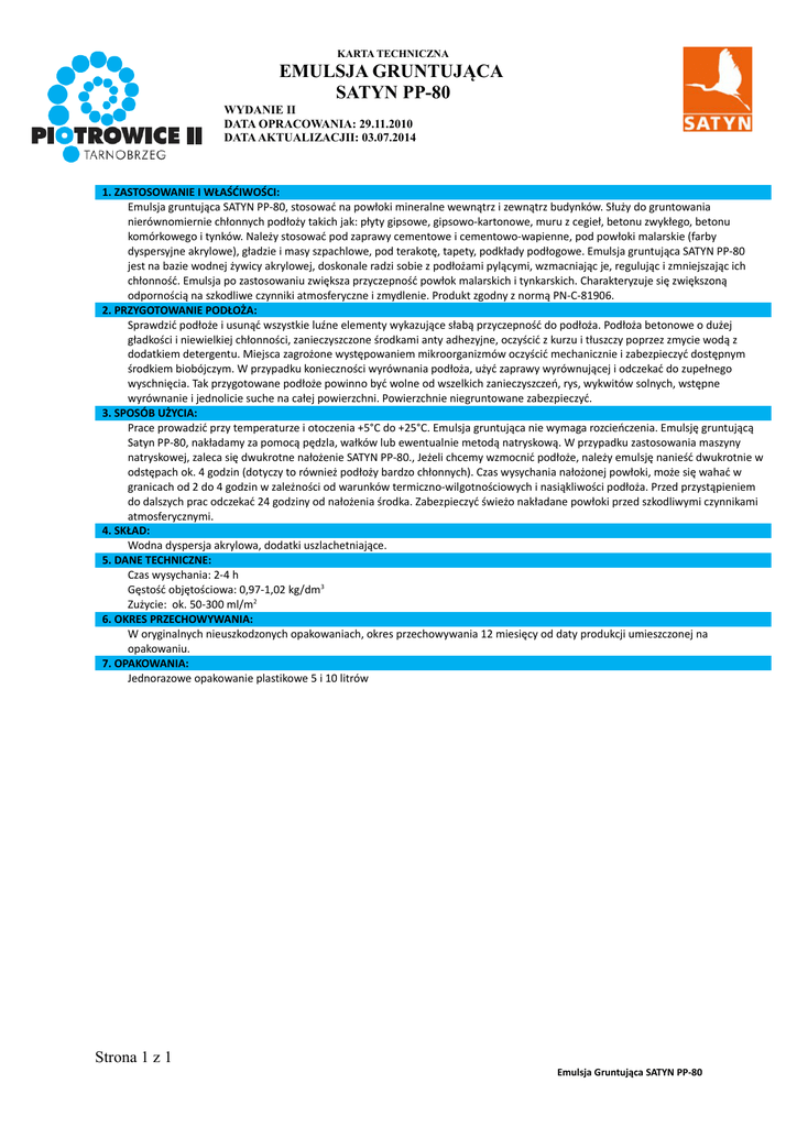 KARTA TECHNICZNA EMULSJA GRUNTUJĄCA SATYN PP-80 WYDANIE II DATA OPRACOWANIA: 29.11.2010 DATA AKTUALIZACJII: 03.07.2014 1. ZASTOSOWANIE I WŁAŚĆIWOŚCI: Emulsja gruntująca SATYN PP-80, stosować na powłoki mineralne wewnątrz i zewnątrz budynków. Służy do gruntowania nierównomiernie chłonnych podłoży takich jak: płyty gipsowe, gipsowo-kartonowe, muru z cegieł, betonu zwykłego, betonu komórkowego i tynków. Należy stosować pod zaprawy cementowe i cementowo-wapienne, pod powłoki malarskie (farby dyspersyjne akrylowe), gładzie i masy szpachlowe, pod terakotę, tapety, podkłady podłogowe. Emulsja gruntująca SATYN PP-80 jest na bazie wodnej żywicy akrylowej, doskonale radzi sobie z podłożami pylącymi, wzmacniając je, regulując i zmniejszając ich chłonność. Emulsja po zastosowaniu zwiększa przyczepność powłok malarskich i tynkarskich. Charakteryzuje się zwiększoną odpornością na szkodliwe czynniki atmosferyczne i zmydlenie. Produkt zgodny z normą PN-C-81906. 2. PRZYGOTOWANIE PODŁOŻA: Sprawdzić podłoże i usunąć wszystkie luźne elementy wykazujące słabą przyczepność do podłoża. Podłoża betonowe o dużej gładkości i niewielkiej chłonności, zanieczyszczone środkami anty adhezyjne, oczyścić z kurzu i tłuszczy poprzez zmycie wodą z dodatkiem detergentu. Miejsca zagrożone występowaniem mikroorganizmów oczyścić mechanicznie i zabezpieczyć dostępnym środkiem biobójczym. W przypadku konieczności wyrównania podłoża, użyć zaprawy wyrównującej i odczekać do zupełnego wyschnięcia. Tak przygotowane podłoże powinno być wolne od wszelkich zanieczyszczeń, rys, wykwitów solnych, wstępne wyrównanie i jednolicie suche na całej powierzchni. Powierzchnie niegruntowane zabezpieczyć. 3. SPOSÓB UŻYCIA: Prace prowadzić przy temperaturze i otoczenia +5°C do +25°C. Emulsja gruntująca nie wymaga rozcieńczenia. Emulsję gruntującą Satyn PP-80, nakładamy za pomocą pędzla, wałków lub ewentualnie metodą natryskową. W przypadku zastosowania maszyny natryskowej, zaleca się dwukrotne nałożenie SATYN PP-80., Jeżeli chcemy wzmocnić podłoże, należy emulsję nanieść dwukrotnie w odstępach ok. 4 godzin (dotyczy to również podłoży bardzo chłonnych). Czas wysychania nałożonej powłoki, może się wahać w granicach od 2 do 4 godzin w zależności od warunków termiczno-wilgotnościowych i nasiąkliwości podłoża. Przed przystąpieniem do dalszych prac odczekać 24 godziny od nałożenia środka. Zabezpieczyć świeżo nakładane powłoki przed szkodliwymi czynnikami atmosferycznymi. 4. SKŁAD: Wodna dyspersja akrylowa, dodatki uszlachetniające. 5. DANE TECHNICZNE: Czas wysychania: 2-4 h Gęstość objętościowa: 0,97-1,02 kg/dm3 Zużycie: ok. 50-300 ml/m2 6. OKRES PRZECHOWYWANIA: W oryginalnych nieuszkodzonych opakowaniach, okres przechowywania 12 miesięcy od daty produkcji umieszczonej na opakowaniu. 7. OPAKOWANIA: Jednorazowe opakowanie plastikowe 5 i 10 litrów Strona 1 z 1 Emulsja Gruntująca SATYN PP-80