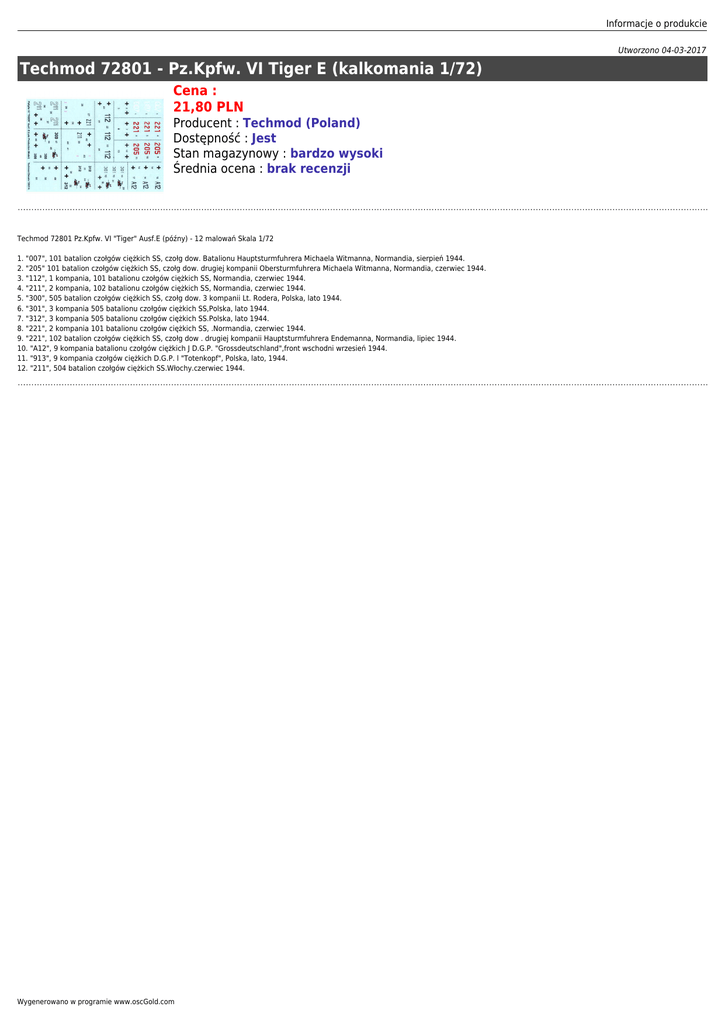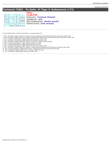 Informacje o produkcie Utworzono 04-03-2017 Techmod 72801 - Pz.Kpfw. VI Tiger E (kalkomania 1/72) Cena : 21,80 PLN Producent : Techmod (Poland) Dostępność : Jest Stan magazynowy : bardzo wysoki Średnia ocena : brak recenzji Techmod 72801 Pz.Kpfw. VI "Tiger" Ausf.E (późny) - 12 malowań Skala 1/72 1. "007", 101 batalion czołgów ciężkich SS, czołg dow. Batalionu Hauptsturmfuhrera Michaela Witmanna, Normandia, sierpień 1944. 2. "205" 101 batalion czołgów ciężkich SS, czołg dow. drugiej kompanii Obersturmfuhrera Michaela Witmanna, Normandia, czerwiec 1944. 3. "112", 1 kompania, 101 batalionu czołgów ciężkich SS, Normandia, czerwiec 1944. 4. "211", 2 kompania, 102 batalionu czołgów ciężkich SS, Normandia, czerwiec 1944. 5. "300", 505 batalion czołgów ciężkich SS, czołg dow. 3 kompanii Lt. Rodera, Polska, lato 1944. 6. "301", 3 kompania 505 batalionu czołgów ciężkich SS,Polska, lato 1944. 7. "312", 3 kompania 505 batalionu czołgów ciężkich SS.Polska, lato 1944. 8. "221", 2 kompania 101 batalionu czołgów ciężkich SS, .Normandia, czerwiec 1944. 9. "221", 102 batalion czołgów ciężkich SS, czołg dow . drugiej kompanii Hauptsturmfuhrera Endemanna, Normandia, lipiec 1944. 10. "A12", 9 kompania batalionu czołgów ciężkich J D.G.P. "Grossdeutschland",front wschodni wrzesień 1944. 11. "913", 9 kompania czołgów ciężkich D.G.P. l "Totenkopf", Polska, lato, 1944. 12. "211", 504 batalion czołgów ciężkich SS.Włochy.czerwiec 1944. Wygenerowano w programie www.oscGold.com