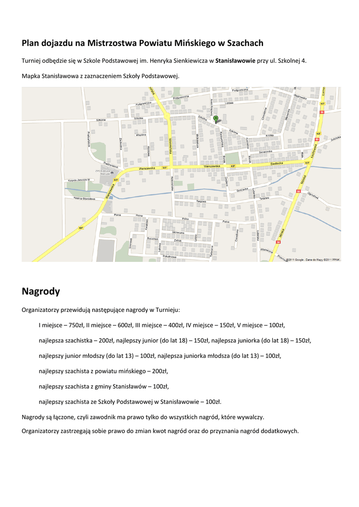 Plan dojazdu na Mistrzostwa Powiatu Mińskiego w Szachach Turniej odbędzie się w Szkole Podstawowej im. Henryka Sienkiewicza w Stanisławowie przy ul. Szkolnej 4. Mapka Stanisławowa z zaznaczeniem Szkoły Podstawowej. Nagrody Organizatorzy przewidują następujące nagrody w Turnieju: I miejsce – 750zł, II miejsce – 600zł, III miejsce – 400zł, IV miejsce – 150zł, V miejsce – 100zł, najlepsza szachistka – 200zł, najlepszy junior (do lat 18) – 150zł, najlepsza juniorka (do lat 18) – 150zł, najlepszy junior młodszy (do lat 13) – 100zł, najlepsza juniorka młodsza (do lat 13) – 100zł, najlepszy szachista z powiatu mińskiego – 200zł, najlepszy szachista z gminy Stanisławów – 100zł, najlepszy szachista ze Szkoły Podstawowej w Stanisławowie – 100zł. Nagrody są łączone, czyli zawodnik ma prawo tylko do wszystkich nagród, które wywalczy. Organizatorzy zastrzegają sobie prawo do zmian kwot nagród oraz do przyznania nagród dodatkowych. Sponsorzy: Wójt Gminy Stanisławów. Przewidywany układ czasowy Turnieju 21 kwietnia 2012 (Sobota) 9:30 -9:45- weryfikacja zawodników 10:00 - rozpoczęcie pierwszej rundy A – Mistrzostwa Powiatu B – Szachowe nadzieje C – Szachowe początki 1 – 10:00 1– 10:00 1 – 10:00 2 – 11:00 2– 12:00 2 – 11:00 3 – 12:00 obiad – 13:30-14:15 3 – 12:00 obiad – 13:00 3 – 14:15 obiad – 13:00-14:00 4 – 13:30 4 – 16:15 C – koniec 13:00 A – koniec 15:30 B – koniec około 18-ej 22 kwietnia 2012 (Niedziela) A – Mistrzostwa Powiatu B – Szachowe nadzieje C – Szachowe początki 5 – 10:00 5 – 10:00 4 – 10:00 6 – 11:00 6 – 12:00 5 – 11:00 7 – 12:00 obiad – 13:30-14:15 6 – 12:00 obiad – 13:00-14:00 7 – 14:15 obiad – 13:00-13:30 8 – 14:00 Koniec – 16:15 7 – 13:30 9 – 15:00 koniec – 14:30 koniec – 16:15 zakończenie 16:30 zakończenie 14:30 Oczywiście, jest to tylko przewidywany układ czasowy Turnieju. Rzeczywisty harmonogram może się nieco różnić od zaplanowanego. Zapytania i uwagi prosimy kierować na telefon 512-010-411, do pana Adama Banasiaka.