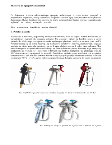 Akcesoria do agregatów malarskich Po dokonaniu wyboru odpowiedniego agregatu malarskiego, o czym można poczytać w poprzednich artykułach, należy zastanowić się jakie akcesoria będą nam potrzebne do wykonania danej pracy. Rynek dodatkowego osprzętu do pomp malarskich jest bardzo szeroki. Osprzęt należy wybierać na miarę własnych potrzeb. Jako wyposażenie dodatkowe można dokupić: 1. Pistolet malarski Wychodząc z założenia, że pistolety należą do akcesoriów, a nie do części, można powiedzieć, że najważniejszy element jaki możemy dokupić. Ma ogromny wpływ na komfort pracy, o czym głównie decyduje waga oraz spust (na rynku są dostępne pistolety z miękkim spustem typu „soft”). Pistolety różnią się od siebie budową ( są plastikowe, metalowe – stalowe, aluminiowe) , wagą ze względu na użyte materiały, spustem – są na 4 palce dłuższe oraz na 2 palce, oraz rodzajem filtra paluszkowego w rękojeści odpowiedzialnego za filtrację końcową farby. Pistolety mają zazwyczaj podłączenie do węża na ¼” – stosowane w farbach oraz rzadziej podłączenie do grubszego węża na 3/8” stosowane przy agregatach do szpachli. Zasadniczo są dwie grupy pistoletów pod względem ciśnienia do ok. 250 bar oraz 500 bar. Gwint osłony dyszy występuje standardowo także w dwóch rozmiarach 7/8” i 11/16” o czym należy pamiętać kupując kolejne akcesoria do pomp malarskich. Rys. Przykładowe pistolety malarskie Campbell Hausfeld, Pro-Spray oraz Filtermedia na 250 bar Rys. Pistolety od lewej: ze spustem na 4 palce oraz ze spustem na 2 palce. 2. Wąż malarski Występują w dwóch standardach z gwintami 1/4” i 3/8”. Węże 3/8” mają przekrój ~9,5 mm i najczęściej są wykorzystywane jako węże do nakładania szpachli. W krótkich odcinkach połączone nyplem redukcyjnym 3/8”-1/4” z wężem 1/4” , który jest wykorzystywany jako kompensator ciśnienia. Dodatkowo węże dzielą się na te w oplocie tekstylnym oraz w oplocie stalowym. Występują zarówno w oplocie pojedynczym oraz podwójnym. Dodatkowy podział wynika także z zakutych końcówek, mogą być wykonane ze zwykłej stali lub nierdzewnej. Powyższa budowa ma wpływ na wytrzymałość węży , różne modele mogą być stosowane dla niższych i wyższych ciśnień roboczych ( od 200 – do 500 Bar.) W zależności od konfiguracji węże są bardziej sztywne – te w oplocie podwójnym metalowym lub bardziej giętkie w oplocie tekstylnym. Do agregatów membranowych polecane są węże w oplocie tekstylnym ze względu na większe drgania agregatu przy pracy. Rys. Wąż malarski 1/4” 3. Kompensator ciśnienia Kompensatory ciśnienia stosowane zazwyczaj przy wyjściu z agregatu na wąż. Kompensator ciśnienia ma na celu zredukowanie drgań przenoszonych z elementu roboczego np. membrany na wąż. Tyczy się to agregatów większej mocy i wydajności. Kompensator ciśnienia może być stosowany w każdym agregacie malarskim bez względu na wydajność, jednak zaleca się stosowanie w pompach malarskich od wydajności ok. 4/l min. Alternatywą dla kompensatora ciśnienia jest krótki np. 1 metrowy wąż 3/8” rys. Kompensator ciśnienia 4. Manometr Prawidłowy natrysk hydrodynamiczny odbywa się przy ciśnieniu podczas pracy 160-180 bar. Ciśnienie ustawione na agregacie powinno być ok. 200 bar, jednak podczas pracy spada do wspomnianej ilości. Im większa jest dysza na pistolecie malarskim, tym mniejsze ciśnienie itd. Jeżeli ciśnienie spadnie poniżej 100 bar, farba będzie wypływać z agregatu, jednak nie pod takim ciśnieniem, aby stworzyć gładką powierzchnię natrysku. Można tego wszystkiego uniknąć kontrolując ciśnienie, do czego właśnie służy manometr. Rys. Manometr z separatorem 5. Przedłużka – Lanca Natrysk farby odbywa się przed dyszę, umieszczoną w osłonie dyszy / motylku nakręconym na pistolecie malarskim. Ponieważ natrysk odbywa się w odległości ok. 25-30 cm od ściany problematyczne staje się malowanie sufitów oraz wysokich pomieszczeń, powyżej 2 m. Wtedy z pomocą zamiast drabiny bądź rusztowania przychodzą przedłużki malarskie zwane potocznie lancami. Jest wielu producentów, jednak standardowo różnią się rozmiarami gwintów – występują na 7/8” i 11/16”. Dodatkową różnicą między produktami może być także budowa, najpopularniejsze przedłużki do malowania mają pojedyncze ścianki i wykonane są z aluminium. Firmy Graco oraz Tritech posiadają w swojej ofercie lance malarskie o podwójnych ściankach. Przedłużki do pistoletu z założenia można ze sobą łączyć. Lance występują w różnych długościach: 15cm, 25 cm, 30 cm, 45cm, 50cm, 75cm itd. Ze względów na wagę i komfort pracy, przedłużki poleca się do długości 100 cm. Pamiętając, iż lanca malarska nakręcana jest na pistolet manewrowanie dłuższą przedłużką, wypełnioną farbą zaczyna być kłopotliwe i niewygodne. Najdłuższe lance do malowania występujące na rynku mają do 2 metrów długości, lecz najczęściej kupowane są do pojedynczych, skomplikowanych prac malarskich. Dodatkowo na przedłużkę można nakręcić końcówkę nastawną, która pozwoli Nam regulować kąt natrysku. Rys. Przedłużki do agregatów malarskich Rys. Widok przedłużki ze ścianką wzmacnianą. 6. Końcówka nastawna Występuje w dwóch standardach: na gwinty 7/8” i 11/16”. Mały gadżet, a bardzo przydatny. Końcówkę nastawną montuje się między pistolet lub przedłużkę, a osłonę dyszy wraz z dyszą malarską. Umożliwia nam zmianę kąta natrysku do 90 stopni od linii standardowego natrysku, co jest szczególnie ważne przy malowaniu miejsc trudno dostępnych jak np. szyby windowe, podwieszane sufity i inne kształty, gdzie nie ma standardowego podejścia. Rys. Końcówka nastawna 7. Filtry w pistolecie i agregacie Na samym początku farba styka się z filtrem ssaka, który odpowiada za wstępną filtrację farby i je
