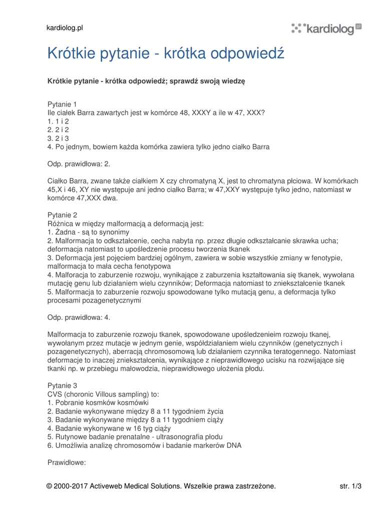 kardiolog.pl Krótkie pytanie - krótka odpowiedź Krótkie pytanie - krótka odpowiedź; sprawdź swoją wiedzę Pytanie 1 Ile ciałek Barra zawartych jest w komórce 48, XXXY a ile w 47, XXX? 1. 1 i 2 2. 2 i 2 3. 2 i 3 4. Po jednym, bowiem każda komórka zawiera tylko jedno ciałko Barra Odp. prawidłowa: 2. Ciałko Barra, zwane także ciałkiem X czy chromatyną X, jest to chromatyna płciowa. W komórkach 45,X i 46, XY nie występuje ani jedno ciałko Barra; w 47,XXY występuje tylko jedno, natomiast w komórce 47,XXX dwa. Pytanie 2 Różnica w między malformacją a deformacją jest: 1. Żadna - są to synonimy 2. Malformacja to odkształcenie, cecha nabyta np. przez długie odkształcanie skrawka ucha; deformacja natomiast to upośledzenie procesu tworzenia tkanek 3. Deformacja jest pojęciem bardziej ogólnym, zawiera w sobie wszystkie zmiany w fenotypie, malformacja to mała cecha fenotypowa 4. Malforacja to zaburzenie rozwoju, wynikające z zaburzenia kształtowania się tkanek, wywołana mutację genu lub działaniem wielu czynników; Deformacja natomiast to zniekształcenie tkanek 5. Malformacja to zaburzenie rozwoju spowodowane tylko mutacją genu, a deformacja tylko procesami pozagenetycznymi Odp. prawidłowa: 4. Malformacja to zaburzenie rozwoju tkanek, spowodowane upośledzenieim rozwoju tkanej, wywołanym przez mutacje w jednym genie, współdziałaniem wielu czynników (genetycznych i pozagenetycznych), aberracją chromosomową lub działaniem czynnika teratogennego. Natomiast deformacje to inaczej zniekształcenia, wynikające z nieprawidłowego ucisku na rozwijające się tkanki np. w przebiegu małowodzia, nieprawidłowego ułożenia płodu. Pytanie 3 CVS (choronic Villous sampling) to: 1. Pobranie kosmków kosmówki 2. Badanie wykonywane między 8 a 11 tygodniem życia 3. Badanie wykonywane między 8 a 11 tygodniem ciąży 4. Badanie wykonywane w 16 tyg ciąży 5. Rutynowe badanie prenatalne - ultrasonografia płodu 6. Umożliwia analizę chromosomów i badanie markerów DNA Prawidłowe: © 2000-2017 Activeweb Medical Solutions. Wszelkie prawa zastrzeżone. str. 1/3 kardiolog.pl 1. 1, 2,5 2. Tylko 1 3. 1, 3, 6 4. 3,5 5. Tylko 5 Odp. prawidłowa: 3. CVS to badanie prenatalne, technika pobrania kosmków kosmówki. Aspiracja kosmków kosmówki wykonywana pod kontrolą ultrasonograficzną (wiąże się w porównaniu z innymi metodami stosunkowo wysokim ryzykiem poronienia lub infekcji po zabiegu), pozwalająca przeprowadzić : o Analizę chromosomów o Badania enzymatyczne (w kierunku zaburzeń enzymatycznych) o Badanie markerów DNA o Określenie płci płodu (ryzyko choroby sprzężonej z chromosomem X) Badanie można przeprowadzić we wczesnym okresie (w 6 - 11 tygodniu ciąży, podczas gdy amniocenteza w 16) Pytanie 4 Galaktozemia Nieprawdą jest, że: 1. Galaktozemia to najczęstsze schorzenie monogenowe metabolizmu węglowodanów 2. Osoby dotknięte nie mogą przekształcać efektywnie galaktozę do glukozy 3. Najczęstszymi objawami galaktozemii są: zaburzenie prawidłowego rozwoju, zaćma, zaburzenia wątrobowe 4. Następstwem późnym jest zaburzenie owulacji u kobiet 5. Najczęstszym defektem jest niedobór fruktokinzazy Odp. prawidłowa: 5. W przebiegu zaburzeń metabolizmu fruktozy dochodzi do niedoboru fruktokinazy. U chorych na galaktozemię występuje mutacja w genie kodującym urydylilotransferazę galaktozo-1-fosforanową (GAL-1- P urydylilotransferazy; badanie aktywności w osoczu GAL-1-P urydylilotransferazy stosuje się jako test przesiewowy w kierunku galaktozemii). Najczęstszymi objawami galaktozemii są: zaburzenie prawidłowego rozwoju, zaćma, zaburzenia wątrobowe; wśród objawów późnych wyróżnia się slaby wzrost, opóźnienie umysłowe, zaburzenie owulacji kobiet. Pytanie 5 Która z par test przesiewowy-choroba jest nieprawidłowo dobrana: 1. Wrodzona niedoczynność tarczycy ---- pomiar T4 , TSH 2. Fenyloketonuria ---- Test Guthriego 3. Anemia sierpowato krwinkowa ---- badanie DNA 4. Tylko 1, 3 5. Wszystkie poprawne Odp. prawidłowa: 5. Pytanie 6 Choroba Charcot-Marie- Tooth (CMT) to: © 2000-2017 Activeweb Medical Solutions. Wszelkie prawa zastrzeżone. str. 2/3 kardiolog.pl 1. Choroba doprowadzająca do uogólnionego osłabienia mięśni całego ciała, a przede wszystkim serca 2. Hereditary motor sensory neuropaty, dziedziczne neuropatie ruchowo-czuciowe 3. Typowe objawy CMT to kończyny dolne w kształcie ,,odwróconej butelki wina" (,,legs of inverted champagne bot tle") 4. Pacjenci z CMT mają większe prawdopodobieństwo zatorowości płucnej niż populacyjne 5. Prawidłowe 2 i 3 6. Prawidłowe 2, 3, 4 Odp. prawidłowa: 5. Choroba Charcott-Marie'a -Tooth (CMT, Hereditary motor sensory neuropaty, dziedziczne neuropatie ruchowo-czuciowe) jest chorobą obwodowego układu nerwowego, prowadzącą do osłabienia mięśni dystalnych oraz atrofii mięśni kończyn, nie ma jednak ona wpływu na inne mięśnie szkieletowe czy na mięśnie gladkie. Typowy dla CMT jest wygląd kończyn - przypominają ,,odwrócone butelki wina" (w literaturze anglosaskiej określane mianem ,,legs of stork" lub ,,legs of inverted champagne bottle"), natomiast kończyny górne mogą przybierać ustawienie ,,szponiaste". CMT nie wpływa znacząco na ryzyko zatororowości płucnej. © 2000-2017 Activeweb Medical Solutions. Wszelkie prawa zastrzeżone. str. 3/3