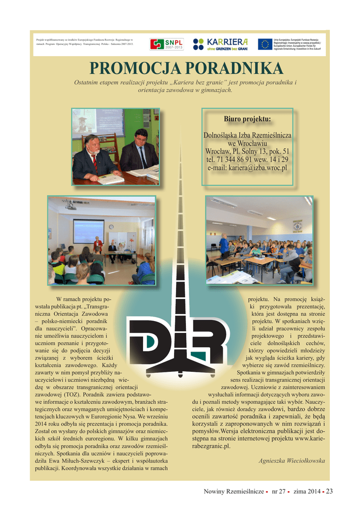Projekt współfinansowany ze środków Europejskiego Funduszu Rozwoju Regionalnego w ramach Program Operacyjny Współpracy Transgranicznej Polska – Saksonia 2007-2013. PROMOCJA PORADNIKA Ostatnim etapem realizacji projektu „Kariera bez granic” jest promocja poradnika i orientacja zawodowa w gimnazjach. Początkujący cy spotykają się i wiedzą oraz poprowadzenie firmy czonymi przedu których przebyrymi współpracuod 1 miesiąca do Pobyt ten jest nansowany przez ropejską. przedsiębior- pełnienie. Większość przedsiębiorców w y m i e n i a j ą przyjmujących jest zadowolona z taBiuro projektu: mysłami na kiej wymiany. Z całą pewnością jest to z doświad- współpraca, na której zyskuje każdy. Dolnośląska Izba Rzemieślnicza siębiorcami, Obie strony mogą odkrywać nowe rynwe Wrocławiu wają i z któ- ki europejskie, nowych partnerów bizWrocław, Pl. Solny 13, pok. 51 ją przez okres nesowych i nowe sposoby prowadzenia tel. 71 344 86 91 wew. 14 i 29 6 miesięcy. działalności. Tworza sieci kontaktów i e-mail: [email protected] częściowo fi- mogą zdecydować się na kontynuowaKomisję Eu- nie współpracy w ramach długoterminowego partnerstwa biznesowego (np. spółki joint-venture, podwykonawstwo, Ułatwia to dobry start stosunki wykonawca-dostawca, itp.). w zakładaniu własnej firmy Program „Erasmus dla młolub wzmocnieniu istniejącego dych przedsiębiorców” jest finansowany już przedsiębiorstwa. Korzy- przez Komisję Europejską i realizowaścią jest dostęp do nowych ny na terenie państw uczestniczących rynków, współpraca mię- za pośrednictwem lokalnych punktów dzynarod o w a kontaktowych, odpowiedzialnych za i powspieranie przedsiębiorców (np. izby gospodarcze, centra przedsiębiorczości, inkubatory przedsiębiorczości itp.). Ich działalność jest koordynowana na poziomie unijnym przez biuro W ramach projektu poprojektu. Na promocję książwsparcia programu. prezentację, wstała publikacja pt. „Transgraki przygotowała programie może niczna Orientacja Zawodowa która jestWdostępna na stronie uczestniczyć początkujący – polsko-niemiecki poradnik projektu. W spotkaniach wzięprzedsiębiorca, który poważnie dla nauczycieli”. Opracowali udział pracownicy zespołu nie umożliwia nauczycielom i projektowego i własnej przedstawimyśli o założeniu dziauczniom poznanie i przygotociele dolnośląskich łalności gospodarczej cechów, opartej wanie się do podjęcia decyzji którzy opowiedzieli młodzieży na wykonalnym biznes planie i związanej z wyborem ścieżki jak wygląda ścieżka kariery, gdy prowadzi działalność gospodarczą kształcenia zawodowego. Każdy wybierze się zawód rzemieślniczy. nie dłużej niż 3 lata. Przyszła dziazawarty w nim pomysł przybliży naSpotkania w gimnazjach potwierdziły łalność możetransgranicznej być prowadzona w obuczycielowi i uczniowi niezbędną wiesens realizacji orientacji rębie dowolnego sektora, a wiek nie ma dzę w obszarze transgranicznej orientacji zawodowej. Uczniowie z zainteresowaniem tencjaln e żadnego znaczenia. zawodowej (TOZ). Poradnik zawiera podstawowysłuchali informacji dotyczących wyboru zawowe informacje o kształceniu zawodowym, branżach stradu izpoznali wspomagające takispełnić wybór. przedsięNauczymożliwości współpracy partne-metody Kryteria, jakie musi tegicznych oraz wymaganych umiejętnościach i kompeciele, jak również doradcy zawo dowi, bardzo dobrze rami z zagranicy. biorca: tencjach kluczowych w Euroregionie Nysa. We wrześniu ocenili zawartość poradnika i zapewniali, będą Każdy przedsiębiorca przyjmu- posiadać zezwolenie na pobytżestały w 2014 roku odbyła się prezentacja i promocja poradnika. korzystali z zaproponowanych w nim rozwiązań i jący może zastosować w swojej firmie jednym z państw uczestniczących Został on wysłany do polskich gimnazjów oraz niemiecpomysłów.Wersja elektroniczna publikacji jest dopomysły chętnego do działania począt- - mieć konkretny projekt lub pomysł na kich szkół średnich euroregionu. W kilku gimnazjach stępna na stronie internetowej projektu www.kariekującegorzemieślprzedsiębiorcy., rabezgranic.pl. który może firmę, odzwierciedlony w biznes planie, odbyła się promocja poradnika oraz zawodów posiadaćpoprowaumiejętności lub wiedzę, której - wykazywać motywację i chęć do niczych. Spotkania dla uczniów i nauczycieli ma doświadczony przedsiębiorca, współpracy Agnieszka podczas pobytu u doświaddziła Ewa Miłuch-Szewczyk – ekspertniei współautorka Wieciołkowska publikacji. Koordynowała wszystkie działania w ramach stanowiąc tym samym doskonałe uzu- czonego przedsiębiorcy z innego pań- Nowiny Rzemieślnicze nr 27 zima 2014 23