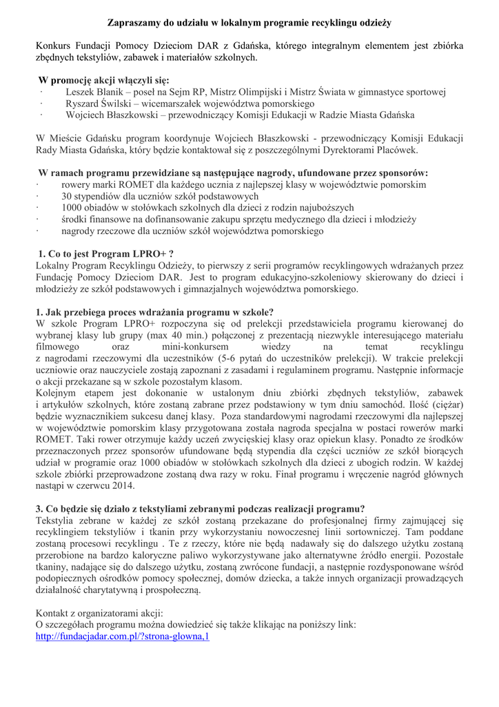 Zapraszamy do udziału w lokalnym programie recyklingu odzieży Konkurs Fundacji Pomocy Dzieciom DAR z Gdańska, którego integralnym elementem jest zbiórka zbędnych tekstyliów, zabawek i materiałów szkolnych. W promocję akcji włączyli się: · Leszek Blanik – poseł na Sejm RP, Mistrz Olimpijski i Mistrz Świata w gimnastyce sportowej · Ryszard Świlski – wicemarszałek województwa pomorskiego · Wojciech Błaszkowski – przewodniczący Komisji Edukacji w Radzie Miasta Gdańska W Mieście Gdańsku program koordynuje Wojciech Błaszkowski - przewodniczący Komisji Edukacji Rady Miasta Gdańska, który będzie kontaktował się z poszczególnymi Dyrektorami Placówek. · · · · · W ramach programu przewidziane są następujące nagrody, ufundowane przez sponsorów: rowery marki ROMET dla każdego ucznia z najlepszej klasy w województwie pomorskim 30 stypendiów dla uczniów szkół podstawowych 1000 obiadów w stołówkach szkolnych dla dzieci z rodzin najuboższych środki finansowe na dofinansowanie zakupu sprzętu medycznego dla dzieci i młodzieży nagrody rzeczowe dla uczniów szkół województwa pomorskiego 1. Co to jest Program LPRO+ ? Lokalny Program Recyklingu Odzieży, to pierwszy z serii programów recyklingowych wdrażanych przez Fundację Pomocy Dzieciom DAR. Jest to program edukacyjno-szkoleniowy skierowany do dzieci i młodzieży ze szkół podstawowych i gimnazjalnych województwa pomorskiego. 1. Jak przebiega proces wdrażania programu w szkole? W szkole Program LPRO+ rozpoczyna się od prelekcji przedstawiciela programu kierowanej do wybranej klasy lub grupy (max 40 min.) połączonej z prezentacją niezwykle interesującego materiału filmowego oraz mini-konkursem wiedzy na temat recyklingu z nagrodami rzeczowymi dla uczestników (5-6 pytań do uczestników prelekcji). W trakcie prelekcji uczniowie oraz nauczyciele zostają zapoznani z zasadami i regulaminem programu. Następnie informacje o akcji przekazane są w szkole pozostałym klasom. Kolejnym etapem jest dokonanie w ustalonym dniu zbiórki zbędnych tekstyliów, zabawek i artykułów szkolnych, które zostaną zabrane przez podstawiony w tym dniu samochód. Ilość (ciężar) będzie wyznacznikiem sukcesu danej klasy. Poza standardowymi nagrodami rzeczowymi dla najlepszej w województwie pomorskim klasy przygotowana została nagroda specjalna w postaci rowerów marki ROMET. Taki rower otrzymuje każdy uczeń zwycięskiej klasy oraz opiekun klasy. Ponadto ze środków przeznaczonych przez sponsorów ufundowane będą stypendia dla części uczniów ze szkół biorących udział w programie oraz 1000 obiadów w stołówkach szkolnych dla dzieci z ubogich rodzin. W każdej szkole zbiórki przeprowadzone zostaną dwa razy w roku. Finał programu i wręczenie nagród głównych nastąpi w czerwcu 2014. 3. Co będzie się działo z tekstyliami zebranymi podczas realizacji programu? Tekstylia zebrane w każdej ze szkół zostaną przekazane do profesjonalnej firmy zajmującej się recyklingiem tekstyliów i tkanin przy wykorzystaniu nowoczesnej linii sortowniczej. Tam poddane zostaną procesowi recyklingu . Te z rzeczy, które nie będą nadawały się do dalszego użytku zostaną przerobione na bardzo kaloryczne paliwo wykorzystywane jako alternatywne źródło energii. Pozostałe tkaniny, nadające się do dalszego użytku, zostaną zwrócone fundacji, a następnie rozdysponowane wśród podopiecznych ośrodków pomocy społecznej, domów dziecka, a także innych organizacji prowadzących działalność charytatywną i prospołeczną. Kontakt z organizatorami akcji: O szczegółach programu można dowiedzieć się także klikając na poniższy link: http://fundacjadar.com.pl/?strona-glowna,1