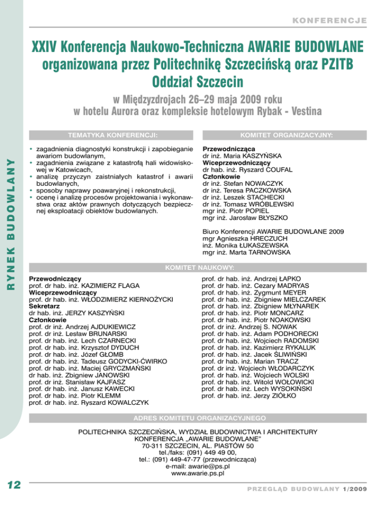 KON FEREN C J E XXIV Konferencja Naukowo-Techniczna AWARIE BUDOWLANE organizowana przez Politechnikę Szczecińską oraz PZITB Oddział Szczecin w Międzyzdrojach 26–29 maja 2009 roku w hotelu Aurora oraz kompleksie hotelowym Rybak - Vestina R YNE K BUDOWLANY TEMATYKA KONFERENCJI: KOMITET ORGANIZACYJNY: • zagadnienia diagnostyki konstrukcji i zapobieganie awariom budowlanym, • zagadnienia związane z katastrofą hali widowiskowej w Katowicach, • analizę przyczyn zaistniałych katastrof i awarii budowlanych, • sposoby naprawy poawaryjnej i rekonstrukcji, • ocenę i analizę procesów projektowania i wykonawstwa oraz aktów prawnych dotyczących bezpiecznej eksploatacji obiektów budowlanych. Przewodnicząca dr inż. Maria KASZYŃSKA Wiceprzewodniczący dr hab. inż. Ryszard COUFAL Członkowie dr inż. Stefan NOWACZYK dr inż. Teresa PACZKOWSKA dr inż. Leszek STACHECKI dr inż. Tomasz WRÓBLEWSKI mgr inż. Piotr POPIEL mgr inż. Jarosław BŁYSZKO Biuro Konferencji AWARIE BUDOWLANE 2009 mgr Agnieszka HRECZUCH inż. Monika ŁUKASZEWSKA mgr inż. Marta TARNOWSKA KOMITET NAUKOWY: Przewodniczący prof. dr hab. inż. KAZIMIERZ FLAGA Wiceprzewodniczący prof. dr hab. inż. WŁODZIMIERZ KIERNOŻYCKI Sekretarz dr hab. inż. JERZY KASZYŃSKI Członkowie prof. dr inż. Andrzej AJDUKIEWICZ prof. dr inż. Lesław BRUNARSKI prof. dr hab. inż. Lech CZARNECKI prof. dr hab. inż. Krzysztof DYDUCH prof. dr hab. inż. Józef GŁOMB prof. dr hab. inż. Tadeusz GODYCKI-ĆWIRKO prof. dr hab. inż. Maciej GRYCZMAŃSKI dr hab. inż. Zbigniew JANOWSKI prof. dr inż. Stanisław KAJFASZ prof. dr hab. inż. Janusz KAWECKI prof. dr hab. inż. Piotr KLEMM prof. dr hab. inż. Ryszard KOWALCZYK prof. dr hab. inż. Andrzej ŁAPKO prof. dr hab. inż. Cezary MADRYAS prof. dr hab. inż. Zygmunt MEYER prof. dr hab. inż. Zbigniew MIELCZAREK prof. dr hab. inż. Zbigniew MŁYNAREK prof. dr hab. inż. Piotr MONCARZ prof. dr hab. inż. Piotr NOAKOWSKI prof. dr inż. Andrzej S. NOWAK prof. dr hab. inż. Adam PODHORECKI prof. dr hab. inż. Wojciech RADOMSKI prof. dr hab. inż. Kazimierz RYKALUK prof. dr hab. inż. Jacek ŚLIWIŃSKI prof. dr hab. inż. Marian TRACZ prof. dr inż. Wojciech WŁODARCZYK prof. dr hab. inż. Wojciech WOLSKI prof. dr hab. inż. Witold WOŁOWICKI prof. dr hab. inż. Lech WYSOKIŃSKI prof. dr hab. inż. Jerzy ZIÓŁKO ADRES KOMITETU ORGANIZACYJNEGO POLITECHNIKA SZCZECIŃSKA, WYDZIAŁ BUDOWNICTWA I ARCHITEKTURY KONFERENCJA „AWARIE BUDOWLANE” 70-311 SZCZECIN, AL. PIASTÓW 50 tel./faks: (091) 449 49 00, tel.: (091) 449-47-77 (przewodnicząca) e-mail: [email protected] www.awarie.ps.pl 12 PRz eg l Ąd bu d owl any 1/2009