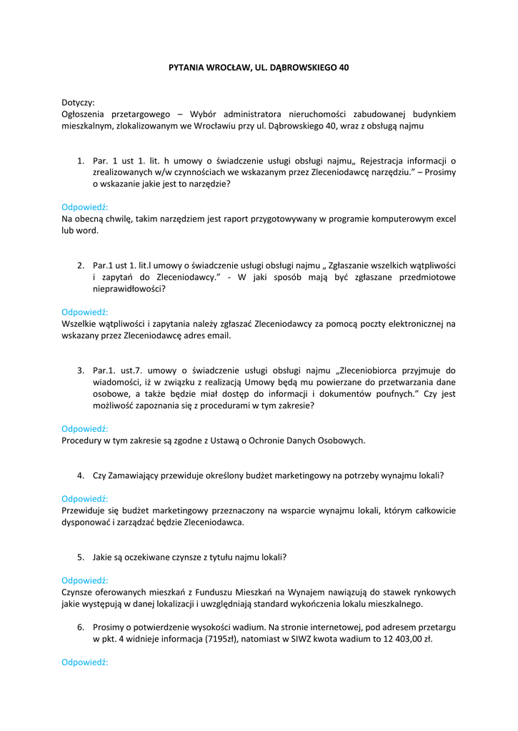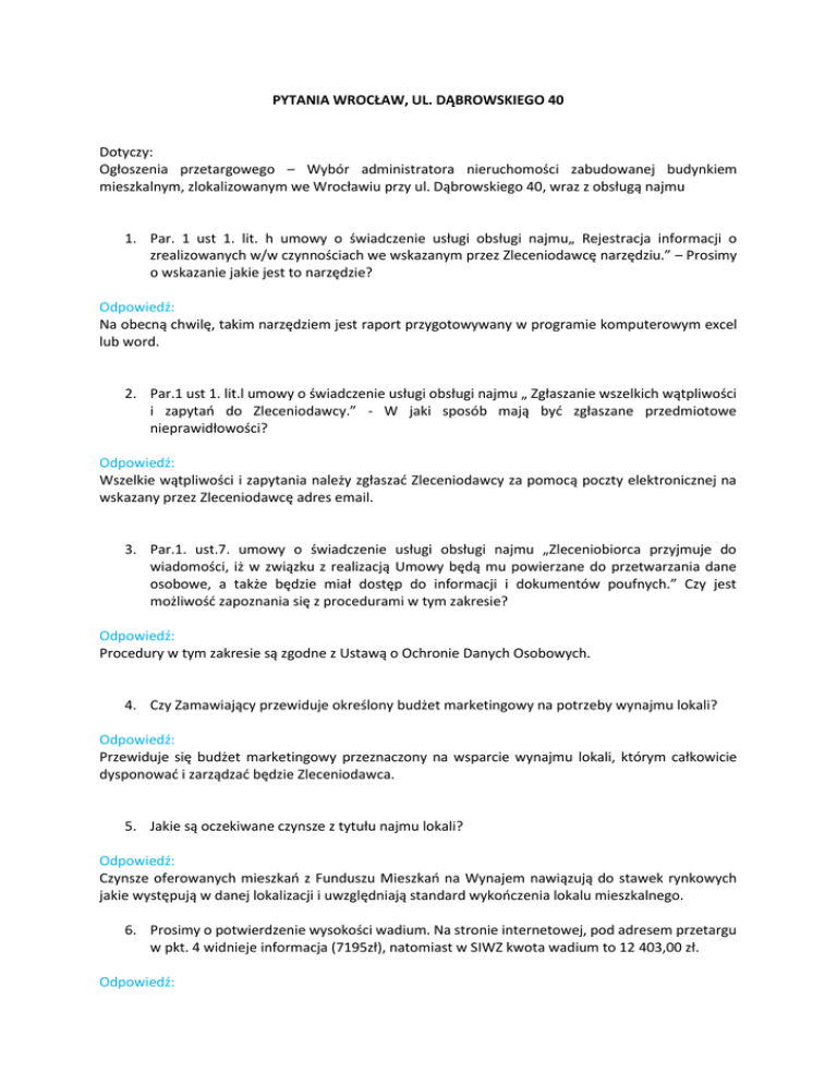 PYTANIA WROCŁAW, UL. DĄBROWSKIEGO 40 Dotyczy: Ogłoszenia przetargowego – Wybór administratora nieruchomości zabudowanej budynkiem mieszkalnym, zlokalizowanym we Wrocławiu przy ul. Dąbrowskiego 40, wraz z obsługą najmu 1. Par. 1 ust 1. lit. h umowy o świadczenie usługi obsługi najmu„ Rejestracja informacji o zrealizowanych w/w czynnościach we wskazanym przez Zleceniodawcę narzędziu.” – Prosimy o wskazanie jakie jest to narzędzie? Odpowiedź: Na obecną chwilę, takim narzędziem jest raport przygotowywany w programie komputerowym excel lub word. 2. Par.1 ust 1. lit.l umowy o świadczenie usługi obsługi najmu „ Zgłaszanie wszelkich wątpliwości i zapytań do Zleceniodawcy.” - W jaki sposób mają być zgłaszane przedmiotowe nieprawidłowości? Odpowiedź: Wszelkie wątpliwości i zapytania należy zgłaszać Zleceniodawcy za pomocą poczty elektronicznej na wskazany przez Zleceniodawcę adres email. 3. Par.1. ust.7. umowy o świadczenie usługi obsługi najmu „Zleceniobiorca przyjmuje do wiadomości, iż w związku z realizacją Umowy będą mu powierzane do przetwarzania dane osobowe, a także będzie miał dostęp do informacji i dokumentów poufnych.” Czy jest możliwość zapoznania się z procedurami w tym zakresie? Odpowiedź: Procedury w tym zakresie są zgodne z Ustawą o Ochronie Danych Osobowych. 4. Czy Zamawiający przewiduje określony budżet marketingowy na potrzeby wynajmu lokali? Odpowiedź: Przewiduje się budżet marketingowy przeznaczony na wsparcie wynajmu lokali, którym całkowicie dysponować i zarządzać będzie Zleceniodawca. 5. Jakie są oczekiwane czynsze z tytułu najmu lokali? Odpowiedź: Czynsze oferowanych mieszkań z Funduszu Mieszkań na Wynajem nawiązują do stawek rynkowych jakie występują w danej lokalizacji i uwzględniają standard wykończenia lokalu mieszkalnego. 6. Prosimy o potwierdzenie wysokości wadium. Na stronie internetowej, pod adresem przetargu w pkt. 4 widnieje informacja (7195zł), natomiast w SIWZ kwota wadium to 12 403,00 zł. Odpowiedź: Poprawna kwota to 12.403,00 zł. 7. Jakie są kryteria wyboru oferty? Czy jedynym kryterium jest cena za usługę? Jeśli nie to jakie czynniki wpływają na wybór oferty? Odpowiedź: Cena nie jest jedynym kryterium oceny oferty. Komisja bierze pod uwagę także doświadczenie oferenta w zakresie administrowania budynkami mieszkalnymi i w zakresie obsługi najmu lokali mieszkalnych i użytkowych. 8. Czy w przypadku gdy umowa na administrowanie i komercjalizację byłaby podpisana z jedną firmą to osoba zajmująca się komercjalizacją mogłaby również pełnić funkcję administratora? Czy może planują Państwo rozdzielenie tych dwóch funkcji? Odpowiedź: Nie wyklucza się możliwości łącznego pełnienia tych funkcji przez jedną osobę.