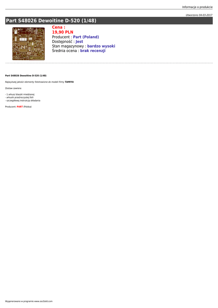 Informacje o produkcie Utworzono 04-03-2017 Part S48026 Dewoitine D-520 (1/48) Cena : 19,90 PLN Producent : Part (Poland) Dostępność : Jest Stan magazynowy : bardzo wysoki Średnia ocena : brak recenzji Part S48026 Dewoitine D-520 (1/48) Najwyższej jakości elementy fototrawione do modeli firmy TAMIYA Zestaw zawiera: - 1 arkusz blaszki miedzianej - arkusik przeźroczystej folii - szczegółową instrukcję składania Producent: PART (Polska) Wygenerowano w programie www.oscGold.com Informacje o produkcie Ważne informacje: Prosimy o dokładne zapoznanie się z zasadami działania naszego sklepu. To bardzo ważne i pozwoli na uniknięcie nieporozumień związanych z koniecznością oczekiwania na przesyłkę. Wszystkie zamówienia realizujemy w kolejności zgłoszeń. Wybranie "przesyłka priorytetowa" jako sposobu wysyłki nie oznacza, że paczka zostanie wysłana na drugi dzień. To tylko rodzaj usługi pocztowej. Firma Jadar-Model jest właścicielem dwóch sklepów. Jeden z nich to sklep internetowy, drugi zaś jest prawdziwy i mieści się w Warszawie, stolicy Polski. Te same modele i akcesoria oferowane w sklepie internetowym sprzedawane są w jednocześnie w obu sklepach. Ponieważ nasza oferta jest bardzo duża nie mamy magazynu z wielką ilością tych samych przedmiotów. Może zdarzyć się, że model, który chcesz kupić został sprzedany w drugim sklepie. Wtedy zostaniesz powiadomiony emailem, że realizacja Twojego zamówienia będzie dłuższa, ponieważ musimy uzupełnić magazyn i czekamy na dostawę od producenta. Prosimy o cierpliwość i wyrozumiałość. Nie ponosimy odpowiedzialności za różnicę w zawartości pudełka w stosunku do prezentowanego zdjęcia. Zdjęcia są zazwyczaj reklamówkami i mogą zawierać również inne części, które nie wchodzą w skład danego produktu. Wygenerowano w programie www.oscGold.com Salon Modelarski Jadar-Model Ul. Jagiellońska 58, 03-468 Warszawa (przy Pl.Hallera) tel.(0 22) 403-34-30 (w sprawie zamówień prosimy dzwonić: (0 22) 620-05-39) Tutaj jesteśmy - kliknij poniższy link: Warszawa, Jagiellońska 58 sklep jest czynny w godz.: pon.-pt. 11.oo 19.oo sobota 10.oo 14.oo Sklep modelarski Jadar-Model. Elementy waloryzujące do modeli plastikowych - PART Polska.