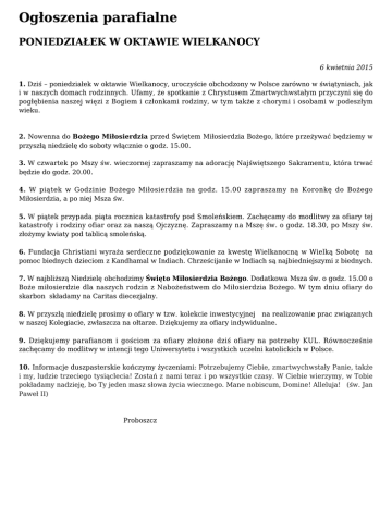 Ogłoszenia parafialne PONIEDZIAŁEK W OKTAWIE WIELKANOCY 6 kwietnia 2015 1. Dziś – poniedziałek w oktawie Wielkanocy, uroczyście obchodzony w Polsce zarówno w świątyniach, jak i w naszych domach rodzinnych. Ufamy, że spotkanie z Chrystusem Zmartwychwstałym przyczyni się do pogłębienia naszej więzi z Bogiem i członkami rodziny, w tym także z chorymi i osobami w podeszłym wieku. 2. Nowenna do Bożego Miłosierdzia przed Świętem Miłosierdzia Bożego, które przeżywać będziemy w przyszłą niedzielę do soboty włącznie o godz. 15.00. 3. W czwartek po Mszy św. wieczornej zapraszamy na adorację Najświętszego Sakramentu, która trwać będzie do godz. 20.00. 4. W piątek w Godzinie Bożego Miłosierdzia na godz. 15.00 zapraszamy na Koronkę do Bożego Miłosierdzia, a po niej Msza św. 5. W piątek przypada piąta rocznica katastrofy pod Smoleńskiem. Zachęcamy do modlitwy za ofiary tej katastrofy i rodziny ofiar oraz za naszą Ojczyznę. Zapraszamy na Mszę św. o godz. 18.30, po Mszy św. złożymy kwiaty pod tablicą smoleńską. 6. Fundacja Christiani wyraża serdeczne podziękowanie za kwestę Wielkanocną w Wielką Sobotę na pomoc biednych dzieciom z Kandhamal w Indiach. Chrześcijanie w Indiach są najbiedniejszymi z biednych. 7. W najbliższą Niedzielę obchodzimy Święto Miłosierdzia Bożego. Dodatkowa Msza św. o godz. 15.00 o Boże miłosierdzie dla naszych rodzin z Nabożeństwem do Miłosierdzia Bożego. W tym dniu ofiary do skarbon składamy na Caritas diecezjalny. 8. W przyszłą niedzielę prosimy o ofiary w tzw. kolekcie inwestycyjnej na realizowanie prac związanych w naszej Kolegiacie, zwłaszcza na ołtarze. Dziękujemy za ofiary indywidualne. 9. Dziękujemy parafianom i gościom za ofiary złożone dziś ofiary na potrzeby KUL. Równocześnie zachęcamy do modlitwy w intencji tego Uniwersytetu i wszystkich uczelni katolickich w Polsce. 10. Informacje duszpasterskie kończymy życzeniami: Potrzebujemy Ciebie, zmartwychwstały Panie, także i my, ludzie trzeciego tysiąclecia! Zostań z nami teraz i po wszystkie czasy. W Ciebie wierzymy, w Tobie pokładamy nadzieję, bo Ty jeden masz słowa życia wiecznego. Mane nobiscum, Domine! Alleluja! (św. Jan Paweł II) Proboszcz