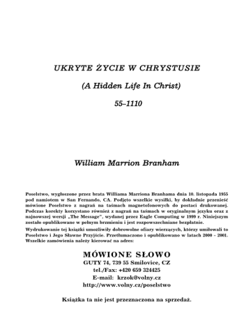 UKRYTE YCIE W CHRYSTUSIE (A Hidden Life In Christ) 55-1110 William Marrion Branham Poselstwo, wygoszone przez brata Williama Marriona Branhama dnia 10. listopada 1955 pod namiotem w San Fernando, CA. PodjŸto wszelkie wysiki, by dokadnie przenie™ø mówione Poselstwo z nagra§ na ta™mach magnetofonowych do postaci drukowanej. Podczas korekty korzystano równieŒ z nagra§ na ta™mach w oryginalnym jŸzyku oraz z najnowszej wersji .The Message”, wydanej przez Eagle Computing w 1999 r. Niniejszym zostao opublikowane w penym brzmieniu i jest rozpowszechniane bezpatnie. Wydrukowanie tej ksi3Œki umoŒliwiy dobrowolne ofiary wierz3cych, którzy umiowali to Poselstwo i Jego Sawne Przyj™cie. Przetumaczono i opublikowano w latach 2000 - 2001. Wszelkie zamówienia naleŒy kierowaø na adres: MÓWIONE S~OWO GUTY 74, 739 55 Smilovice, CZ tel./Fax: +420 659 324425 E-mail: [email protected] http://www.volny.cz/poselstwo Ksi3Œka ta nie jest przeznaczona na sprzedaŒ. 2 Ukryte Œycie w Chrystusie Ja^ (Czy siŸ to zgadza, bracie?)^ Ilu z was cieszy siŸ z tych _ widzc tych ™piewaków? Pozwólcie zobaczyø wasze rŸce. Moi drodzy, ja wiem, Œe wszyscy siŸ cieszymy. I to jest po prostu fajne. Ja go po prostu lubiŸ s,uchaø. My™lŸ, Œe on jest wspania,y _ obydwaj. W porzdku, bracie Ekberg. [Brat mówi kilka uwag przed ™piewaniem 1Delikatnie czuwa On nad tob” i sk,ada ™wiadectwo _ wyd.] Amen. Niech ci Bóg b,ogos,awi, bracie Einar Ekberg, to by,o^?^ Te rzeczy nie dziej siŸ po prostu przypadkowo. Jest potrzebny Bóg, aby siŸ to dzia,o, nieprawdaŒ? Gdyby Bóg nie by, z naszym bratem, to by nam nie za™piewa, tutaj dzisiaj wieczorem. Lecz jak on powiedzia,, wszystko jest w BoŒym planie. On to po prostu jako™ wszystko zaplanowa, i On chce, Œeby™my tylko polegali na Nim tak, jak dzieci polegaj na swoich rodzicach. A On to zawsze urzeczywistnia. I ja jestem tak szczŸ™liwy, Œe On to uczyni,, bowiem ci _ brat Waermo i brat Ekberg _ obaj udzielaj mi naprawdŸ inspiracji w moim Œyciu _ ich ™piewanie. 2 Tam w ich piŸknym kraju, w Szwecji, skd oni przyszli _ przed kilkoma laty by,em tam na kampanii ewangelizacyjnej i jak cudownie Pan pob,ogos,awi, w wielkich naboŒe§stwach. Na drugiej stronie _ w Finlandii, gdzie w,a™nie byli™my, zosta, wskrzeszony martwy ch,opiec i to roznios,o siŸ po ca,ym tamtejszym kraju. PrzeŒywali™my tam po prostu wspania,e chwile. Mam nadziejŸ, Œe tam kiedy™ powrócŸ i odwiedzŸ tych mi,ych przyjació, w Szwecji i naszych mi,ych tam za morzem. Pewnego dnia wzbijemy siŸ na skrzyd,ach duŒego Pstrokatego Ptaka i wyldujemy na takim miejscu, z którego juŒ nie bŸdziemy musieli wróciø. Czy siŸ to zgadza? Wygldamy tŸsknie tego czasu. 3 Obecnie, kiedy dni up,ywaj, nasze^ Spodziewamy siŸ, Œe ilo™ø naszych s,uchaczy wzro™nie do tego stopnia, Œe rozpoczniemy nasze naboŒe§stwa uzdrowieniowe. W,a™nie przybyli™my tutaj _ trochŸ odskoczyli™my w nocy tutaj na to naboŒe§stwo, a oni rozbili tutaj nasz namiot. Brat Arganbright i inny brat, który w,a™nie odszed, z platformy^ Nie mogŸ sobie w tej chwili przypomnieø jego nazwiska. [Brat mówi: 1Mendenhall” _ wyd.] Mendenhall. A inni^ i oni^ Po prostu rozbili™my namiot tutaj. Zaplanowali™my to w ubieg,ym roku, kiedy byli™my w 1 UKRYTE IYCIE W CHRYSTUSIE 3 Niemczech. My™lŸ, Œe spotka,em brata _ u™cisn, mi d,o§ przed chwil _ który przet,umaczy, jedn z moich ksiŒek do jŸzyka niemieckiego. I my sobie to naprawdŸ cenimy, mój drogi bracie. 4 I oczywi™cie, byli™my gorco witani w™ród Niemców. MuszŸ równieŒ co™ powiedzieø o Niemczech. Moja Œona jest Niemk, wiŸc muszŸ byø trochŸ ostroŒny. Ja jestem Irlandczykiem, wiŸc musia,em siŸ oŒeniø z Niemk, by siŸ zachowywaø choø trochŸ powaŒnie, wiecie, wiŸc^ Cieszyli™my siŸ wiŸc niezmiernie z naszych naboŒe§stw, które tam mieli™my, a Pan nas b,ogos,awi,. Udali™my siŸ równieŒ do Szwajcarii. Jest to jakby czŸ™ø Niemiec. My™lŸ, Œe tam mówi tym samym jŸzykiem. A wiŸc my^ Mieli tam kilka wspania,ych spraw, które Pan uczyni, dla nas _ my™lŸ, Œe piŸødziesit tysiŸcy dusz by,o pozyskanych w cigu dziesiŸciu wieczorów. Powrócili™my do Niemiec z Lousanne i kolejnych piŸødziesit tysiŸcy dusz pozyskali™my dla Chrystusa. Nie wiem, co jest z Ameryk. Czasami zastanawiam siŸ po prostu nad tym. Wyglda na to, Œe inne narody wystpi teraz na widowniŸ, zanim siŸ spostrzeŒemy, i wejd, aby zosta,y zebrane pierwociny z tego. 5 Ja g,oszŸ dalej, aŒ ilo™ø naszych s,uchaczy wzro™nie na tyle, by™my mogli urzdziø naboŒe§stwo uzdrowieniowe. Moja us,uga wyczerpuje mnie bardzo, poniewaŒ ogldam wizje. A w wiŸkszo™ci wypadków jest to imponujce uzdrawianie. Widzia,em wielokrotnie, jak siedzia,o tam tysice ludzi, a w ca,ym tym t,umie nie pozosta, nikt s,aby. Rozumiecie? I jest to^ Chcieliby™my, kiedy bŸdziemy mieø te naboŒe§stwa, je™li to^ nie jeŒeli my^ Mia,em juŒ naboŒe§stwo uzdrowieniowe, na którym by,a jedna chora osoba. To nie ma znaczenia. Lecz pragniemy po prostu zajø kilka wieczorów, by przemawiaø. I ja dok,ada,em wszelkich stara§, by przynie™ø ludziom to, czego im dzisiaj moim zdaniem najwiŸcej potrzeba. Nie jestem nauczycielem. Nie jestem teŒ teologiem. Nie mam Œadnego wykszta,cenia, lecz czasami _ ja^ MoŒe to powiem tak: Nie wiem zbyt wiele o tej KsiŸdze, lecz znam naprawdŸ dobrze jej Autora. WiŸc to jest^ PragnŸ byø zapoznany z Nim, wiecie. A wiŸc ja, czynic tak, próbujŸ przed,oŒyø co™ ku (polepszeniu) zbudowaniu. 6 UwaŒam, po tym gdy widzia,em, jak Ameryka mia,a tyle wielkich sposobno™ci dla przebudzenia, Œe pomimo to staje siŸ jednak coraz gorsza. WiŸc to mnie alarmuje. Jest to mój kraj i ja siŸ tutaj 4 MÓWIONE S~OWO urodzi,em, i ja go kocham. PragnŸ wiŸc ogldaø wielkie przebudzenie w moim czasie _ o ile to moŒliwe. OtóŒ, ja nie mogŸ przynie™ø tego wielkiego przebudzenia; Œaden kaznodzieja nie moŒe. Lecz mo