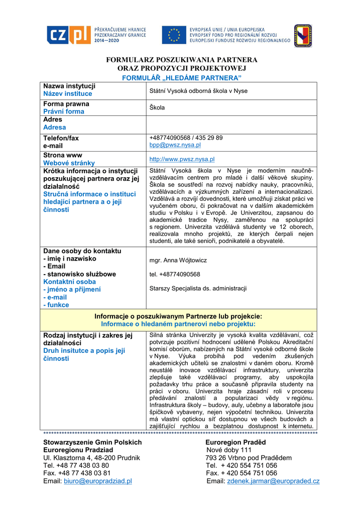 FORMULARZ POSZUKIWANIA PARTNERA ORAZ PROPOZYCJI PROJEKTOWEJ FORMULÁŘ „HLEDÁME PARTNERA” Nazwa instytucji Název instituce Forma prawna Právní forma Adres Adresa Telefon/fax e-mail Strona www Webové stránky Krótka informacja o instytucji poszukującej partnera oraz jej działalność Stručná informace o instituci hledající partnera a o její činnosti Dane osoby do kontaktu - imię i nazwisko - Email - stanowisko służbowe Kontaktní osoba - jméno a příjmení - e-mail - funkce Státní Vysoká odborná škola v Nyse Škola +48774090568 / 435 29 89 [email protected] http://www.pwsz.nysa.pl Státní Vysoká škola v Nyse je moderním naučněvzdělávacím centrem pro mladé i další věkové skupiny. Škola se soustředí na rozvoj nabídky nauky, pracovníků, vzdělávacích a výzkumných zařízení a internacionalizaci. Vzdělává a rozvíjí dovednosti, které umožňuji získat práci ve vyučeném oboru, či pokračovat na v dalším akademickém studiu v Polsku i v Evropě. Je Univerzitou, zapsanou do akademické tradice Nysy, zaměřenou na spolupráci s regionem. Univerzita vzdělává studenty ve 12 oborech, realizovala mnoho projektů, ze kterých čerpali nejen studenti, ale také senioři, podnikatelé a obyvatelé. mgr. Anna Wójtowicz tel. +48774090568 Starszy Specjalista ds. administracji Informacje o poszukiwanym Partnerze lub projekcie: Informace o hledaném partnerovi nebo projektu: Rodzaj instytucji i zakres jej działalności Druh insitutce a popis její činnosti Silná stránka Univerzity je vysoká kvalita vzdělávaní, což potvrzuje pozitivní hodnocení udělené Polskou Akreditační komisí oborům, nabízených na Státní vysoké odborné škole v Nyse. Výuka probíhá pod vedením zkušených akademických učitelů se znalostmi v daném oboru. Kromě neustálé inovace vzdělávací infrastruktury, univerzita zlepšuje také vzdělávací programy, aby uspokojila požadavky trhu práce a současně připravila studenty na práci v oboru. Univerzita hraje zásadní roli v procesu předávání znalostí a popularizaci vědy v regiónu. Infrastruktura školy – budovy, auly, učebny a laboratoře jsou špičkově vybaveny, nejen výpočetní technikou. Univerzita má vlastní optickou síť dostupnou ve všech budovách a zajišťující rychlou a bezplatnou dostupnost k internetu. ********************************************************************************************************* Stowarzyszenie Gmin Polskich Euroregion Praděd Euroregionu Pradziad Nové doby 111 Ul. Klasztorna 4, 48-200 Prudnik 793 26 Vrbno pod Pradědem Tel. +48 77 438 03 80 Tel. + 420 554 751 056 Fax. +48 77 438 03 81 Fax. + 420 554 751 056 Email: [email protected] Email: [email protected] Univerzita po dobu působení zrealizovala desítky projektů, spolufinancovaných z fondů EU. Planowany zakres współpracy z zagranicznym partnerem: Plánovaný rozsah spolupráce se zahraničním partnerem: Miejsce realizacji projektu:* Místo realizace projektu:* Termin realizacji projektu.* Termín realizace projektu:* Krótki opis propozycji projektowej:* Stručný popis projektového záměru:* Cele i efekty projektu: * Cíle a přínosy projektu:* Wstępny szacunek i charakterystyka kosztów (osobowe, rzeczowe, inwestycyjne – konkretny opis):* Předběžný odhad a charakteristika nákladů (personální, režijní, investiční – krátký popis):* Stan przygotowania projektu:* Stav přípravy projektu:* typ projektu B, C Nysa 2016-2017 Univerzita hledá partnera pro realizaci projektu, ve kterém využije své vědomosti a zkušenosti získané z řady projektů a znalosti oborů nabízených studentům. Projektové návrhy se mohou týkat témat z oborů: architektury, vnitřní bezpečnosti, výživy, filologie, financí a účetnictví, jazzu a populární hudby, kosmetologie, zdravotnických a záchranných služeb, provozem a inženýrskou produkcí, psychického a tělesného vývoje člověka, s ohledem na mezinárodní aspekt. Navázaní dlouhodobé spolupráce, výměna zkušeností mezi partnery, výměna zaměstanců a studentů, vzájemné návštěvy. Podle společného projektu a možnostech daného typu projektu Plánovaný *wypełnia się w przypadku, gdy poszukiwany jest partner ze strony czeskiej/polskiej do konkretnego mikroprojektu * vyplňte v případě, že předpokládáte zapojení hledaného partnera do konkrétního mikroprojektu Wyrażamy zgodę na zamieszczenie przez Euroregion Pradziad powyższych informacji na stronach Internetowych: www.europradziad.pl, www.europraded.cz oraz przeprowadzenia innych działań mających na celu znalezienia partnera. Uděluji souhlas se zveřejněním výše uvedených informací na webových stránkách Euroregionu Praděd: www.europraded.cz, www.europradziad.pl, a s dalšími činnostmi zaměřenými na hledání partnera. ********************************************************************************************************* Stowarzyszenie Gmin Polskich Euroregion Praděd Euroregionu Pradziad Nové doby 111 Ul. Klasztorna 4, 48-200 Prudnik 793 26 Vrbno pod Pradědem Tel. +48 77 438 03 80 Tel. + 420 554 751 056 Fax. +48 77 438 03 81 Fax. + 420 554 751 056 Email: [email protected] Email: [email protected]