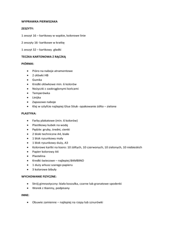 WYPRAWKA PIERWSZAKA ZESZYTY: 1 zeszyt 16 – kartkowy w wąskie, kolorowe linie 2 zeszyty 16- kartkowe w kratkę 1 zeszyt 32 – kartkowy gładki TECZKA KARTONOWA Z RĄCZKĄ PIÓRNIK: Pióro na naboje atramentowe 2 ołówki HB Gumka Kredki ołówkowe min. 6 kolorów Nożyczki z zaokrąglonymi końcami Temperówka Linijka Zapasowe naboje Klej w sztyfcie najlepiej Glue Stiuk- opakowanie żółto – zielone PLASTYKA: Farby plakatowe (min. 6 kolorów) Plastikowy kubek na wodę Pędzle: gruby, średni, cienki 2 bloki techniczne A4, białe 1 blok rysunkowy mały 1 blok rysunkowy duży, A3 Kolorowe kartki na ksero: 10 żółtych, 10 czerwonych, 10 zielonych, 10 niebieskich Papier kolorowy A4 Plastelina Kredki świecowe – najlepiej BAMBINO 1 duży arkusz szarego papieru 3 kolorowe bibuły WYCHOWANIE FIZYCZNE: Strój gimnastyczny: biała koszulka, czarne lub granatowe spodenki Worek z tkaniny, podpisany INNE: Obuwie zamienne – najlepiej na rzepy lub sznurówki