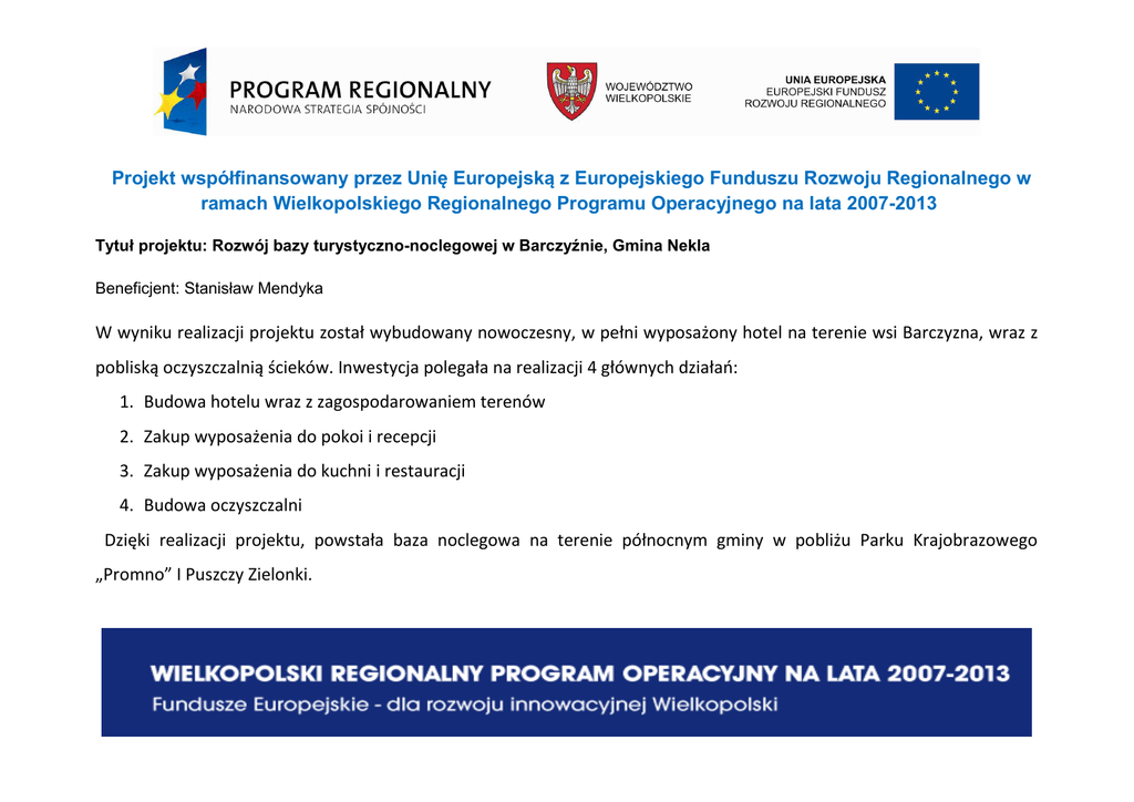 Projekt współfinansowany przez Unię Europejską z Europejskiego Funduszu Rozwoju Regionalnego w ramach Wielkopolskiego Regionalnego Programu Operacyjnego na lata 2007-2013 Tytuł projektu: Rozwój bazy turystyczno-noclegowej w Barczyźnie, Gmina Nekla Beneficjent: Stanisław Mendyka W wyniku realizacji projektu został wybudowany nowoczesny, w pełni wyposażony hotel na terenie wsi Barczyzna, wraz z pobliską oczyszczalnią ścieków. Inwestycja polegała na realizacji 4 głównych działań: 1. Budowa hotelu wraz z zagospodarowaniem terenów 2. Zakup wyposażenia do pokoi i recepcji 3. Zakup wyposażenia do kuchni i restauracji 4. Budowa oczyszczalni Dzięki realizacji projektu, powstała baza noclegowa na terenie północnym gminy w pobliżu Parku Krajobrazowego „Promno” I Puszczy Zielonki.