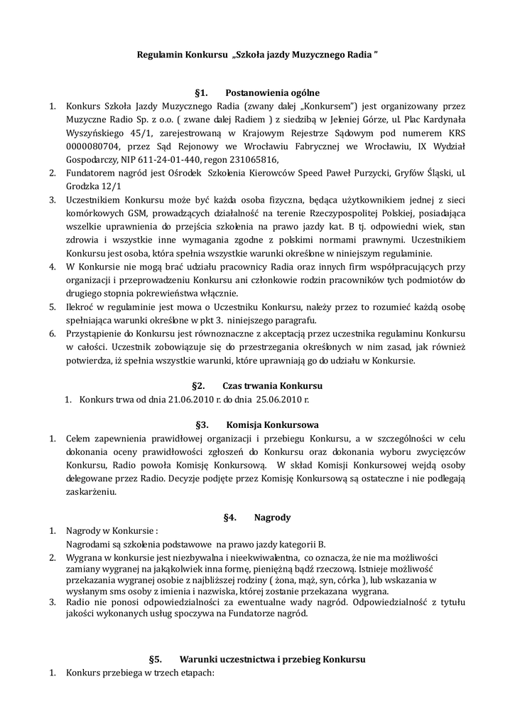 Regulamin Konkursu „Szkoła jazdy Muzycznego Radia ” 1. 2. 3. 4. 5. 6. §1. Postanowienia ogólne Konkurs Szkoła Jazdy Muzycznego Radia (zwany dalej „Konkursem”) jest organizowany przez Muzyczne Radio Sp. z o.o. ( zwane dalej Radiem ) z siedzibą w Jeleniej Górze, ul. Plac Kardynała Wyszyńskiego 45/1, zarejestrowaną w Krajowym Rejestrze Sądowym pod numerem KRS 0000080704, przez Sąd Rejonowy we Wrocławiu Fabrycznej we Wrocławiu, IX Wydział Gospodarczy, NIP 611-24-01-440, regon 231065816, Fundatorem nagród jest Ośrodek Szkolenia Kierowców Speed Paweł Purzycki, Gryfów Śląski, ul. Grodzka 12/1 Uczestnikiem Konkursu może być każda osoba fizyczna, będąca użytkownikiem jednej z sieci komórkowych GSM, prowadzących działalność na terenie Rzeczypospolitej Polskiej, posiadająca wszelkie uprawnienia do przejścia szkolenia na prawo jazdy kat. B tj. odpowiedni wiek, stan zdrowia i wszystkie inne wymagania zgodne z polskimi normami prawnymi. Uczestnikiem Konkursu jest osoba, która spełnia wszystkie warunki określone w niniejszym regulaminie. W Konkursie nie mogą brać udziału pracownicy Radia oraz innych firm współpracujących przy organizacji i przeprowadzeniu Konkursu ani członkowie rodzin pracowników tych podmiotów do drugiego stopnia pokrewieństwa włącznie. Ilekroć w regulaminie jest mowa o Uczestniku Konkursu, należy przez to rozumieć każdą osobę spełniająca warunki określone w pkt 3. niniejszego paragrafu. Przystąpienie do Konkursu jest równoznaczne z akceptacją przez uczestnika regulaminu Konkursu w całości. Uczestnik zobowiązuje się do przestrzegania określonych w nim zasad, jak również potwierdza, iż spełnia wszystkie warunki, które uprawniają go do udziału w Konkursie. §2. Czas trwania Konkursu 1. Konkurs trwa od dnia 21.06.2010 r. do dnia 25.06.2010 r. 1. §3. Komisja Konkursowa Celem zapewnienia prawidłowej organizacji i przebiegu Konkursu, a w szczególności w celu dokonania oceny prawidłowości zgłoszeń do Konkursu oraz dokonania wyboru zwycięzców Konkursu, Radio powoła Komisję Konkursową. W skład Komisji Konkursowej wejdą osoby delegowane przez Radio. Decyzje podjęte przez Komisję Konkursową są ostateczne i nie podlegają zaskarżeniu. §4. 1. 2. 3. 1. Nagrody Nagrody w Konkursie : Nagrodami są szkolenia podstawowe na prawo jazdy kategorii B. Wygrana w konkursie jest niezbywalna i nieekwiwalentna, co oznacza, że nie ma możliwości zamiany wygranej na jakąkolwiek inna formę, pieniężną bądź rzeczową. Istnieje możliwość przekazania wygranej osobie z najbliższej rodziny ( żona, mąż, syn, córka ), lub wskazania w wysłanym sms osoby z imienia i nazwiska, której zostanie przekazana wygrana. Radio nie ponosi odpowiedzialności za ewentualne wady nagród. Odpowiedzialność z tytułu jakości wykonanych usług spoczywa na Fundatorze nagród. §5. Warunki uczestnictwa i przebieg Konkursu Konkurs przebiega w trzech etapach: a) zgłaszania chęci udziału w Konkursie, zgłaszanie – wysłanie SMS na numer 72898 w treści którego należy wpisać słowa kluczowe, które otrzymuje brzmienie - „prawko”, oraz swoje imię i nazwę miejscowości w której mieszkasz Treść takiego SMSa (zgłoszenia) nie powinna przekroczyć 160 znaków włącznie ze spacjami (1 wiadomość SMS). Wysłanie SMS’a o treści opisanej w niniejszym punkcie regulaminu powoduje przystąpienie do Konkursu. b) eliminacji uczestników do finału, eliminacje - codzienne wyłanianie uczestników Konkursu do finału poprzez losowanie przez prowadzącego w systemie SMS’owym pod nadzorem Komisji Konkursowej c) finału Konkursu i wygranie nagrody finał – wejścia antenowe z uczestnikami Konkursu wyłonionymi w drodze eliminacji, w których mają oni szansę na wygranie nagrody. Wejścia antenowe odbywają się w programie południowym ( od godz. 06.00 do 14.00) w dniach wskazanych w paragrafie 2. 1.a. Uczestnik zgłasza chęć wzięcia udziału w Konkursie poprzez wysłanie pod numer 72898 wiadomości SMS (dalej „SMS”), w treści której wpisze podane na antenie Radia słowa kluczowe. Zgłoszenie nie zawierające poprawnie wpisanych słów kluczowych jest nieważne. Wielkość liter wpisywanych w treści SMS nie ma znaczenia. 1.b. Poprzez eliminację rozumie się losowanie spośród nadesłanych zgłoszeń jednego numeru telefonu, z którym następnie nawiązywane jest połączenie telefoniczne ze studia emisyjnego Radia. Losowania odbywają się pod nadzorem Komisji Konkursowej przy wykorzystaniu panelu internetowego operatora systemu SMS, firmy Bild Presse sp. z o.o. obsługującego Konkurs. 1.c.W celu uzyskania połączenia z uczestnikiem prowadzący wybierze wylosowany numer na aparacie telefonicznym, po czym będzie oczekiwał za każdym razem 30 sekund od usłyszenia pierwszego sygnału. Oczekiwanie odbywa się na antenie i jest słyszalne w eterze. Jeżeli uczestnik odbierze telefon, spełnia warunki regulaminu i rozpocznie rozmowę z prowadzącym wypowiadając jako pierwsze słowo bazowe, wskazane przez prowadzącego program w danym dniu, wygrywa nagrodę. Jeśli Uczestnik rozpocznie wypowiedź innym słowem niż bazowe nie wygrywa nagrody. W przypadku, gdy z wylosowanym uczestnikiem nie będzie można uzyskać połączenia to traci on prawo do gry o nagrodę, a prowadzący program ponowi procedurę dokonując kolejnego losowania z listy wszystkich uczestników Konkursu. Jeżeli 5 kolejno wylosowanych osób nie będzie spełniać warunków regulaminu Konkursu bądź nie będzie możliwe uzyskanie z nimi połączenia z uwagi na przyczyny określone poniżej, to dalsze próby ustalenia zwycięzcy nie będą podejmowane, a nagroda pozostanie do dyspozycji Radia. Kolejne losowania będą odbywały się w odstępach czasu nie większych niż 10 minut. Przez nieudaną próbę połączenia należy rozumieć: nieodbieranie połączenia przez co najmniej 30 sekund od pierwszego sygnału, włączenie się poczty g